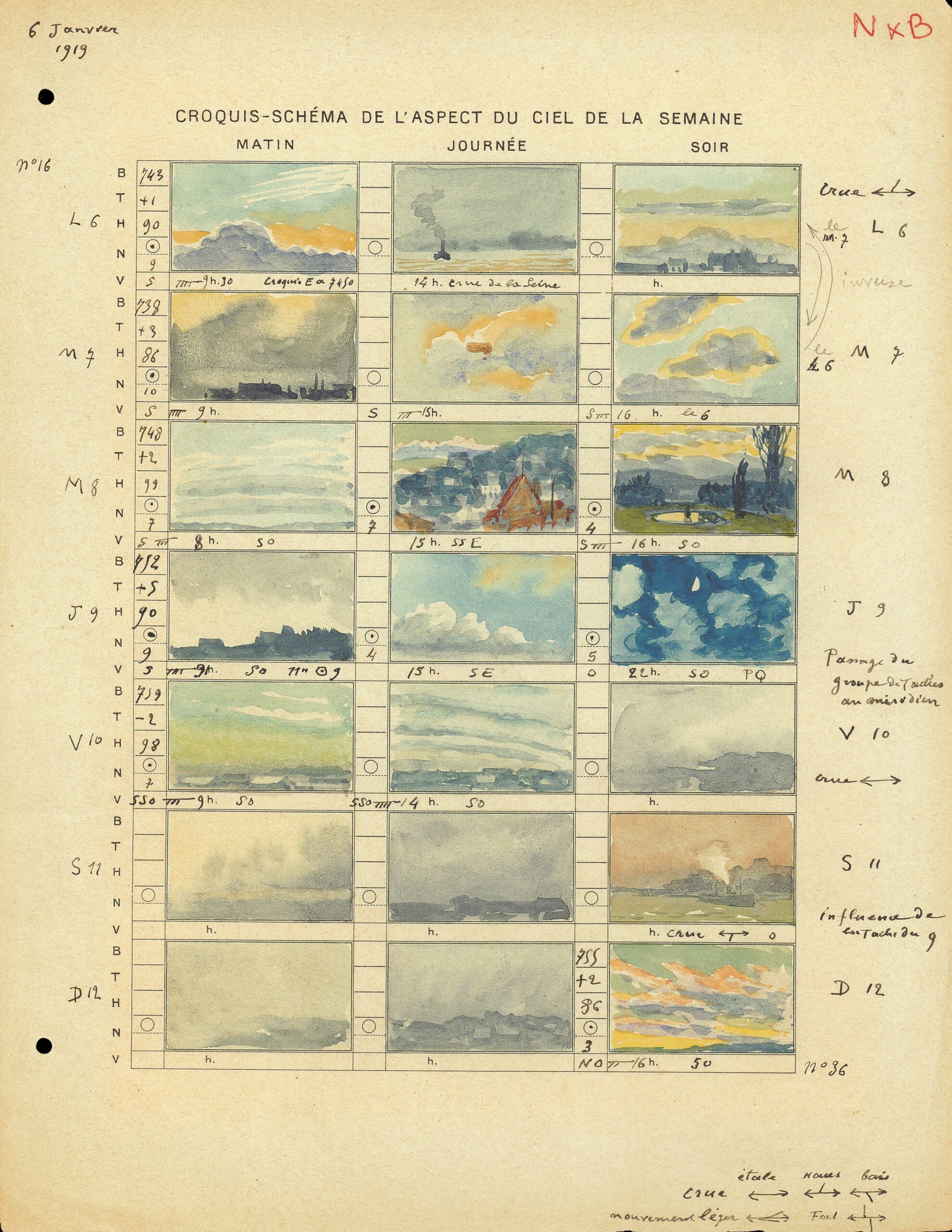 André des Gachons, Sketches of the sky over the course of a week, 6–12 January 1919. © André des Gachons – Collection Météo-France, A00147.