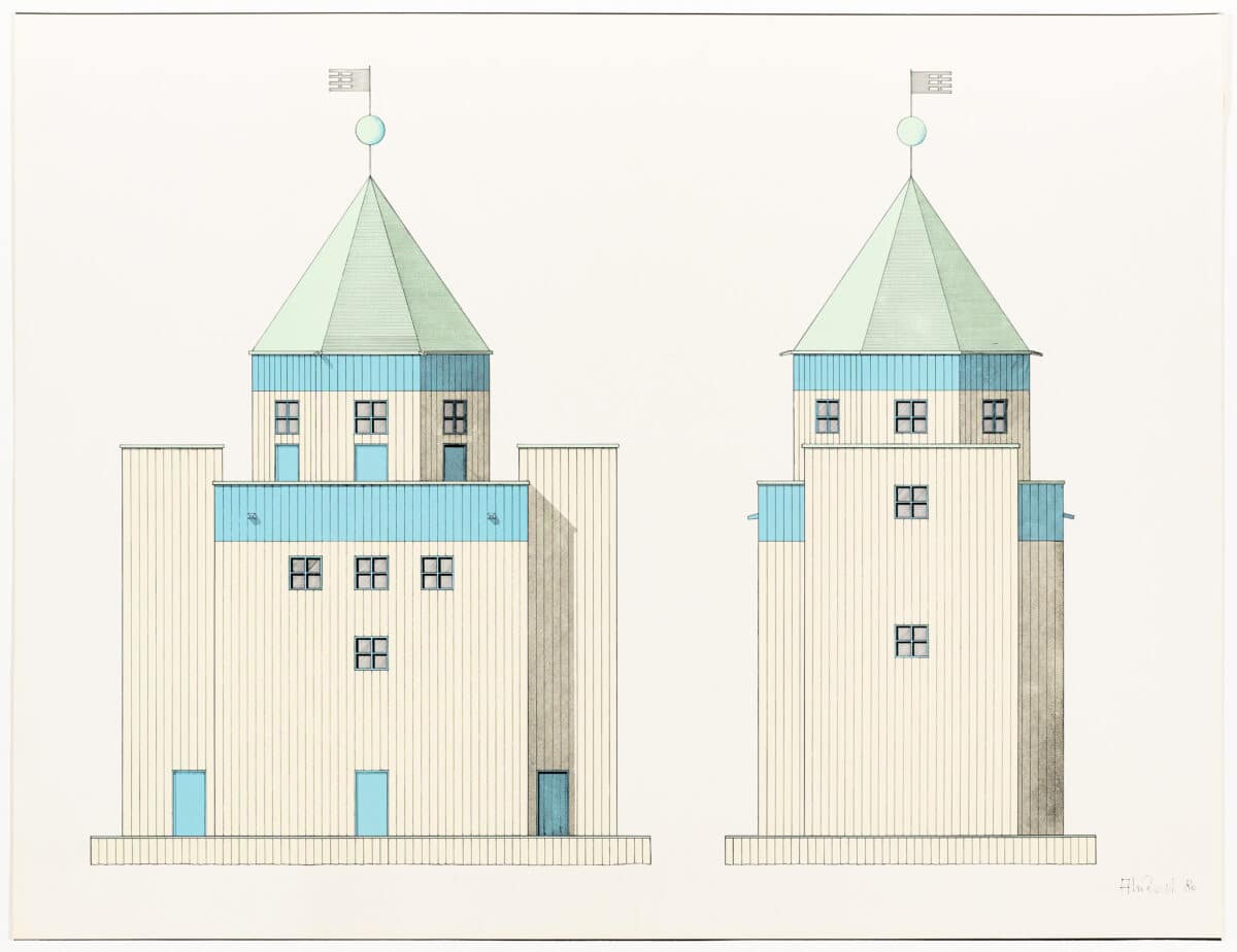 Drawing Matter holds two works related to the Teatro del mondo. First, a colour serigraph from 1980 of two paired elevations. Second, a colour print from 1981 in the form of a ‘still life’. The print imagines a collage of the city’s towers with a brick ziggurat and purist glass container, nestled next to an adapted Teatro del mondo. Rossi plays with the scale of the theatre, both a monumental structure on the horizon of the sea, and a set of building blocks sitting on a table amongst his pencils, cigarette packets, and coke cans.