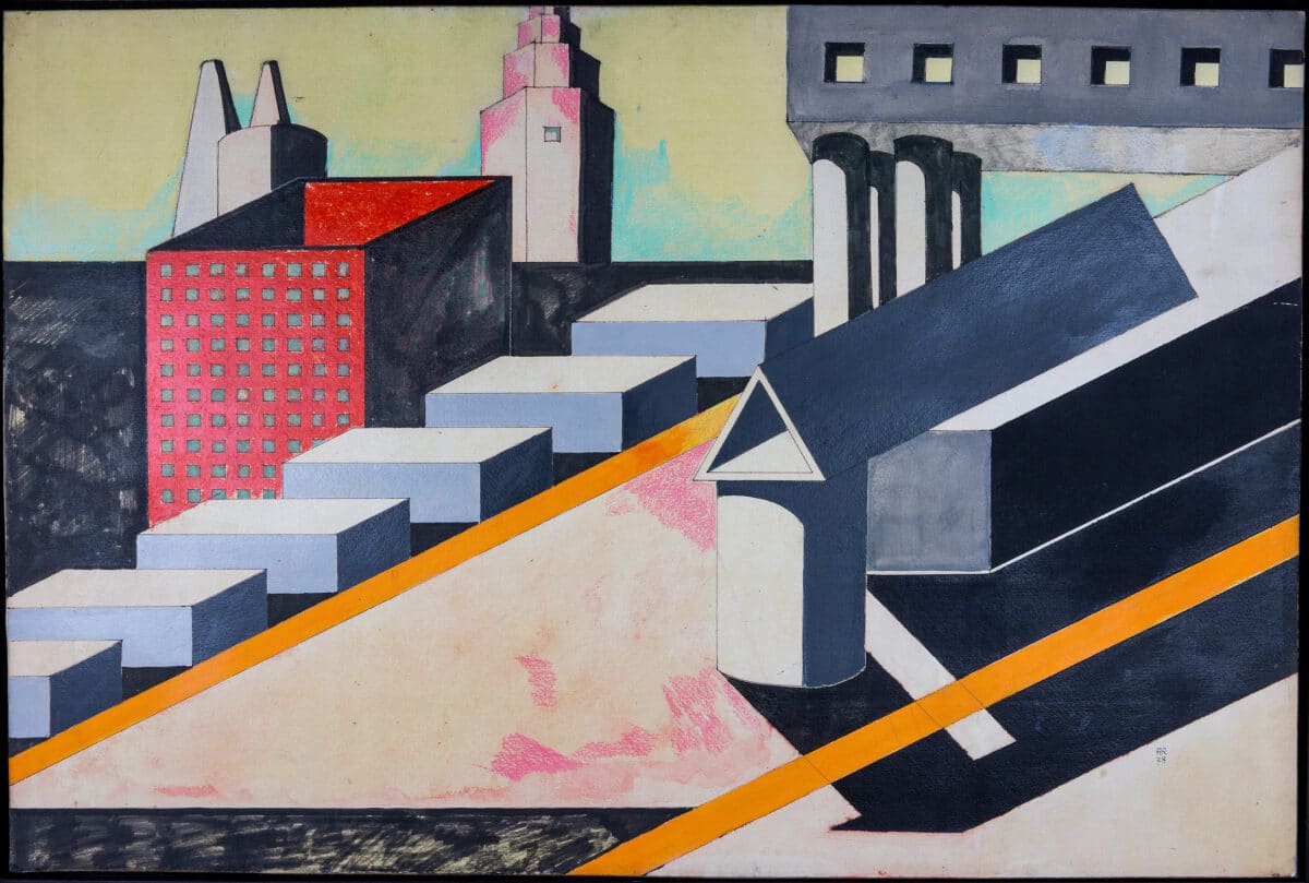 Several original versions in softer tones appear in other collections, notably in the Deutsches Architekturmuseum, which holds the primary corpus for the project. The framed original can be seen in Luigi Ghirri’s photographs (1988) of Rossi’s studio on Via Maddalena. This revisited version, in the Drawing Matter Collection, was painted in vivid colours directly from the tube by Rossi’s intern Jesse Reiser, who had studied at the Cooper Union under John Hejduk, and met Rossi during his time there.