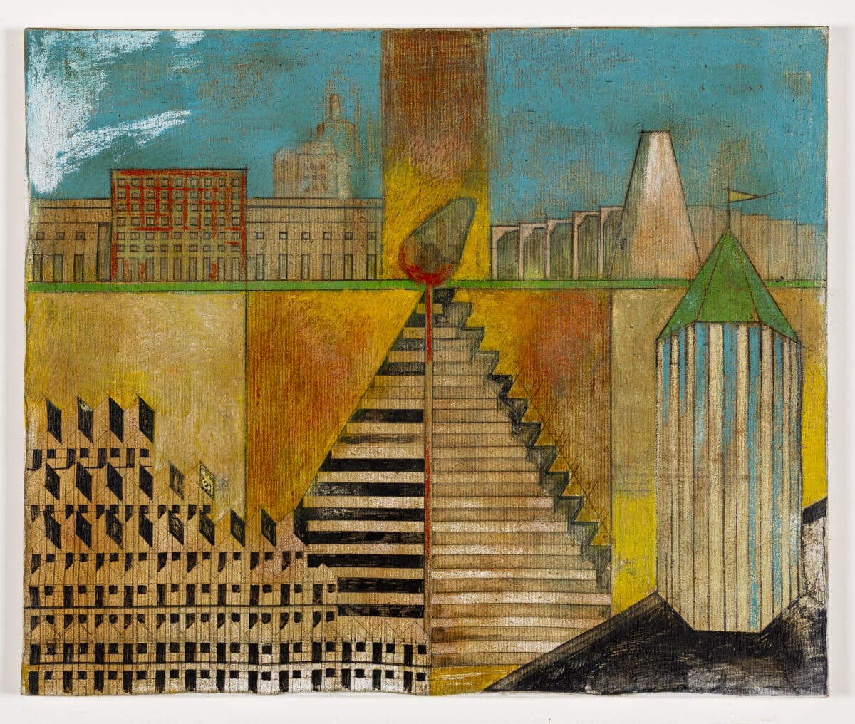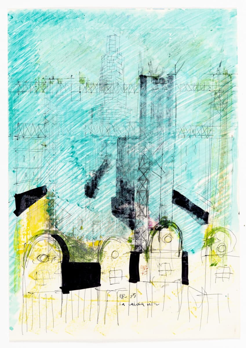 DMC 3583 entitled ‘Alcuni miei progetti con paesaggio urbano, palma dello zucchero, e uomo alla finestra’ (‘Some of my projects with urban landscape, sugar cane, and man at a window’), depicts amongst stepped towers, San Cataldo, Gallaratese, the Segrate monument. In the foreground is a circular structure with a turreted roof, door and square window; standing in the window is a small unidentifiable figure. For Rossi the window represents an ambiguous line between private and public space, interior and exterior, implementing them into his drawings to instill a sense of unification or separation.