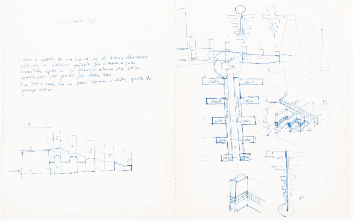 Two sheets taken from early sketchbooks with conceptual studies for a proposed museum. The drawing is dated ‘S. Stefano, 1969’ (26 December) and Rossi provides a short note explaining the arrangement of rooms in his design.