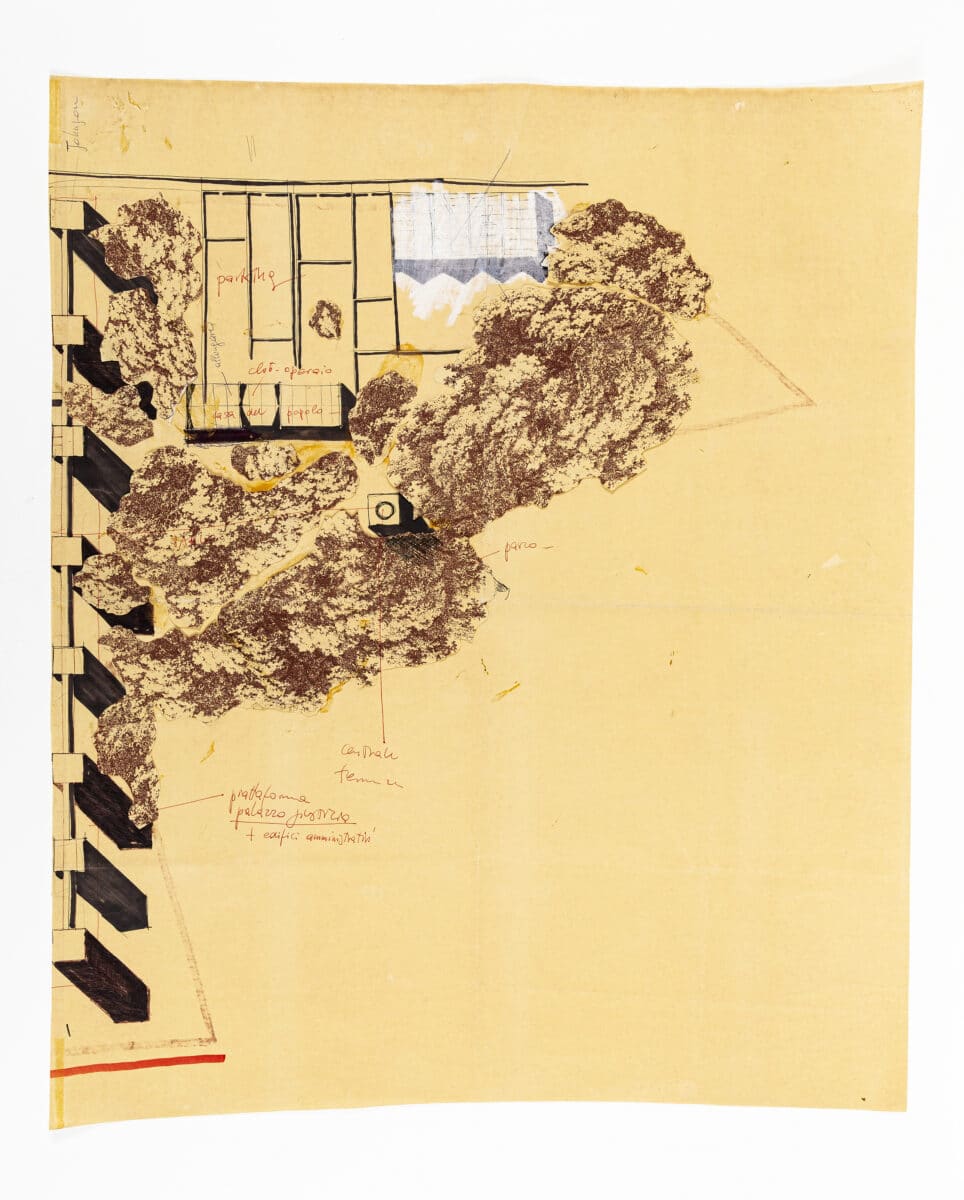 A large coloured collage on a photocopy base of a proposed business centre in the west of Florence. The drawing is littered with annotations and sketches by multiple hands, perhaps a drawing at the centre of a conversation between his collaborators Gianni Braghieri and Carlo Aymonino. The notes are predominantly regarding the programming of spaces, from shops, parks, a ‘people’s palace’, administration spaces, parking and residences, to a museum. At the bottom of DMC 2344.1 Rossi writes, ‘scala 1/1000, reticolo funzioni varie, (partiti, cultura, sindacati) + (ristoranti, clubs, ecc.)’ (scale 1/1000, various functions grid, (political parties, culture, trade unions) + (restaurants, clubs, etc).