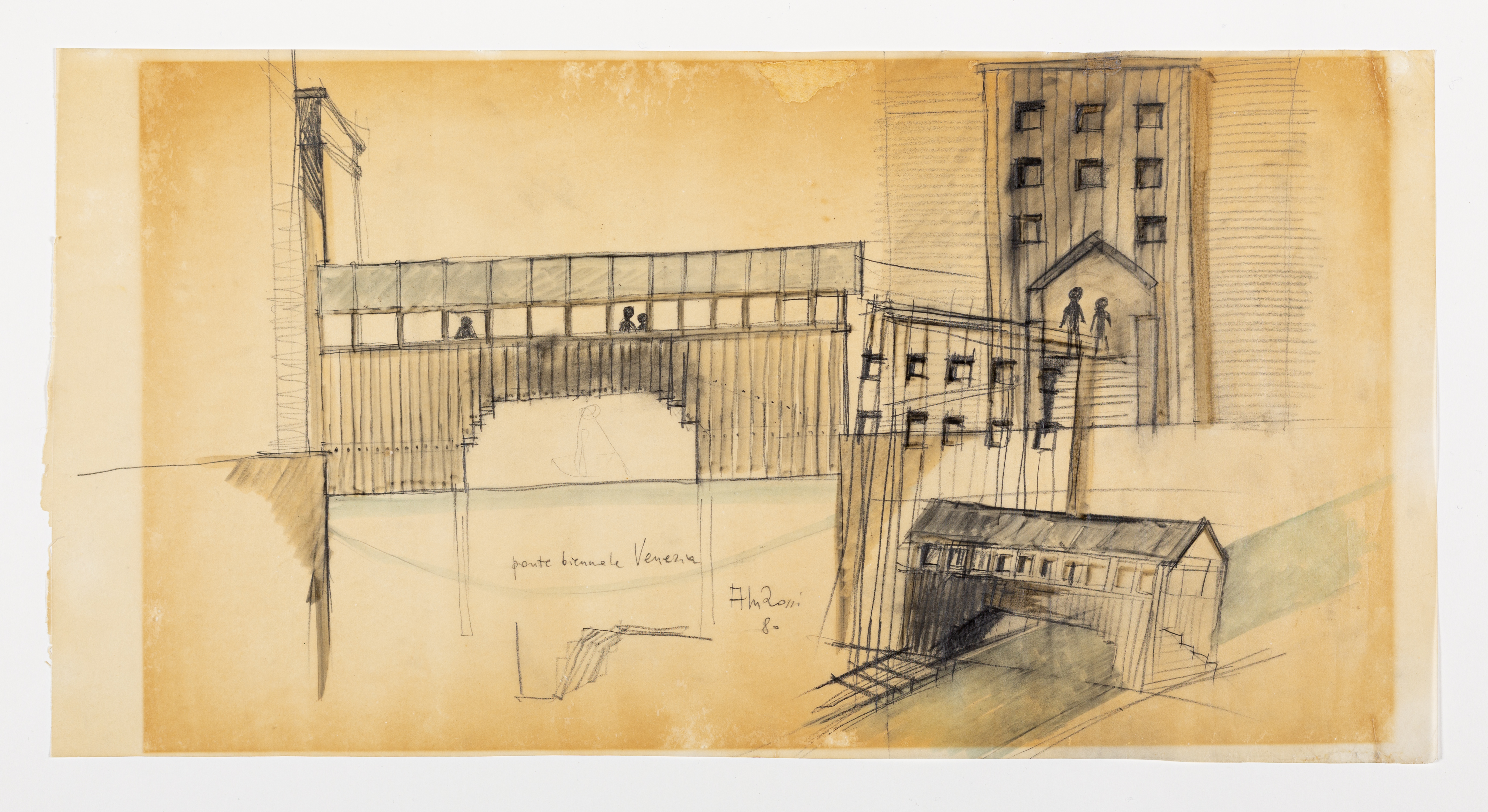 Drawing Matter holds a presentation drawing of a new harbour in the Cannareggio district of Venice, a project about which little is recorded. Similarly to other drawings of the 1990s, Rossi’s office created the work using photocopying technology. The drawing is collaged with photographs of Venice, copied onto transparent paper and then onto the drawing. Maurizio Diton, an architect in Rossi’s office at the time, remarked that these were expensive to produce and were therefore limited to a maximum of two or three.