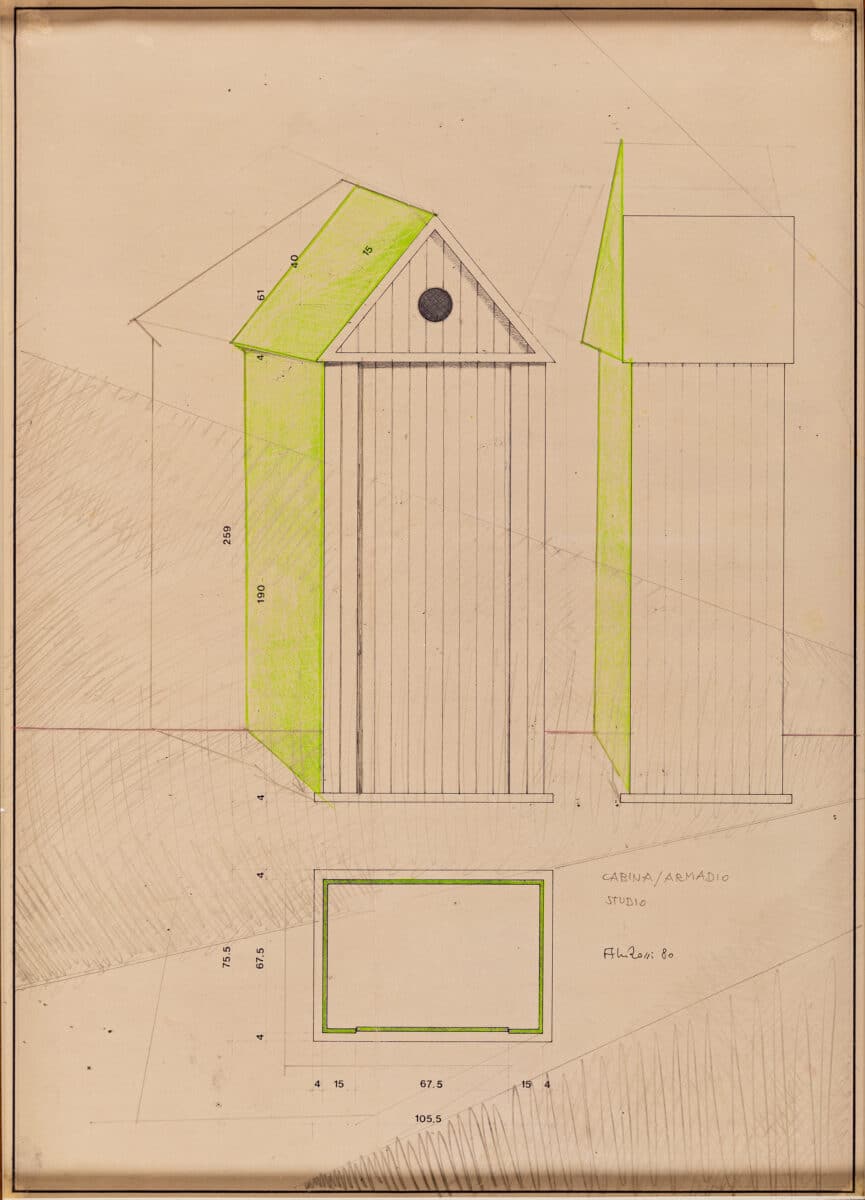 In 1980 Rossi created four prototypes of the Cabina d’Elba wardrobe in collaboration with furniture company Molteni, which were presented at the 1980 Salone del Mobile in Milan. Two years later, the Bruno Longoni furniture atelier in Cantù started producing a variation on the design. The pink and blue striped example held in the Drawing Matter collection is signed by Rossi and featured in an exhibition at the Max Protetch Gallery in New York in 1981. The cabin was acquired alongside a measured and coloured working drawing of the structure, indicated as either a wardrobe or studio. The drawing is signed 1980, while the cabin is signed 1981.