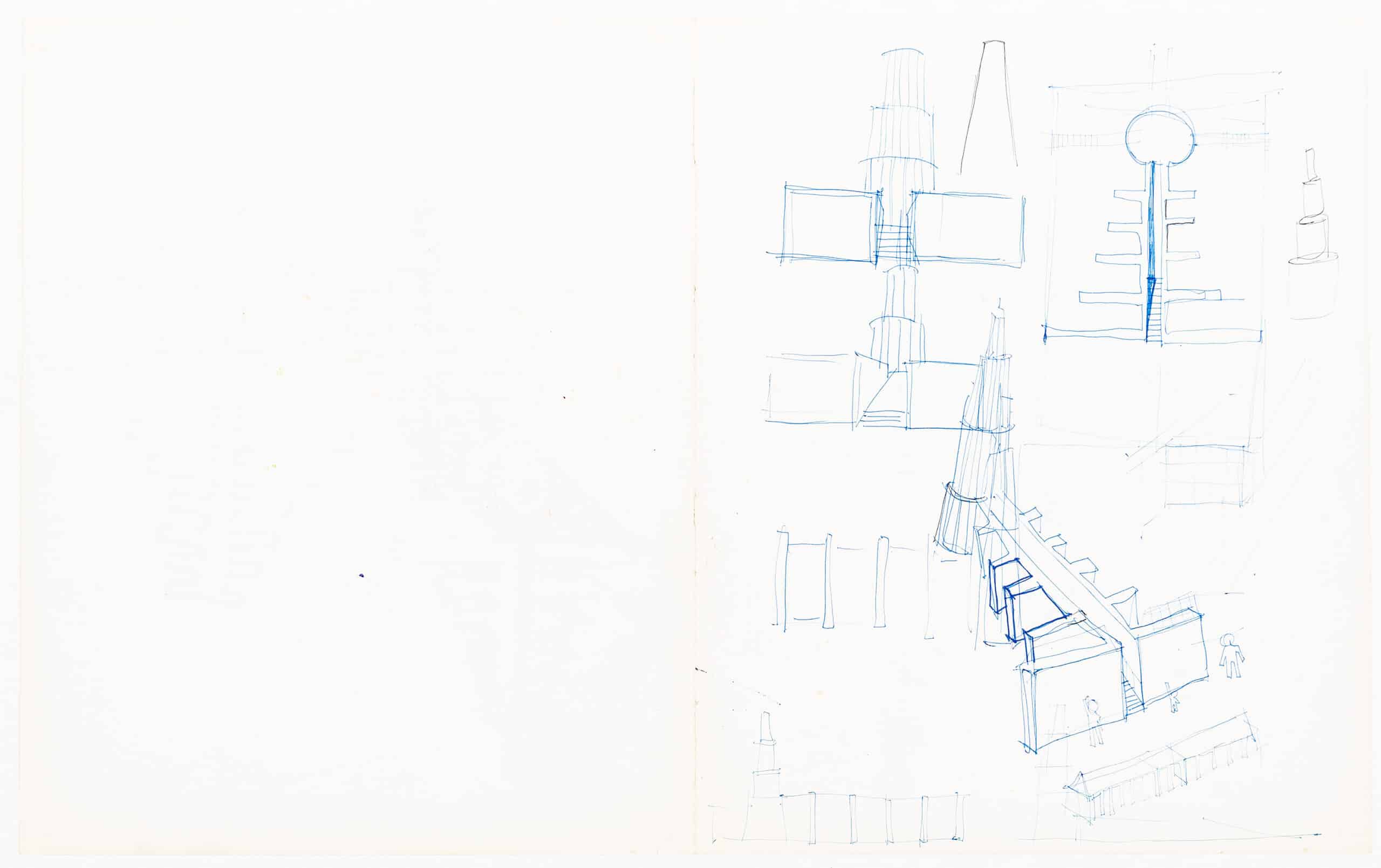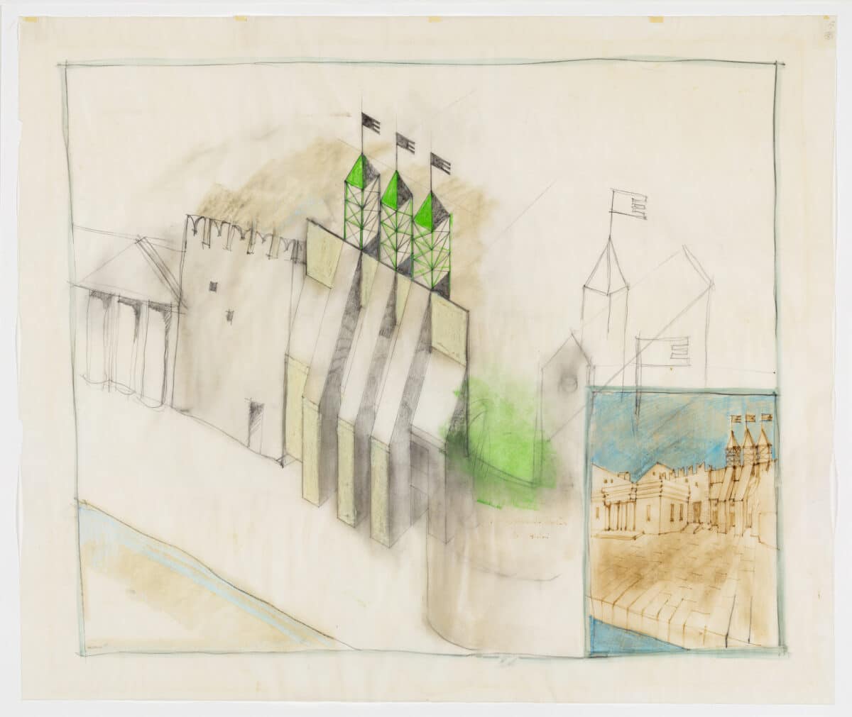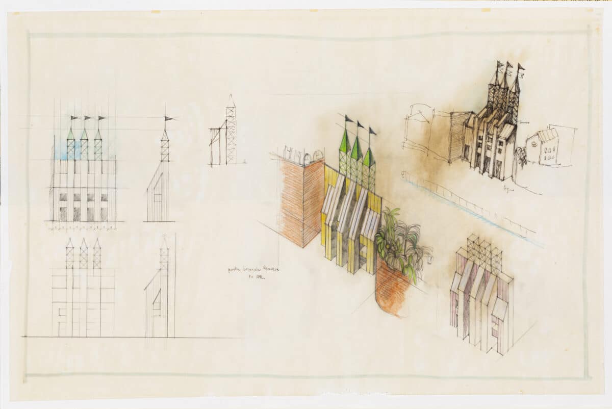 The building was developed as a pair of rising, graduated sequences of rooms flanking a porticoed corridor, which ends in a tapered, conical, or ziggurat tower on a circular base. The studies have a striking resemblance to Rossi’s sketches of the progetto di concorso per la galleria d’arte contemporanea, Milano (competition design for the contemporary art gallery, Milan) produced in 1970 held in the collection of the Fondazione Aldo Rossi.