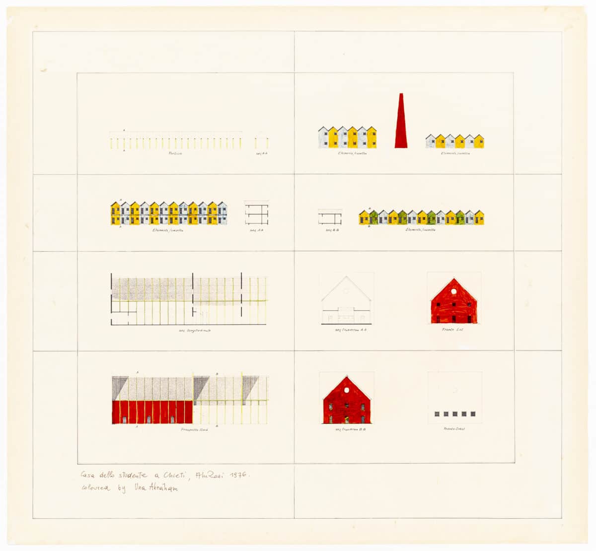 A formal montage of 8 measured drawings of Rossi, Gianni Braghieri, and Arduino Cantafora’s 1976 competition entry for student housing for the newly founded D’Annunzio University in the city of Chieti, close to Pescara in Abruzzo. The drawing presents elevations of the two housing types and the project’s community centre. It states in the bottom left corner that the drawing was coloured by Una Abraham. Abraham, an architect herself, but also the daughter of Rossi’s peer Raimund Abraham.