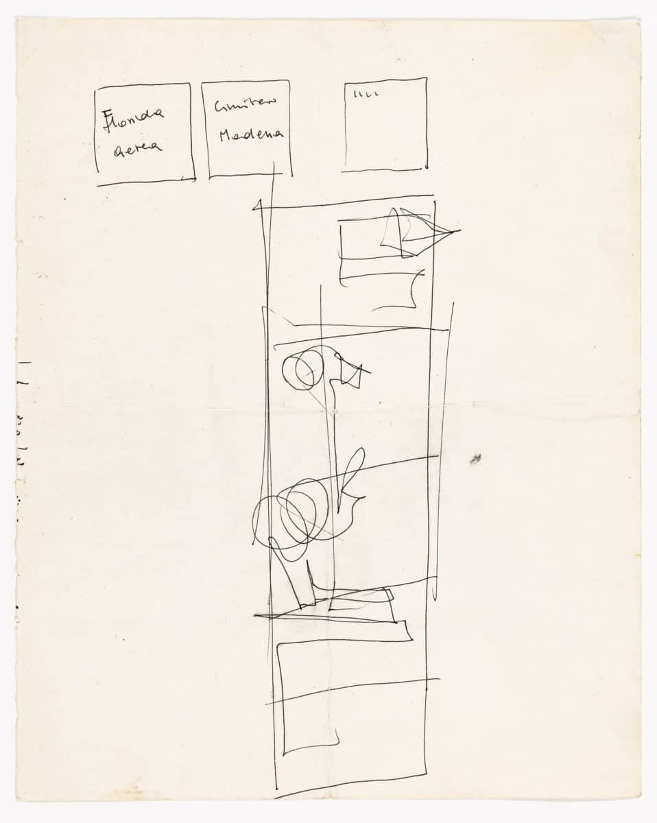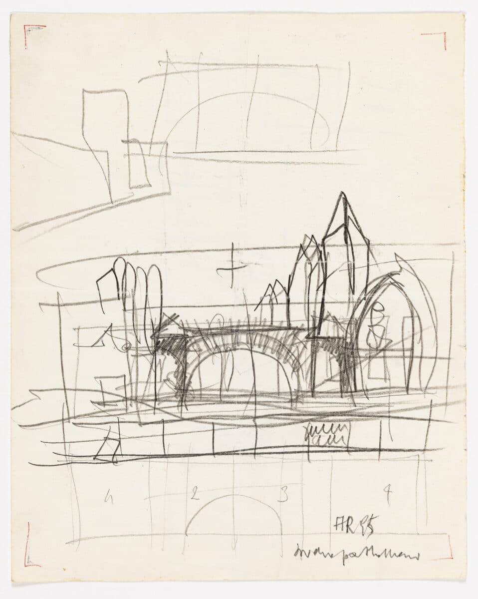 DMC 3012 is a double-sided sheet of sketches. On the verso is a schematic perspective plan with notes on the Cemetery at Modena and a project in Florida. The recto is a composite of sketches, bringing together St. Servatius Bridge, the Onze Lieve Vrouwe Cathedral and the dome of Rossi’s Bonnefanten. Drawn in 1995, after the completion of the project, the drawing aims to cement the museum’s place within the historic structures of the city.
