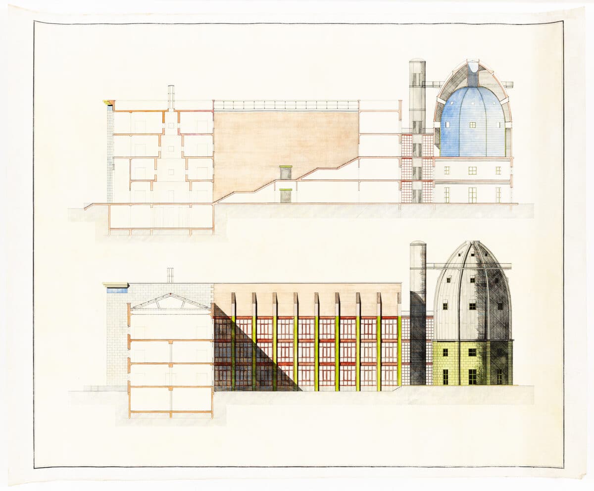 Rossi did not believe in an architectural type for the museum; its status as a building defined only by what is placed inside it. Therefore, the design draws from other historic institutional forms. From Rossi’s writings of the project, the telescope-shaped dome references the term lichtraum, meaning ‘light room’, in particular the Lichthof at the University of Zurich. But equally, Rossi draws on local structures to stimulate memory: the steepness of the staircase within the dome recalls the steep and awkward Dutch stairs, intended to evoke a memory ‘legata al mondo gotico delle taverne Shakespeariane come ai traballanti personaggi di Conrad’ (‘linked to the Gothic world of Shakespearean taverns as well as to Conrad’s unsteady characters’).