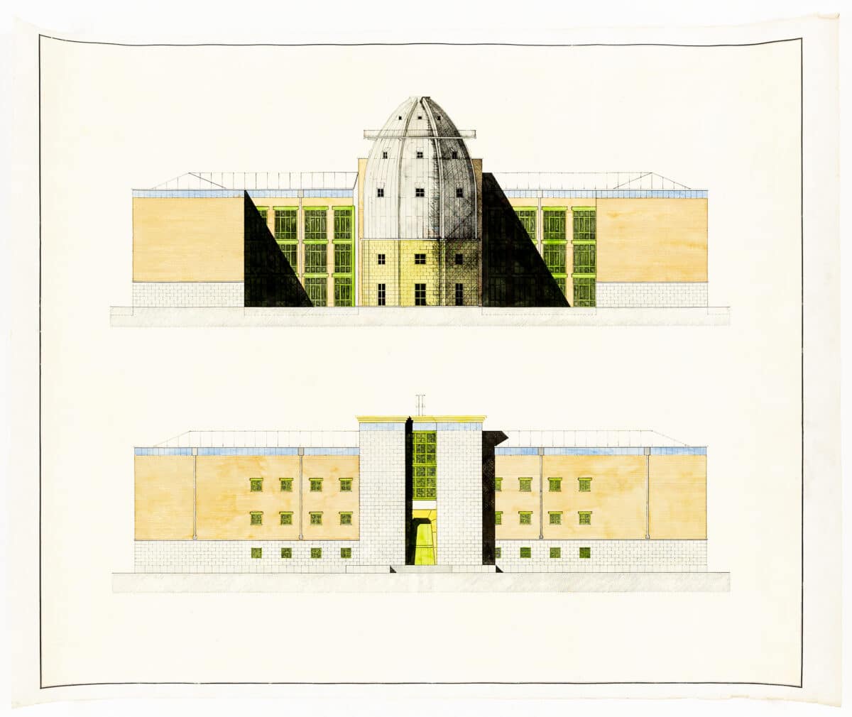 The studies explore formal characteristics that were beginning to appear in the designs for his first important built project in the Gallaratese district of Milan (1969-70). These forms became essential elements of the two major built works that followed: San Cataldo cemetery in Modena (1971-78) and the school at Fagnano Olona (1972), and also took a central place in his imaginative constructions of the theatre of the city, late into the 1970s, before reemerging in elegiac form in the Bonnefanten Museum in Maastricht (1990–95). The two sheets in the Drawing Matter collection came from the collection of critic and Rossi’s collaborator Vittorio Savi.