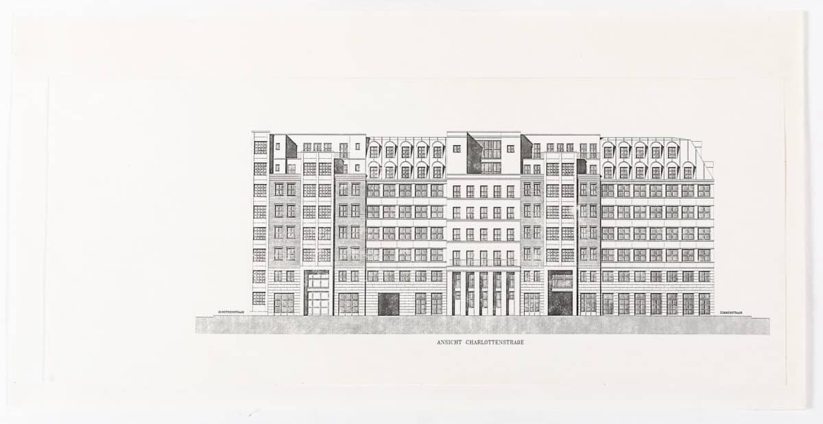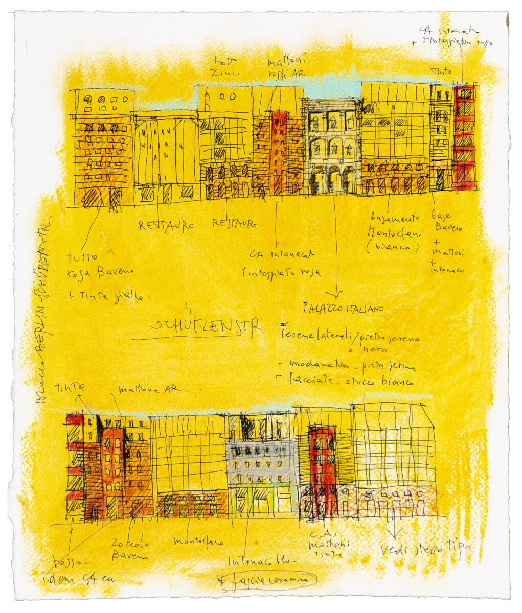 The city block with three courtyards was designed in collaboration with the architectural offices Bellmann & Bohm and Luca Meda. The project was guided by Rossi’s interest in the reconstruction of Berlin, after the fall of the Berlin Wall in 1989. He studied the restoration of historic buildings, as well as how new buildings were being grafted onto them. The historic block on Schützenstraße, had been damaged during the construction and surveillance of the wall, and Rossi’s project sought to infill the block with colourful ‘framing’ elements made of modern materials: iron and glass. For the four elevations Rossi crafted twelve different facade types, repeating and varying parapets, attics, thresholds, and window treatments. It is an architectural collage that sees Rossi contrast the existing buildings with modern interventions, although he also inserts a direct copy of an internal courtyard facade of the Palazzo Farnese onto the facade.