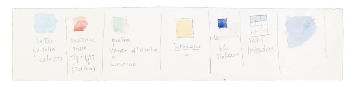 A colour chart made by Rossi as instructions for his office. Each colour has an inscription below: ‘tetto px tutto celeste’ (‘roof px all sky blue’), ‘mattone rosso tipo GFT (Torino)’ (‘red bricks, GFT type (Turin))’, ‘pietra verde d’Oropa o Luserna’ (‘green stone from Oropa or Luserna’), ‘intonaco’ (‘plaster’), ‘ceramiche blu violaceo’ (‘purplish-blue ceramic’), and ‘vetri mirador’ (‘mirador glass’). It is not clear which project this relates to.