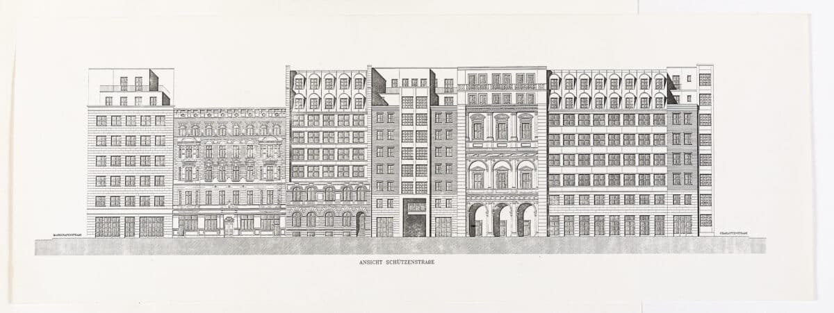 Drawing Matter holds four elevation drawings for a residential and commercial block on Schützenstraße, Mitte, Berlin. A richly annotated colour photocopy sheet identifies the different proposed components and their sources in two sketch elevations; another sheet presents a more articulated rendering of the possible facades; and two black and white prints present the final, simplified proposed elevation.