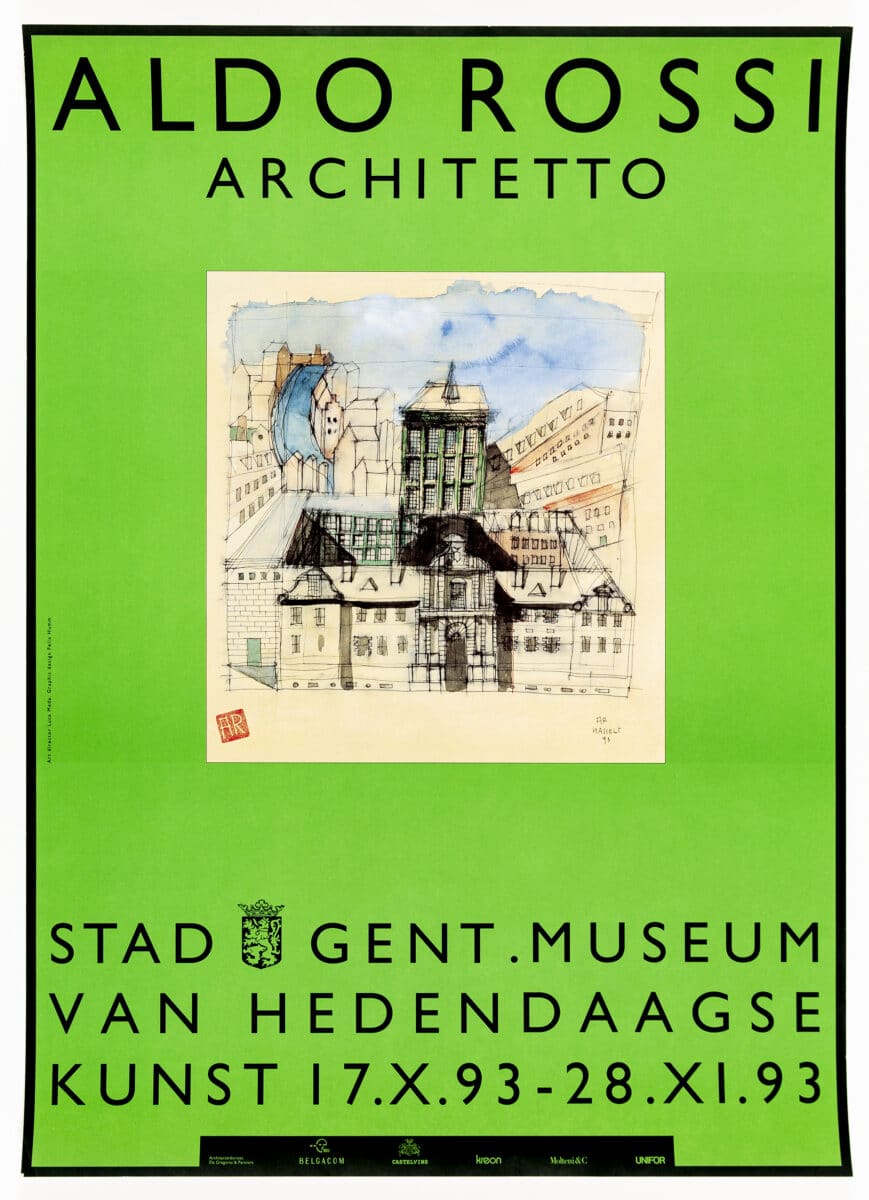 In 1993, a major exhibition of Aldo Rossi’s work was organised between the Berlinische Galerie at the Martin-Gropius-Bau in Berlin and the Museum of Contemporary Art in Ghent, Belgium. This poster for the Ghent exhibition depicts a 1993 drawing of the Oud Gasthuis (Old Hospital) in Hasselt, Belgium.