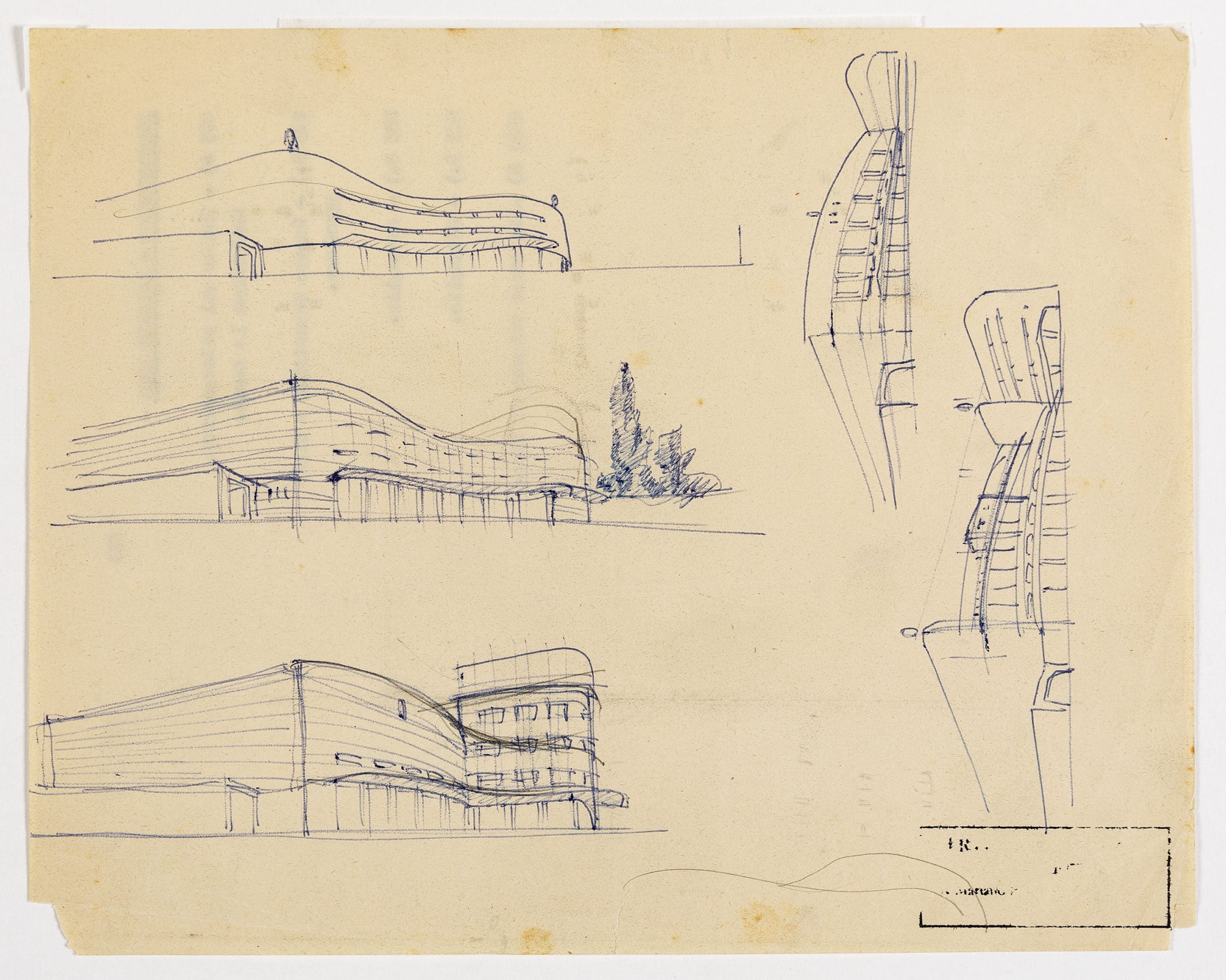 In 1942 Marchi designed the Odeon Cinema in Livorno, defined by its curved facade. The Drawing Matter Collection holds a single sheet of sketches of the project. It shows five perspective drawings repeated over the page. The sheet was most likely repurposed as it features a blurred typed list on its verso.