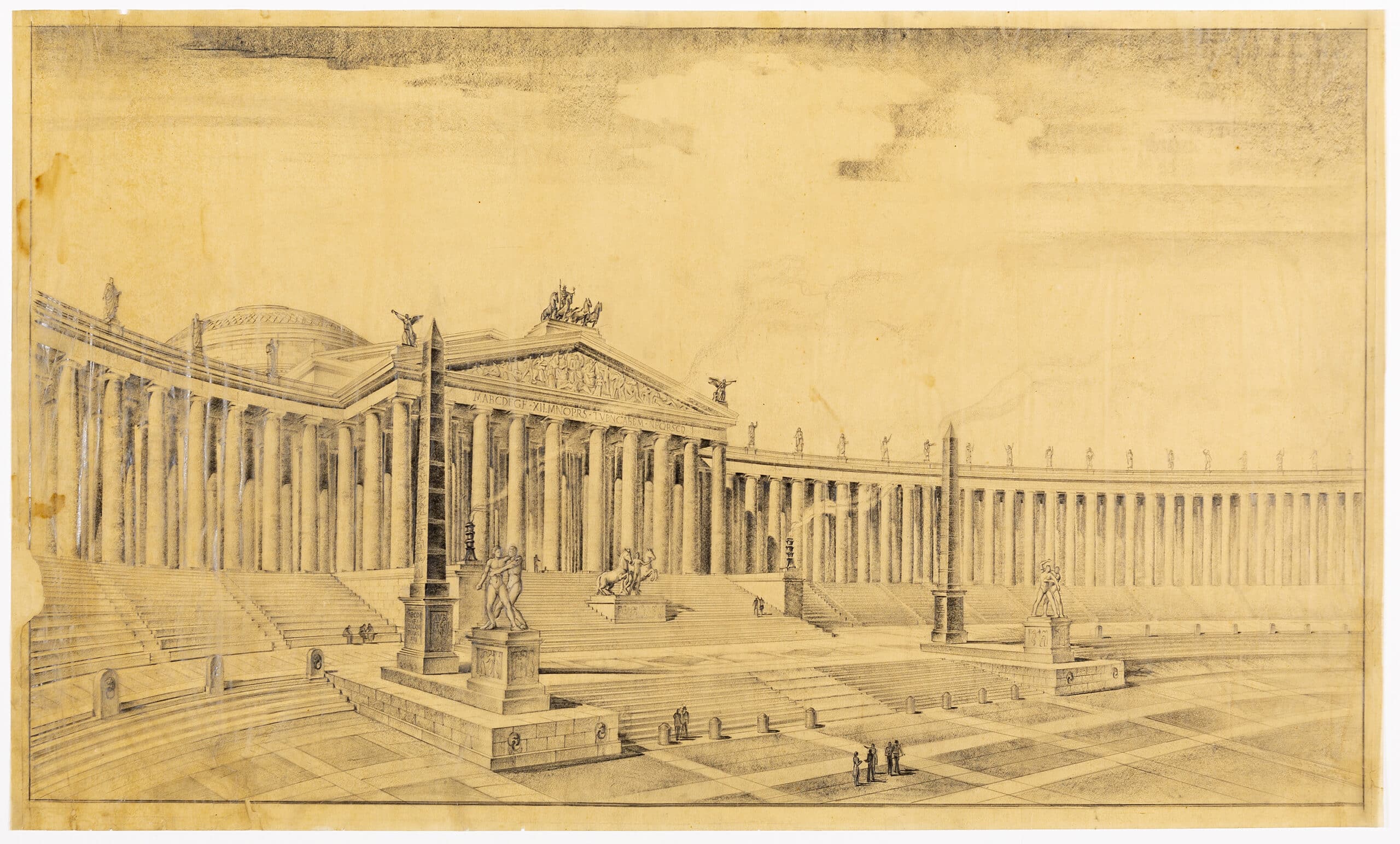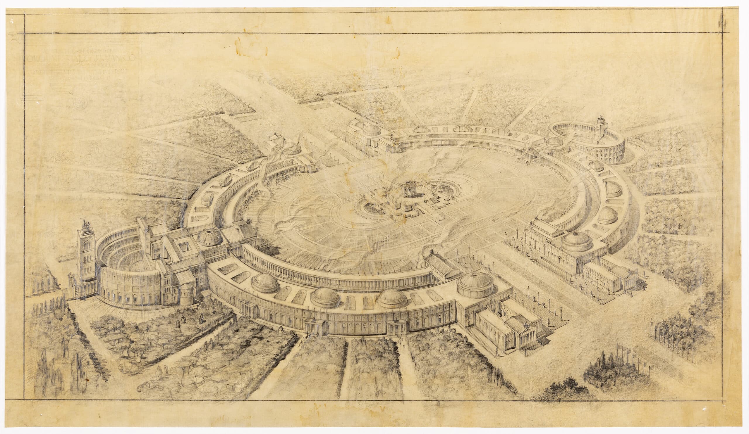 Four perspectives on tracing paper, proposing a forum which unites the Imperial architecture of Germany and Rome. One is a bird’s-eye view displaying the whole scheme of the collonaded oval structure, abutted at either end by Colosseum-esque theatres. The other three drawings depict specific scenes within the forum: a pedimented facade with a grand staircase, the central triumphal arch with surrounding fountains, and a grand boulevard leading to the central arch, lined with statues. Printed in the top left of DMC 1443 is a faded inscription that reads: Veduta Prospettica del Foro Imperiale Germanico, [Illegible line], Architettura Romani Imperiale, Arch. Armando Brasini. The inscription is contained in a frame, decorated by the Nazi party’s Parteiadler symbol, of an eagle holding the swastika.