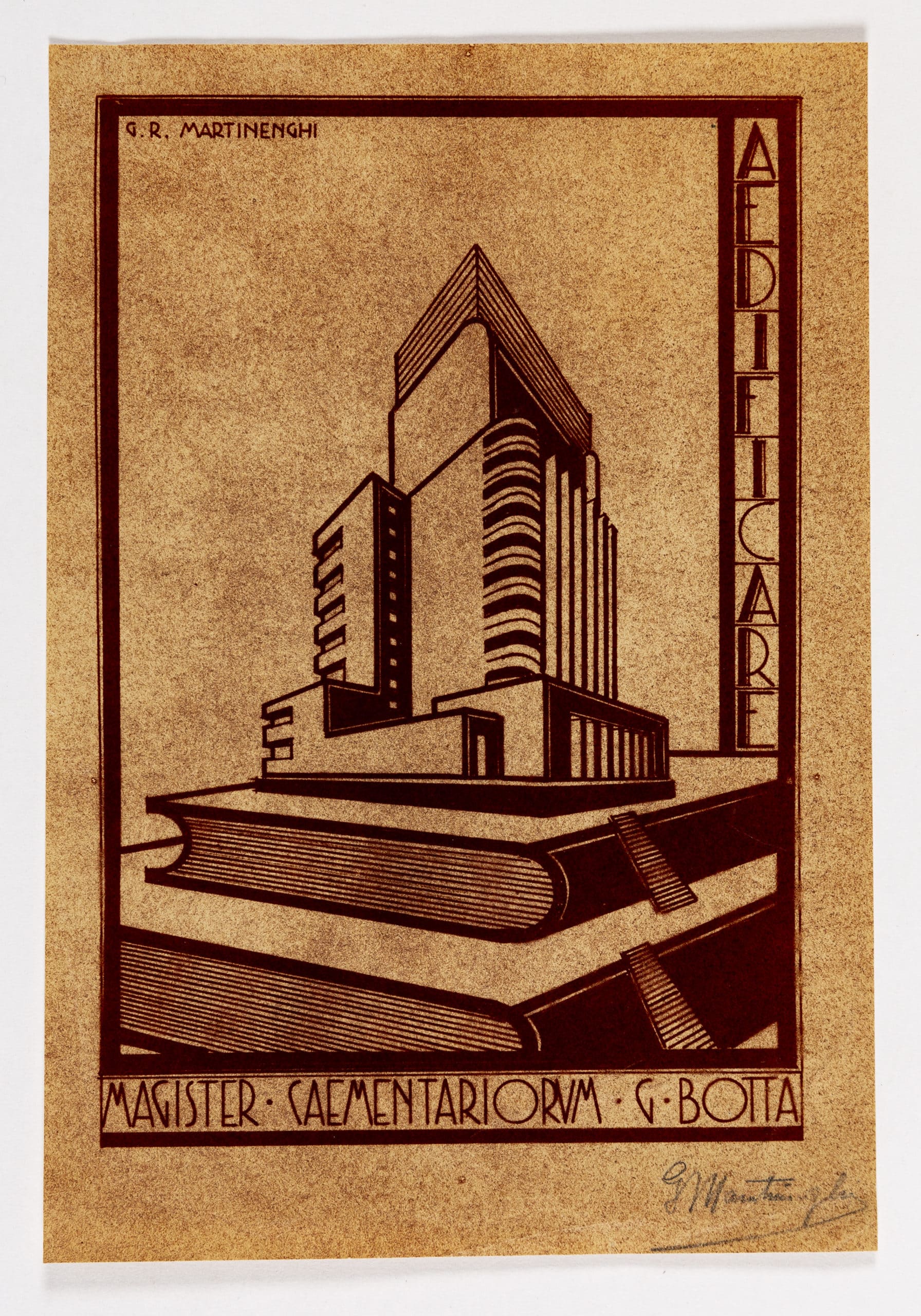 An ex-libris woodcut by Giuseppe Roberto Martinenghi dedicated to an unknown G. Botta, who is called a Magister Caementariorum (‘master mason’), it is in sepia ink on tobacco-coloured paper, the print captures a building atop a pile of books, on the right is printed Aedificare (‘to build’). On the reverse is a bookplate and the copy is signed in pencil.
