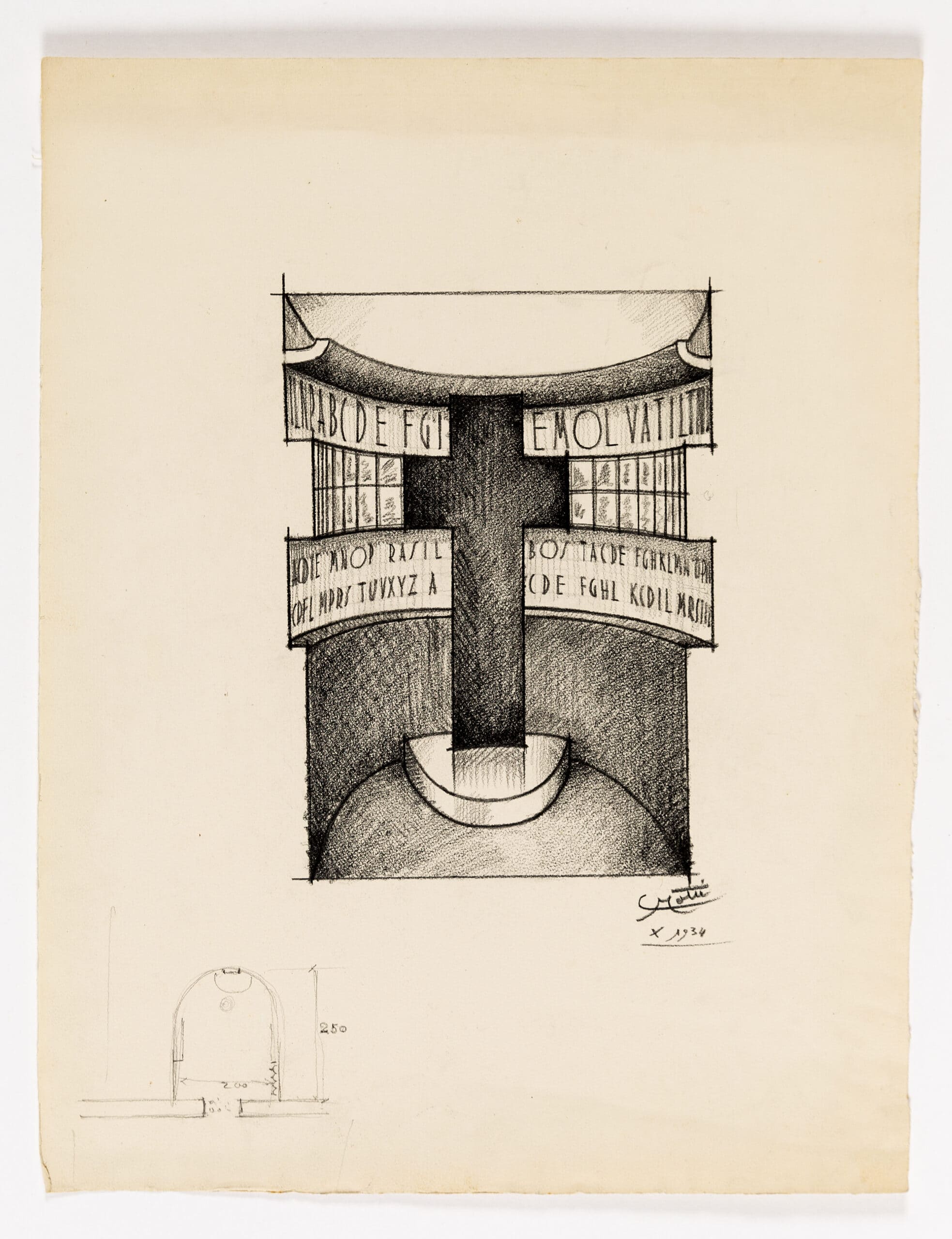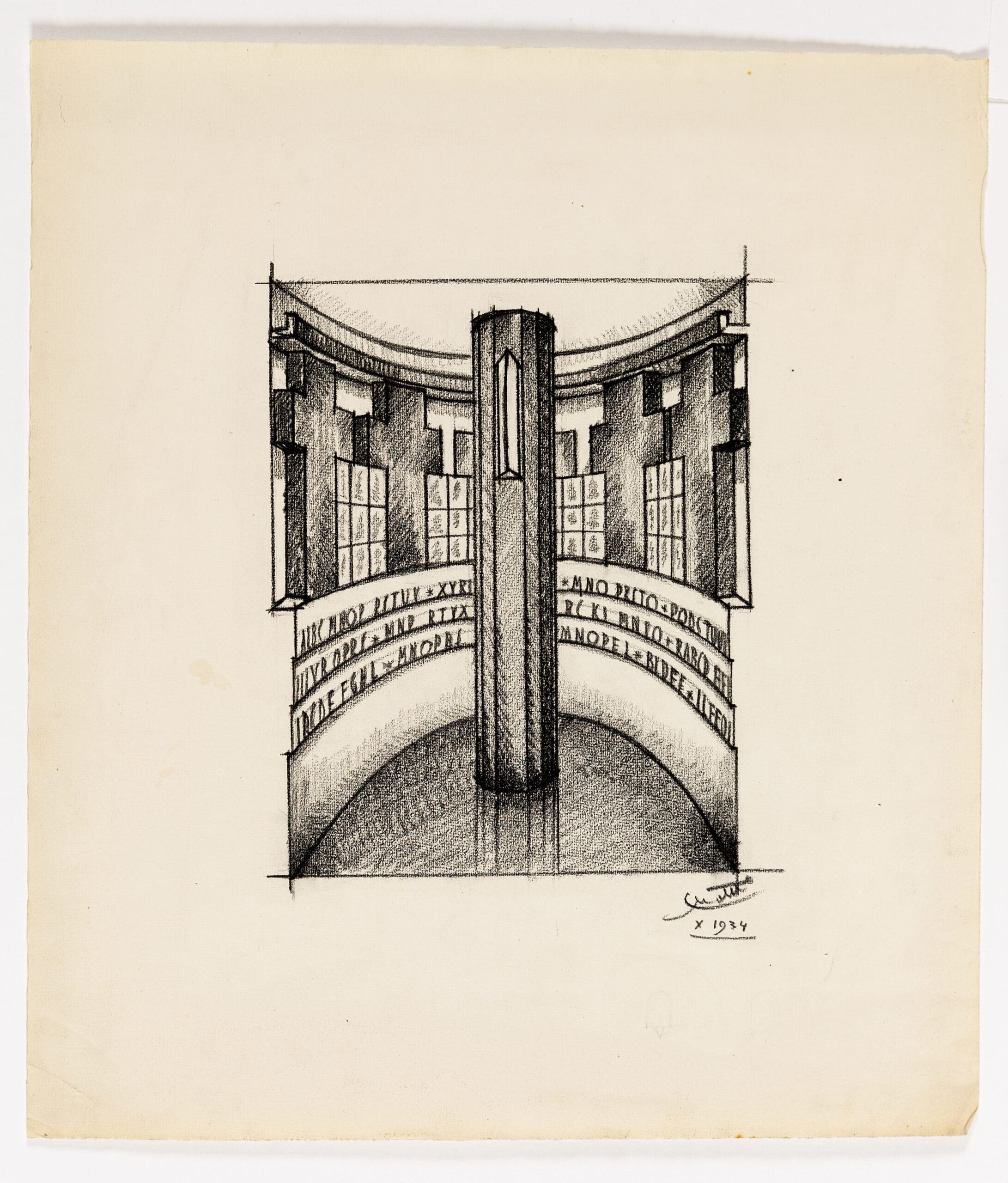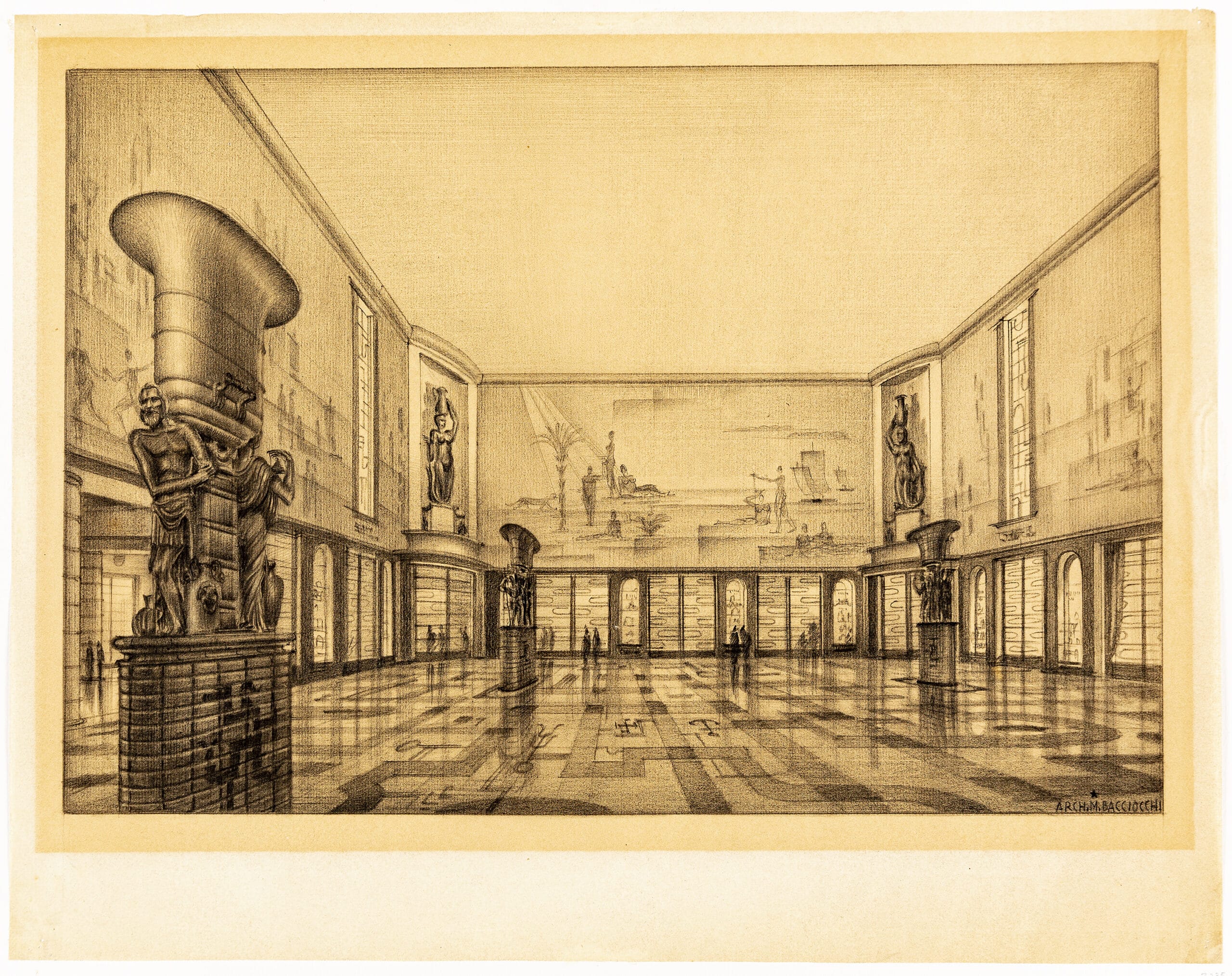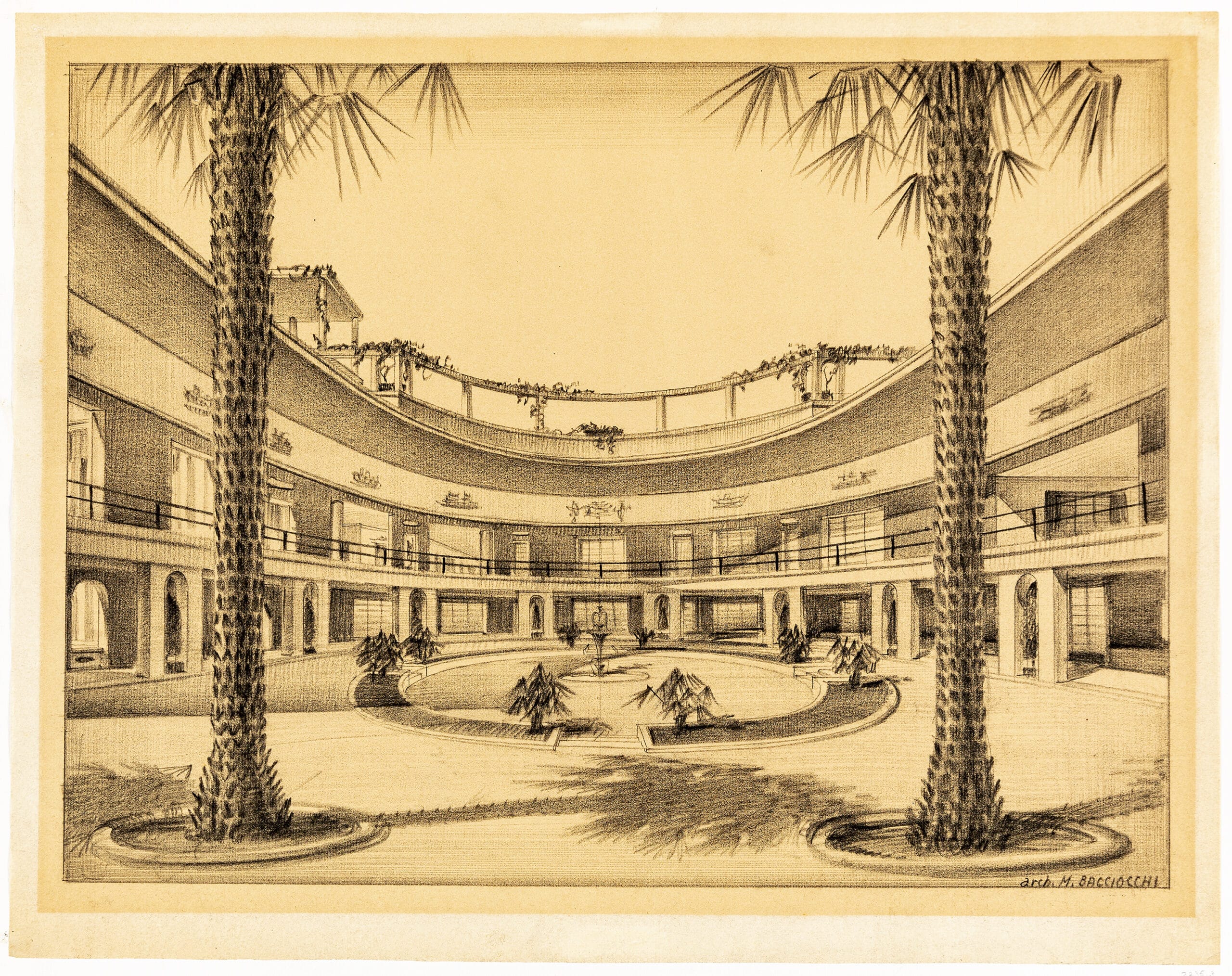 The Fifth Triennale in 1933 was designed by Giovanni Muzio, yet with curatorial input from Mario Sironi. Throughout its site at the Palazzo dell’Arte, Italian artists including Massimo Campigli, Carlo Carrà, Felice Casorati, Giorgio De Chirico, and Achille Funi, exhibited murals, mosaics, and sculptures, coordinated by Mario Sironi. In Il Parco Sempione, next to the Palazzo, Sironi designed the Cortile d’Onore, an area dedicated to outdoor events and decorated with five monumental arches. Drawing Matter holds a design for the entrance to the architecture room, which with some amendments was executed by Sironi alongside Antonio Carminati and Angelo Bordoni.