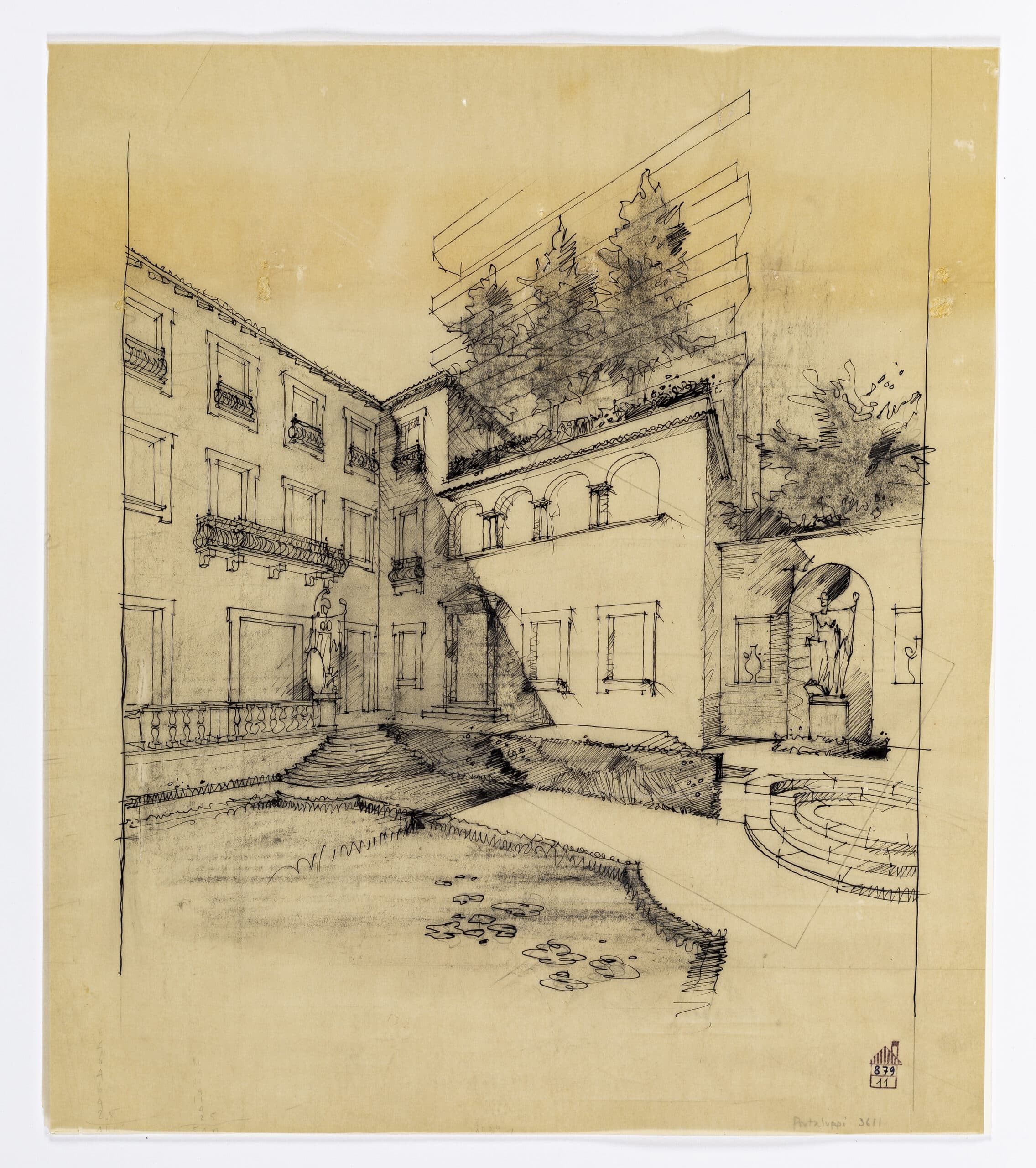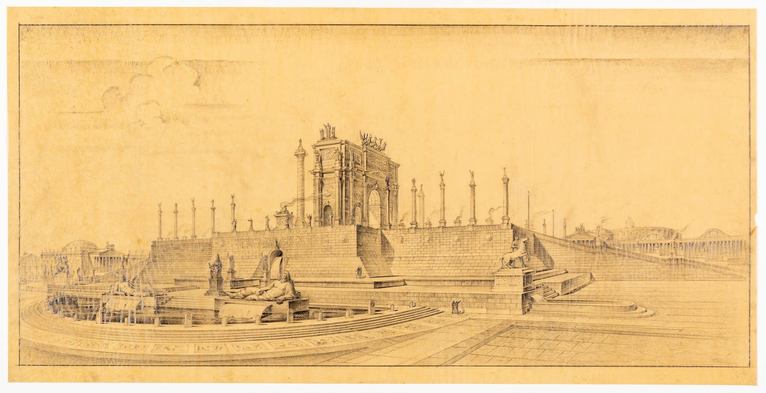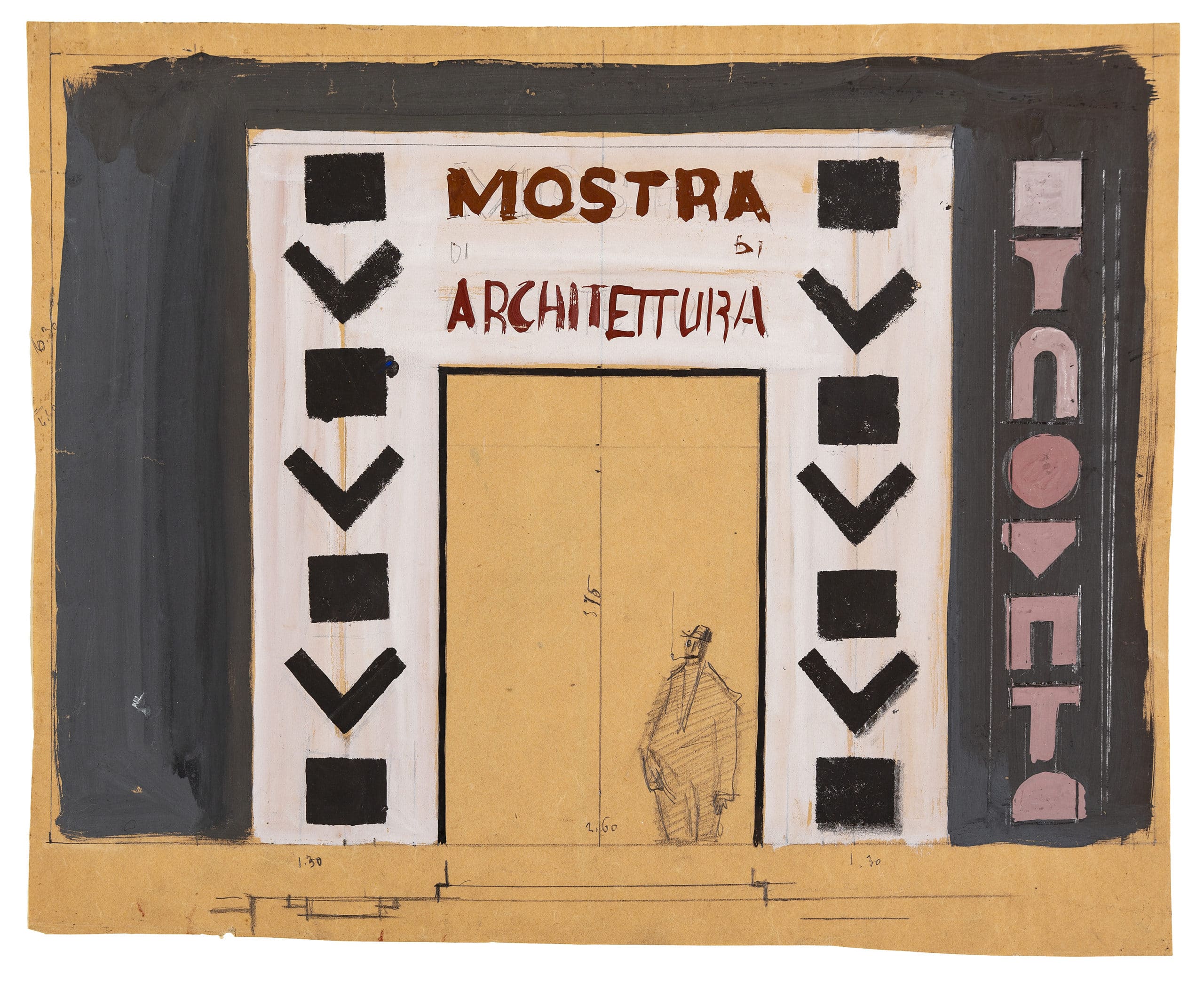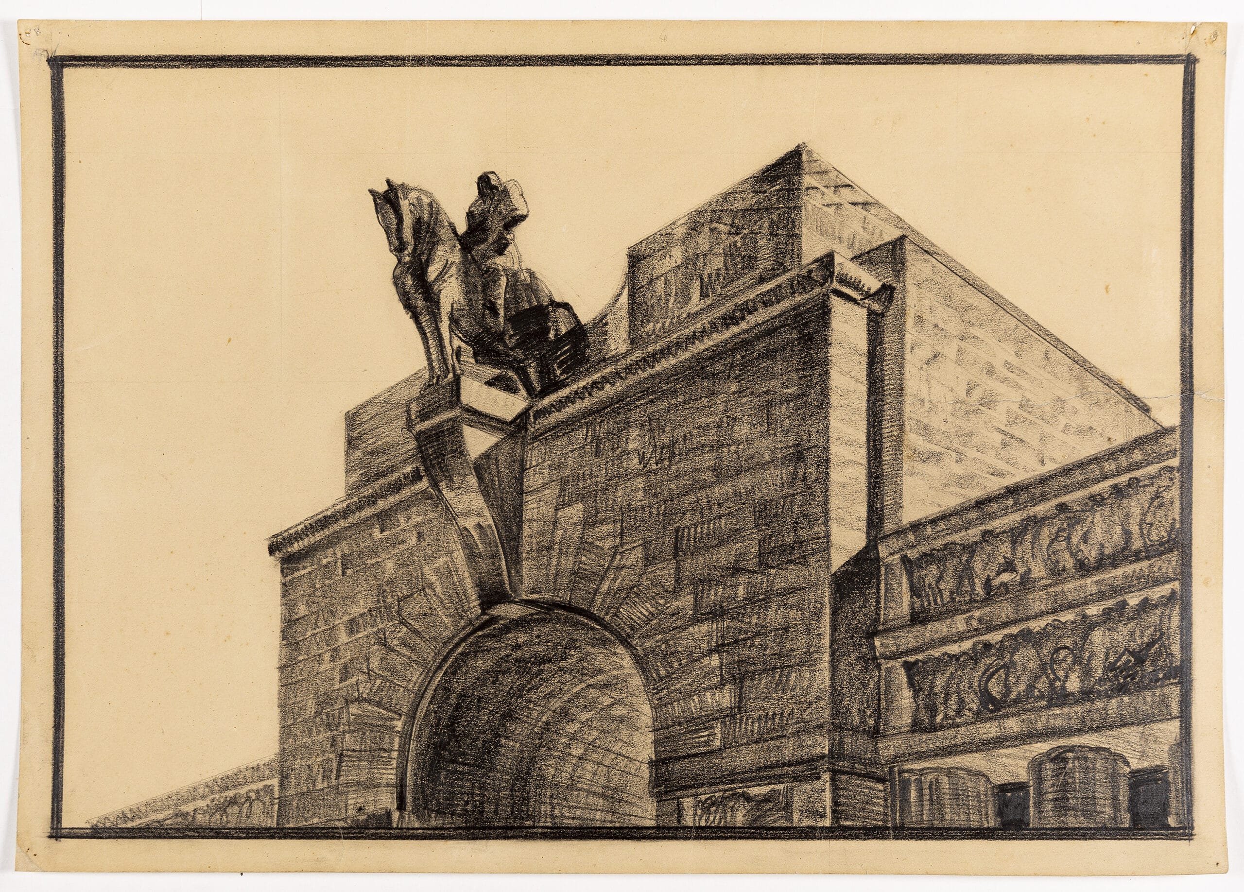 The Fifth Triennale in 1933 was designed by Giovanni Muzio, yet with curatorial input from Mario Sironi. Throughout its site at the Palazzo dell’Arte, Italian artists including Massimo Campigli, Carlo Carrà, Felice Casorati, Giorgio De Chirico, and Achille Funi, exhibited murals, mosaics, and sculptures, coordinated by Mario Sironi. In Il Parco Sempione, next to the Palazzo, Sironi designed the Cortile d’Onore, an area dedicated to outdoor events and decorated with five monumental arches. Drawing Matter holds a design for the entrance to the architecture room, which with some amendments was executed by Sironi alongside Antonio Carminati and Angelo Bordoni.