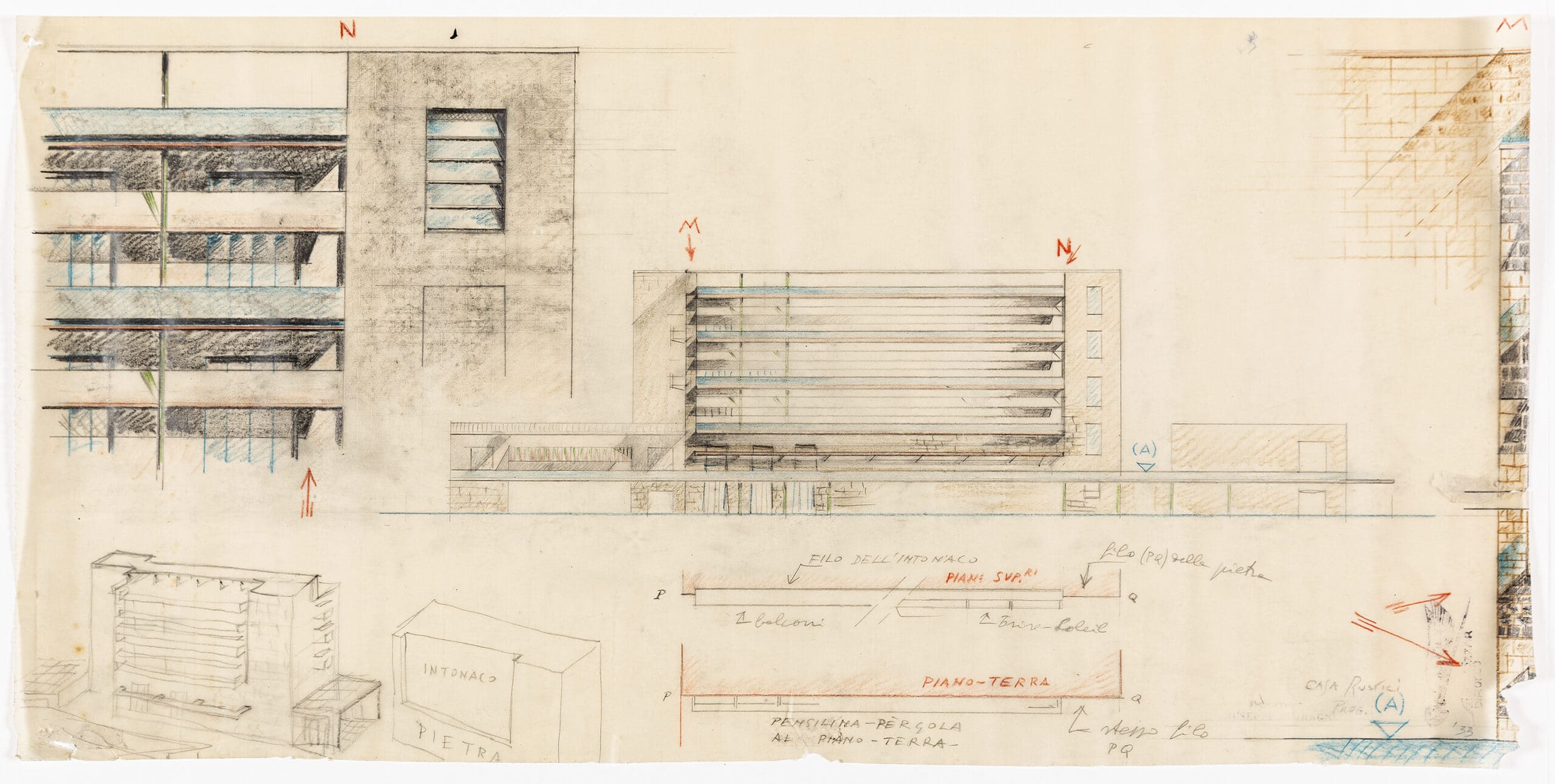 Two of the drawings show facade variations, differing through balcony placements and their number of supporting columns. The other drawing depicts one elevation in full, surrounded by details and other sketches. In the top right we see a detailed corner of the elevation, below is a perspective of the building where we see its barely articulated ‘s’ shape. At the bottom are two perspectives showing how the facade would interact with the street, encompassing a recessed section with brise-soleil. To the right of the image is a cross-section of the ‘M’ line, indicated in the main elevation. All these works are on tracing paper, with pinned corners and two stamps that read, ‘Progetto di GIUSEPPE TERRAGNI’ and ‘Senza Cozzar di Rocco’ (without clashing with rocks), a motto of poet-pilot Gabriele D’Annunzio, about the devastating yet distant act of dropping bombs from the sky.