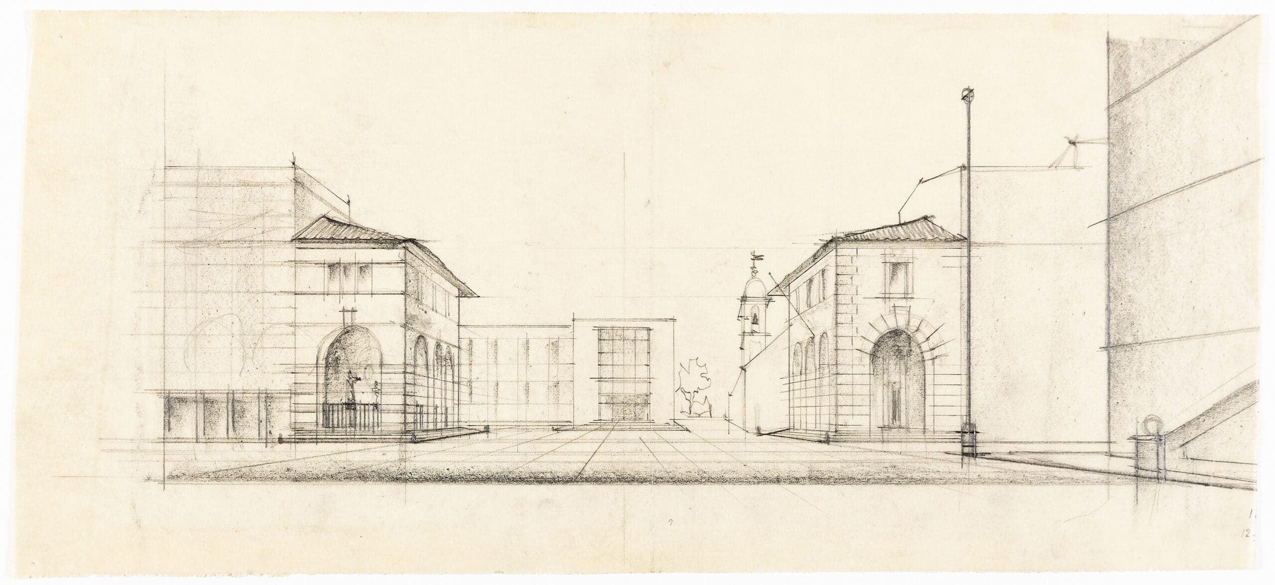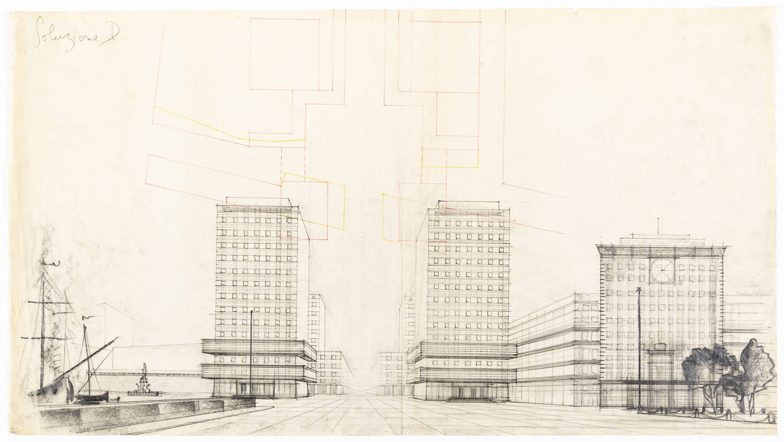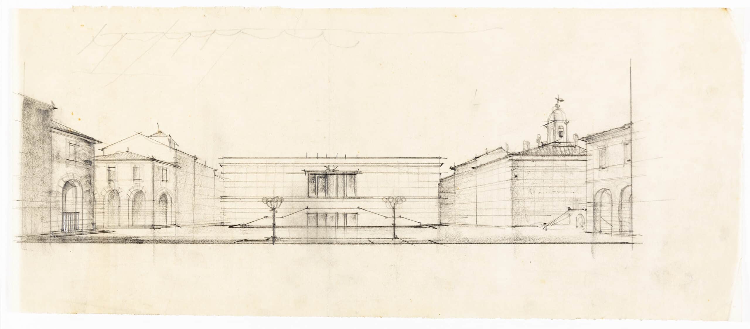 A shift occurred in Marchi’s work into the 30s, his architecture turned away from the swirling constructions of his paintings, and he pushed towards rationalism. This formal change can be seen in his competition drawing for Le Esposizione Universale di Roma (DMC 3245.1), tasked with the development of a new business district in the south of Rome which would form the basis of the city’s 1942 World’s Fair. Known as the E42 project, it was to celebrate twenty years of Mussolini’s rule and represent a ‘Third Rome’. Here, in ‘Soluzione D’, an endless projection of gridded towers extends off an open piazza. Marchi did not win the commission; the E42 site was entrusted to Adalberto Libera for his Palazzo dei Ricevimenti e dei Congressi and Guerrini, La Padula, and Romano’s ‘square colosseum’, the Palazzo della Civiltà Italiana, among others. This form of the projected pencil drawings is also found in DMC 3245.3 and DMC 3245.4; yet they show the integration of new rational structures into a historic town centre.