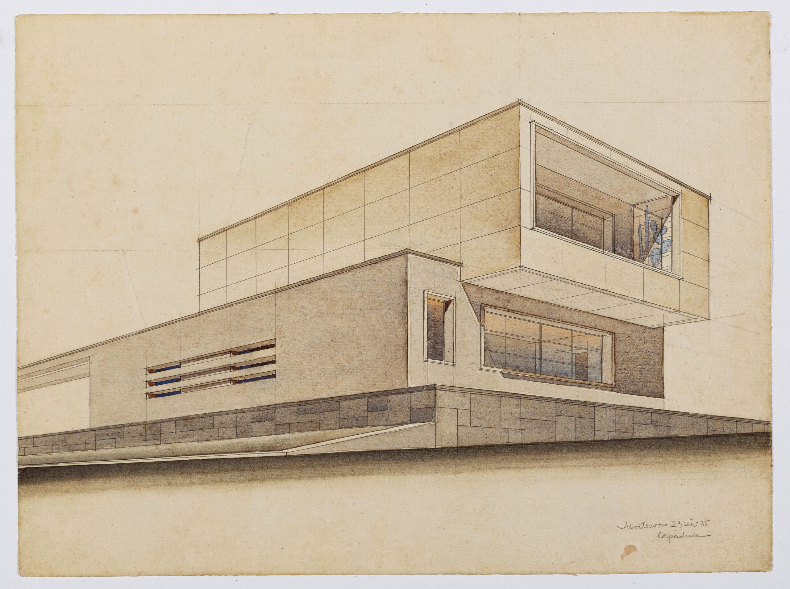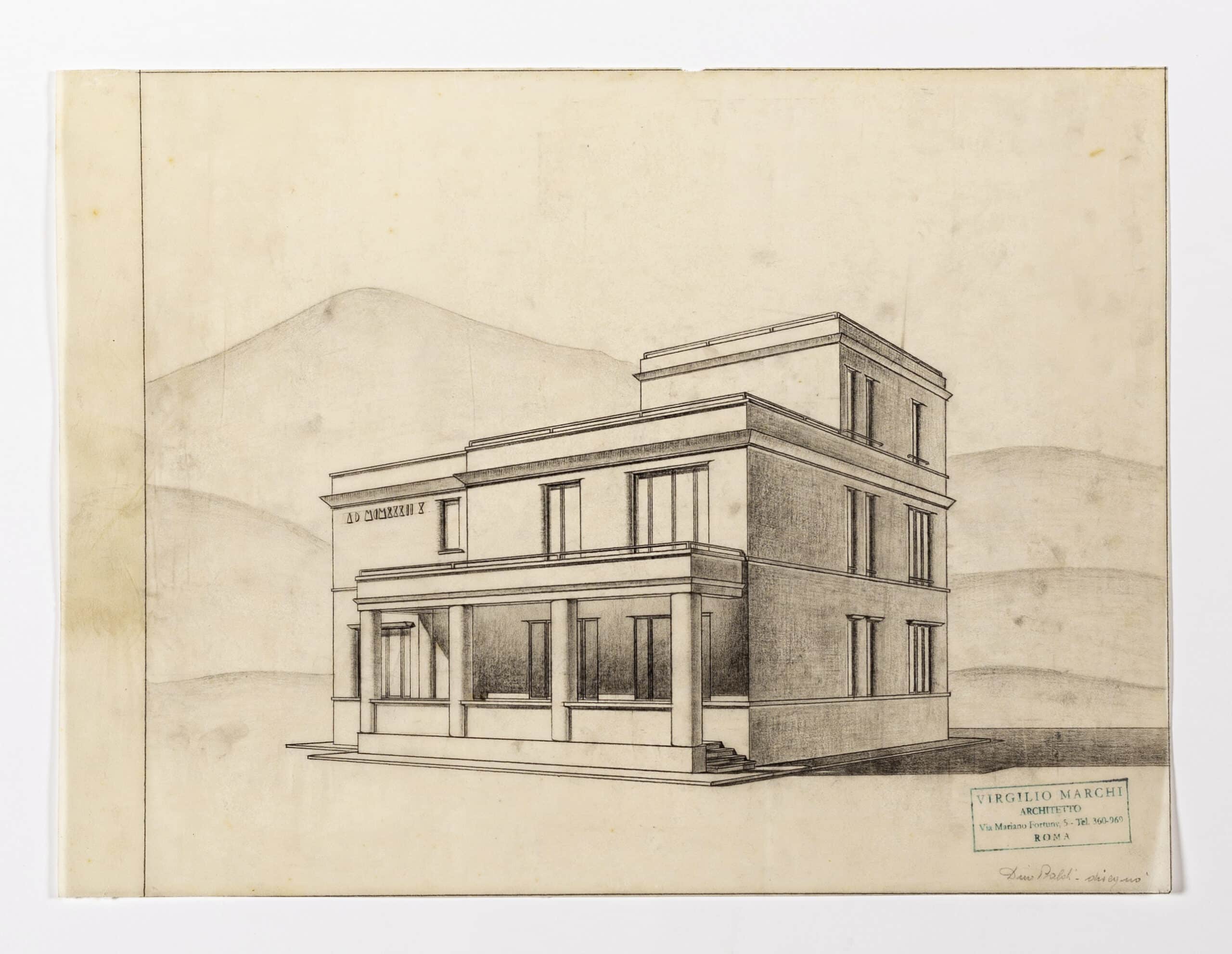 This turn to rationalism is also found in a 1931 drawing of a laboratory office for an explosives factory near Rome (DMC 3871); it stands alone in a blank landscape designed as a classical villa stripped to its bare functional elements.