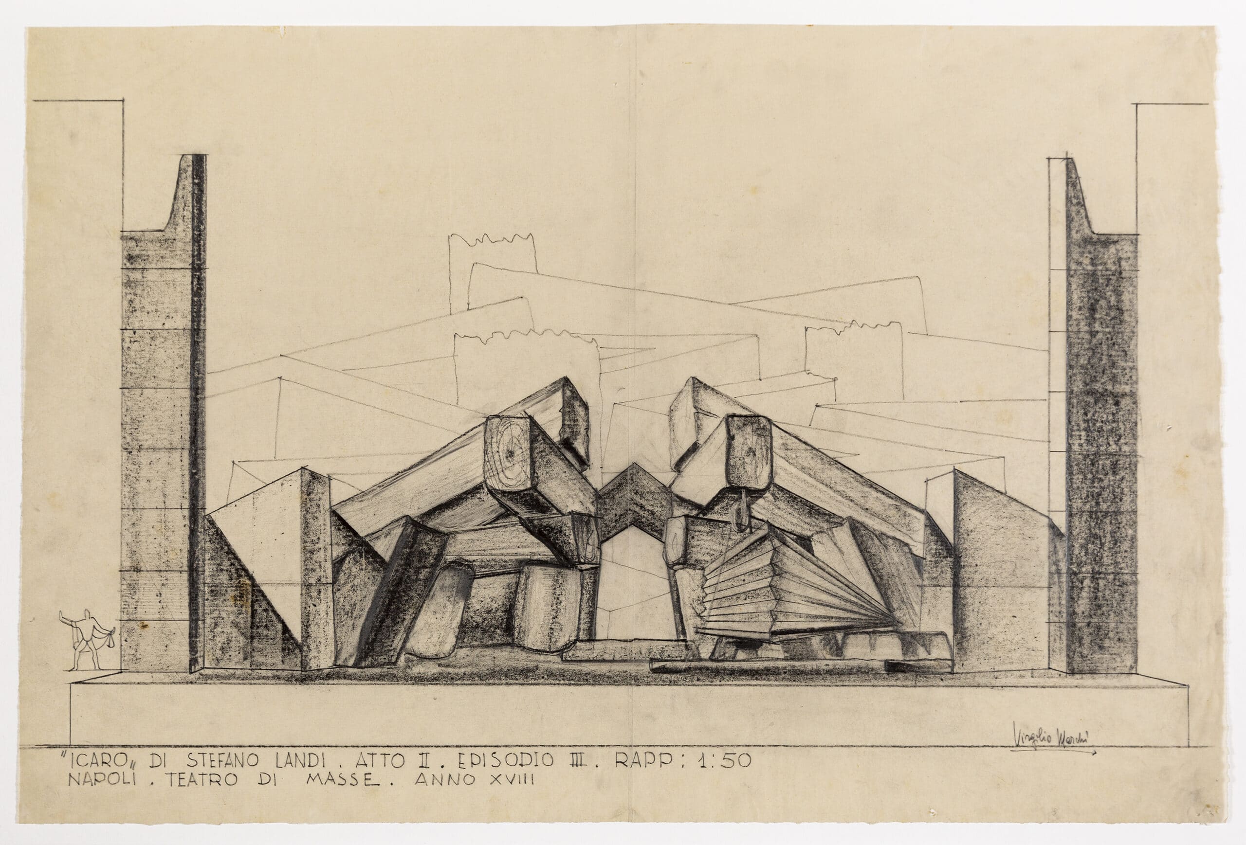 In 1921, fellow member of the Futurists, Anton Giulio Bragaglia, invited Marchi to design his Casa d’Arte Bragaglia with the adjoining Teatro degli Indipendenti, an avant-garde cultural centre and meeting place for artists and intellectuals in Rome; this is classed as the first built work of the Futurists. Here, Marchi becomes involved in the Teatro degli Indipendenti as a stage and costume designer, only fueling his Futurist desire to unify arts. Two years later, the theatre put on the one act play of Futurist set designer Claudio Vicentini Pirandello; it is most likely at this performance that Marchi met Stefano Landi and Massimo Bontempelli. The two set drawings by Marchi in the Drawing Matter collection are collaborations with Landi on his staging of ‘Icaro’ (DMC 2067) and Bontempelli for his opera ‘Valoria’ (DMC 3245.2).