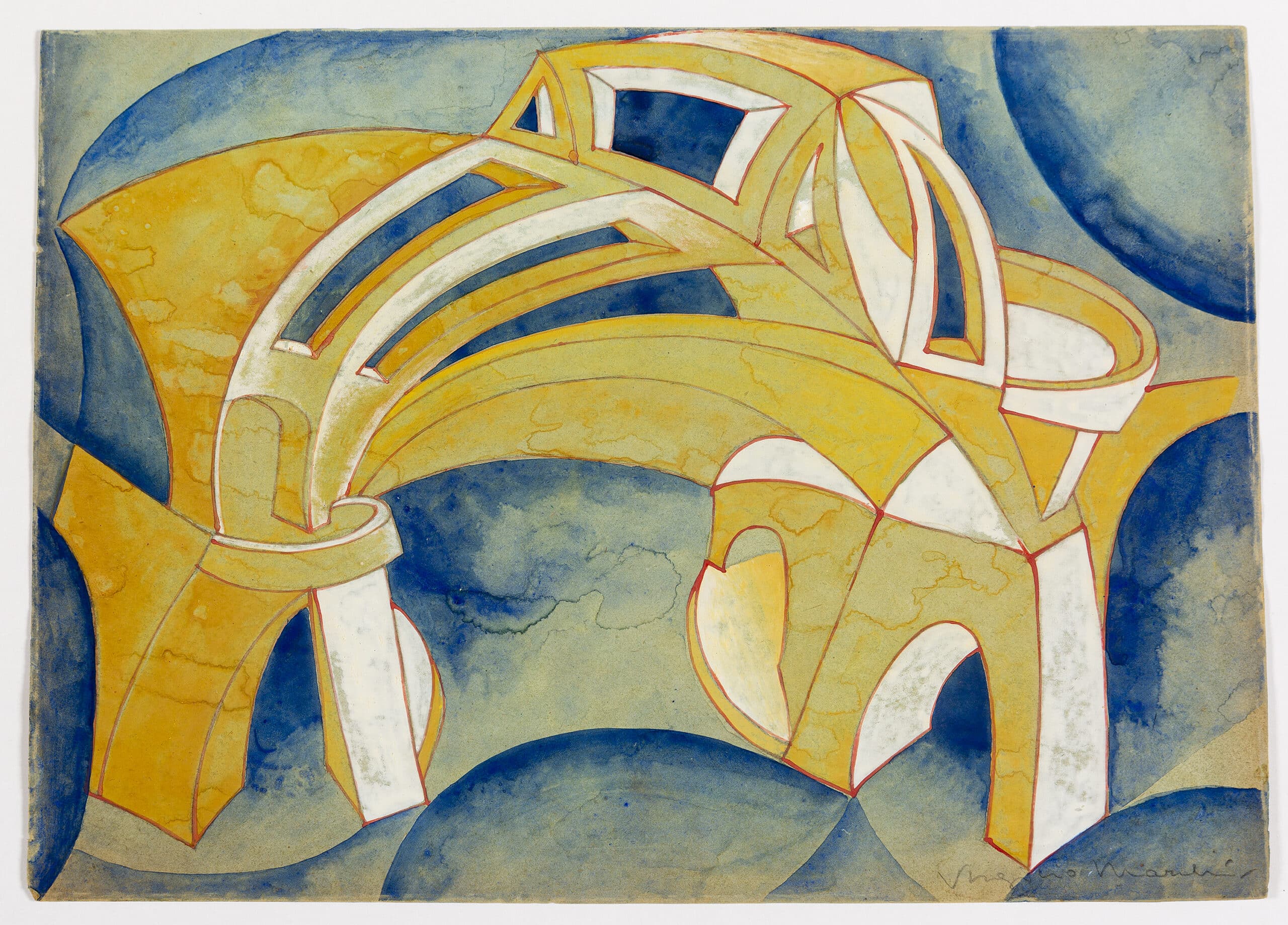 The earliest work of Virgilio Marchi held in the Drawing Matter collection is an untitled painting of a twisting and contorting architectural form. It is one of many imagined structures drawn and painted between 1919 and 1920, which often depicted structures from an ideal city. Another example is held in the collection of The Met in New York. Marchi was deeply engrossed in the concepts of both the German Expressionists and the Futurists, striving for a synthesis of all arts; in particular for Marchi in painting, architecture, music, theatre, and writing. He continually theorises and publicises the concept of Futurist architecture, aiming to continue the work of Antonio Sant’Elia in his Manifesto dell’Architettura Futurista first published in 1914, he writes Architettura futurista ten years later; followed in 1931 by Italia Nuova Architettura Nuova Seguito di Architettura Futurista (DMC 3038), its lineage marked through a reprint of Sant’Elia’s original text.