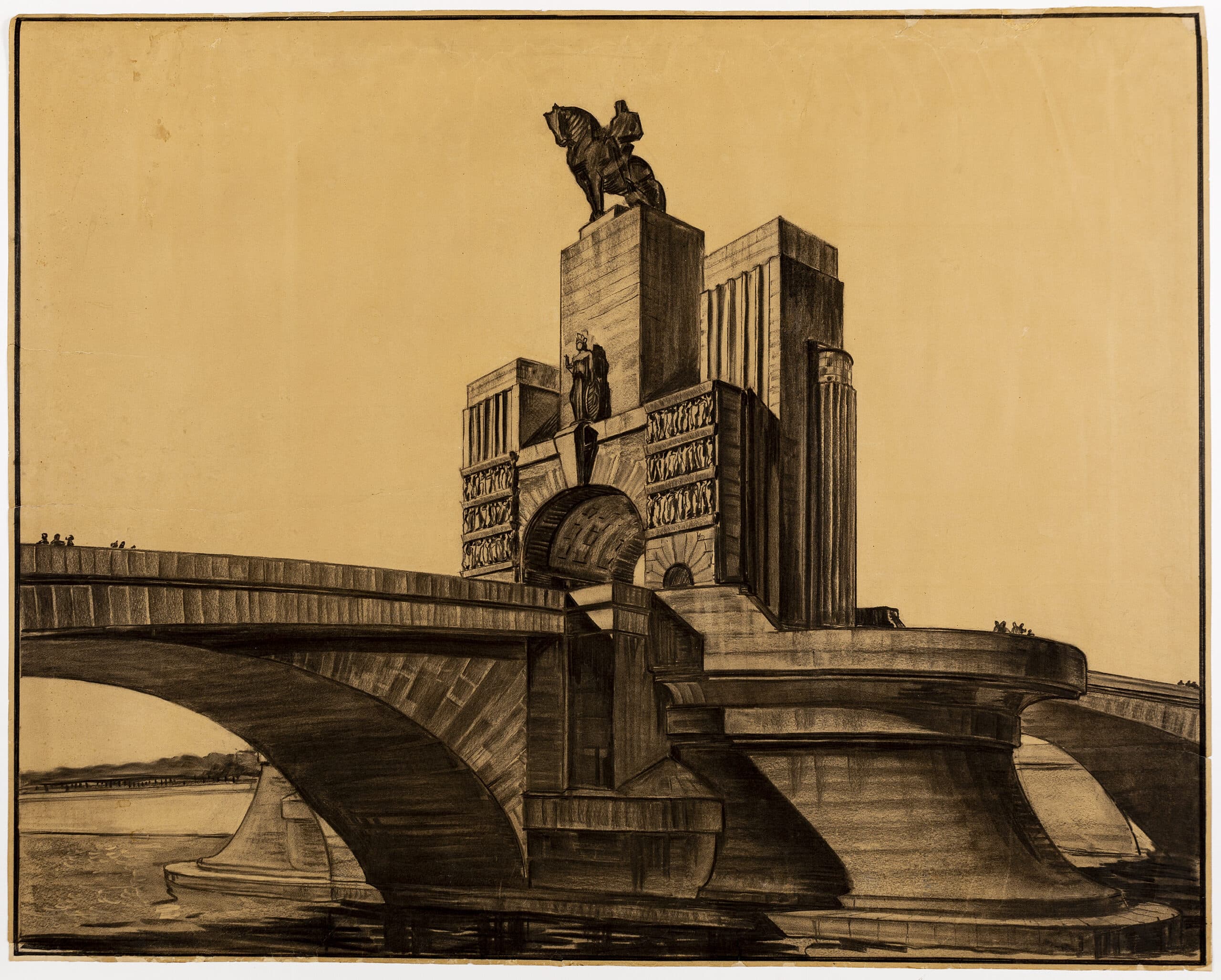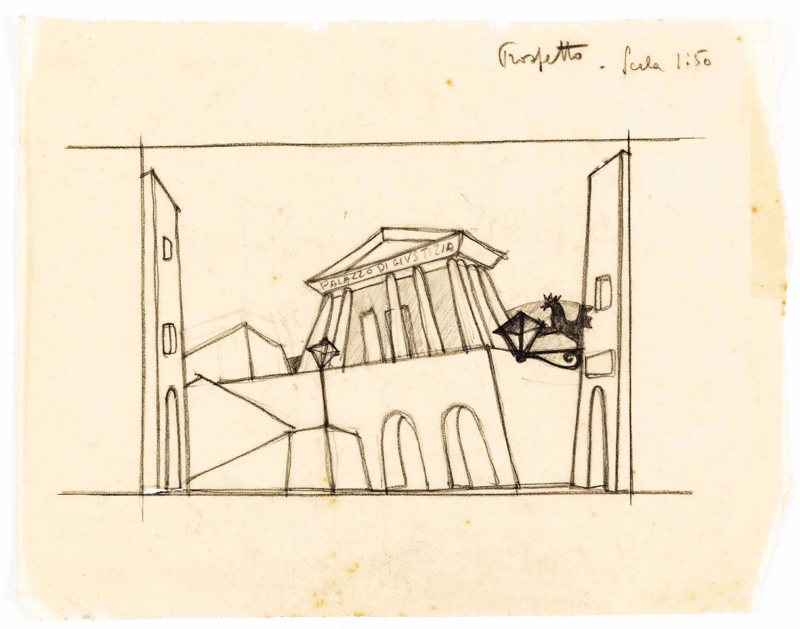 The collection holds two drawings for a bridge surmounted with a monumental arch by the architect Adolfo Coppedè. The design conceived in 1930 is seemingly part of Rome’s bid for the 1936 Olympics. They withdrew from consideration the night before the result, allowing Berlin to host the games. Equally, the bridge could be an alternative to the design of the Ponte Duca d’Aosta executed by Vincenzo Fasolo and Antonio Martinelli (1936-1939), as part of the masterplan conceived by Enrico Del Debbio for the Foro Italico (1927) (formerly Foro Mussolini). The new ‘citadel’ for sport was conceived between the slopes of Monte Mario and Ponte Milvio, at the bend of the Tiber, constructed to support subsequent Olympic bids; the 1940 and 1944 games did not take place due to the Second World War.
