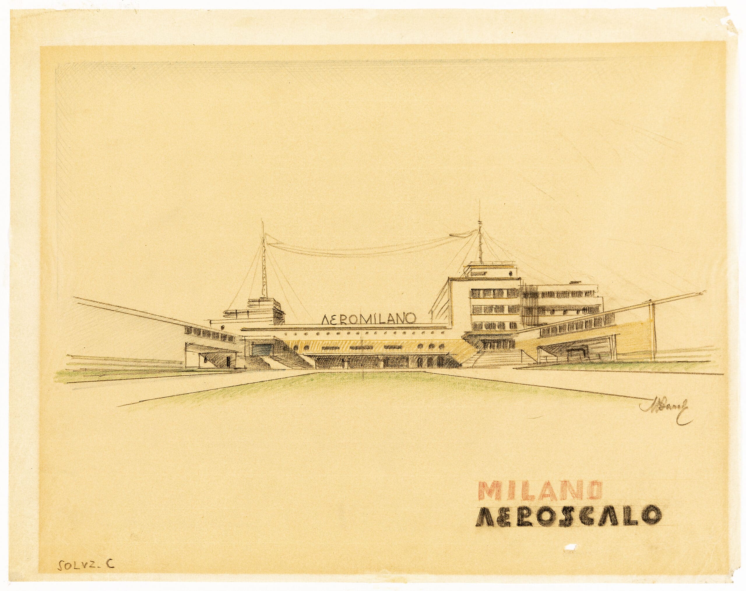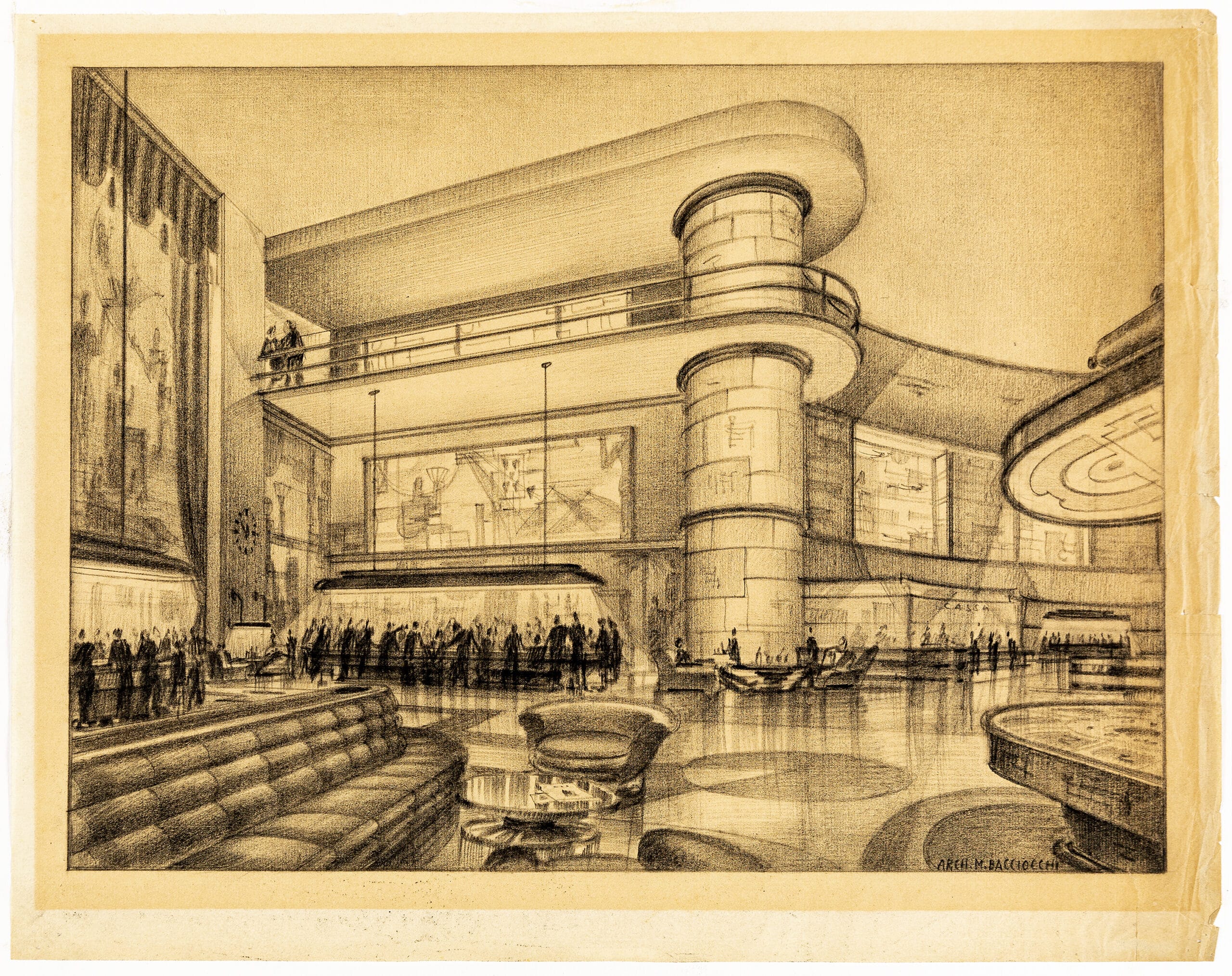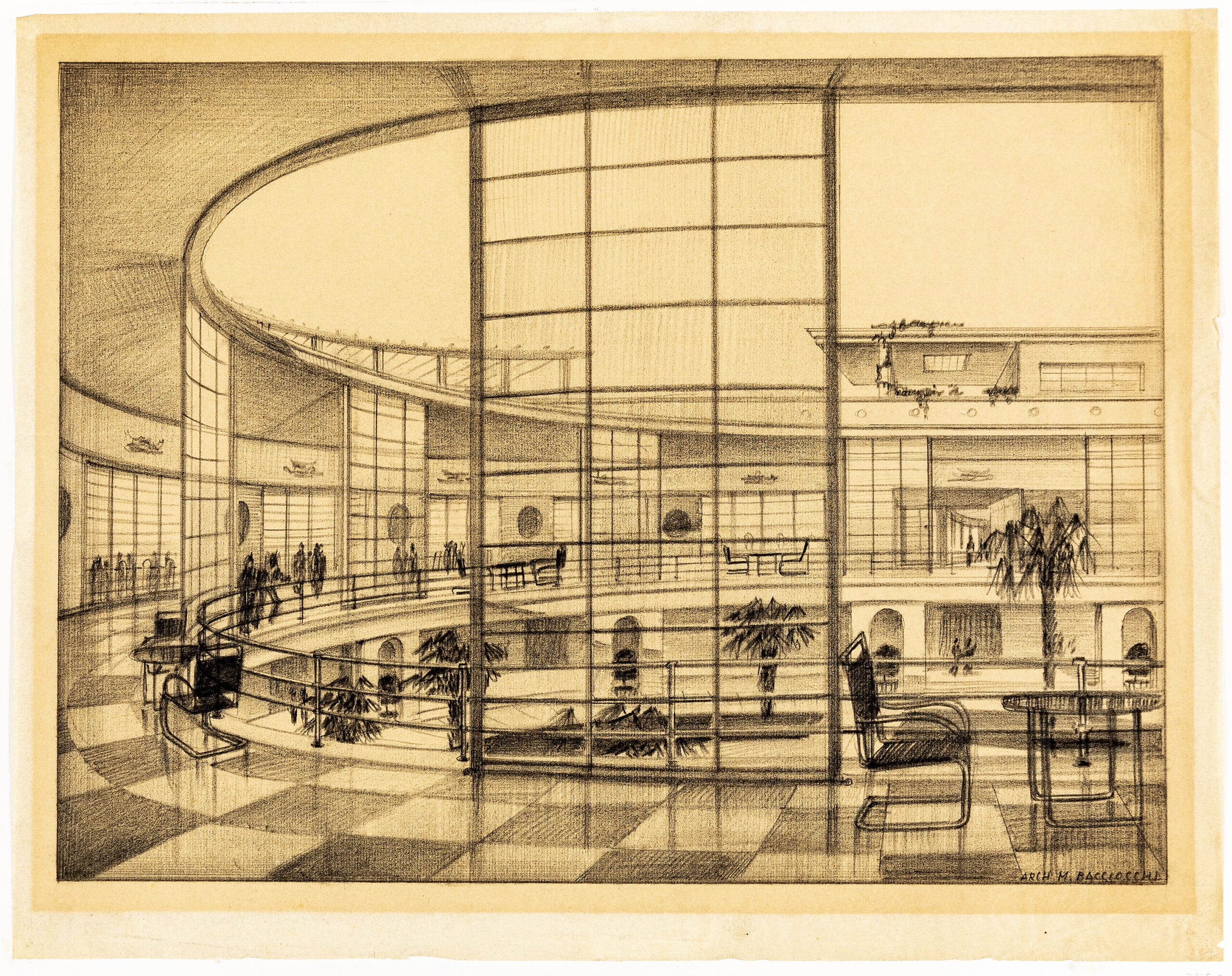 Drawing Matter holds six perspective drawings by Mario Bacciocchi for the Milan Aeroscalo, a sports centre, a casino and a resort hotel. Bacciocchi was working from the 1920s into the 1950s in northern Italy; he is most famous for his sweeping curvilinear design of the AGIP petrol station in Piazzale Accursio, Milan.
