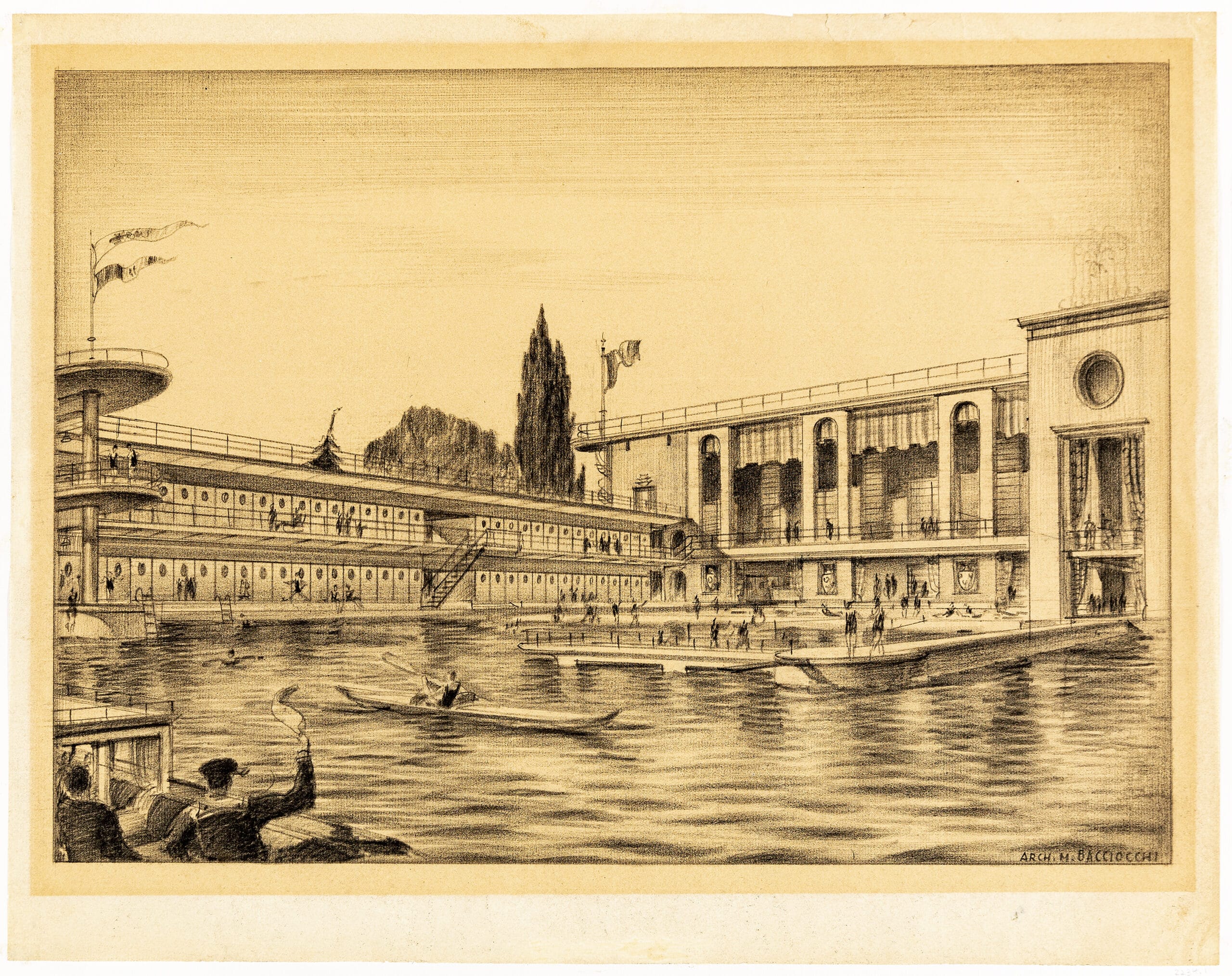 The drawing for the sports centre, DMC 2234.1 depicts an open-air pool filled with swimmers, divers, and canoeing, framed by two connecting structures. To the left a lower lying building with two storeys for changing rooms abutted against a more monumental building, its facade divided by three arches, each of its openings theatrically draped with curtains. The project is unknown but speaks to multiple projects undertaken by Bacciocchi into the 1930s, such as the stadium and thermal baths proposed in 1933 for Milan, designed whilst working under Giuseppe de Finetti. It was a project where the sports facility instigated larger urban renewal; Bacciocchi then proposed vast areas around the stadium to be reorganised—a rational arm reaching into the regional territory of the city. It is unknown whether the other drawings by Bacciocchi at Drawing Matter have any connection to specific projects.