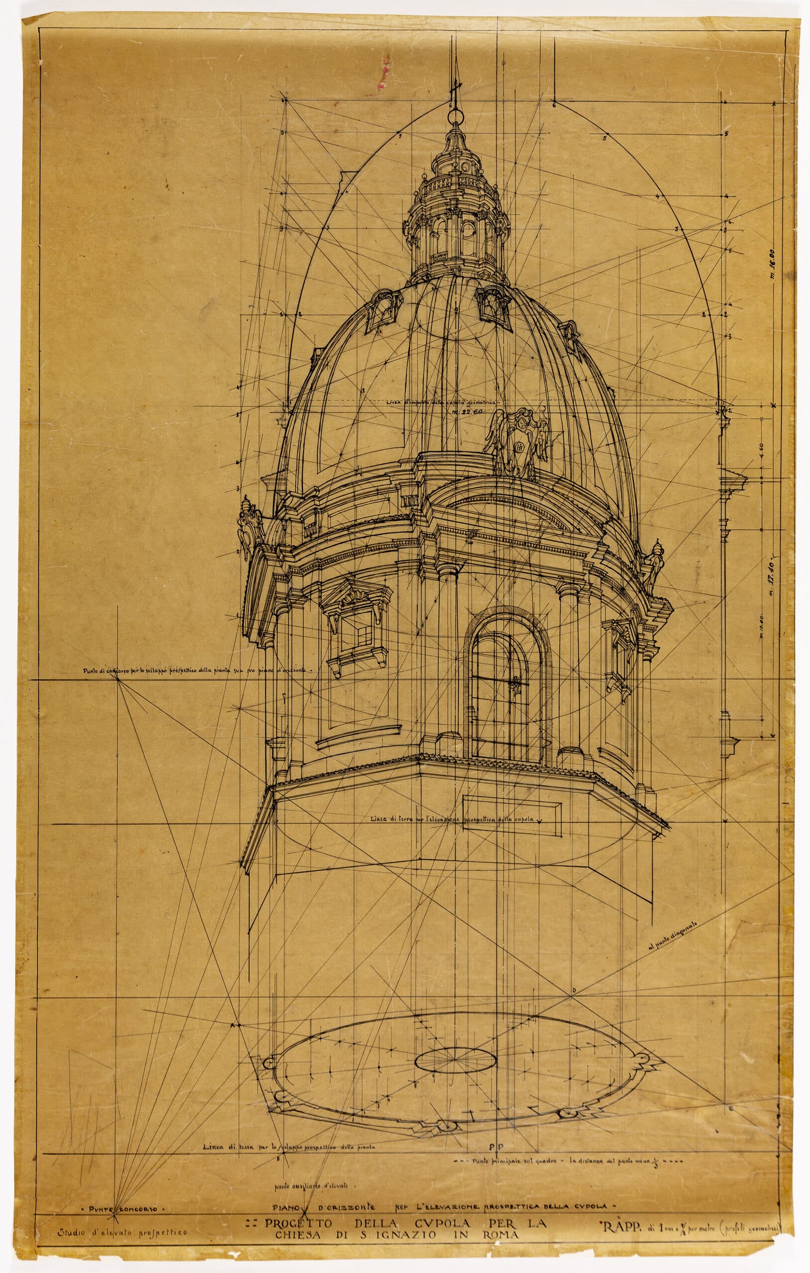 Armando Brasini proposed a new dome for the Chiesa di Sant’Ignazio in Rome. The design was inspired by other lantern domes of the city, such as Rosato Rosati’s San Carlo ai Catinari. The dome was part of a wider scheme for a vast forum in front of Monte Citorio. Another drawing for the project is held in the Armando Brasini Archive.