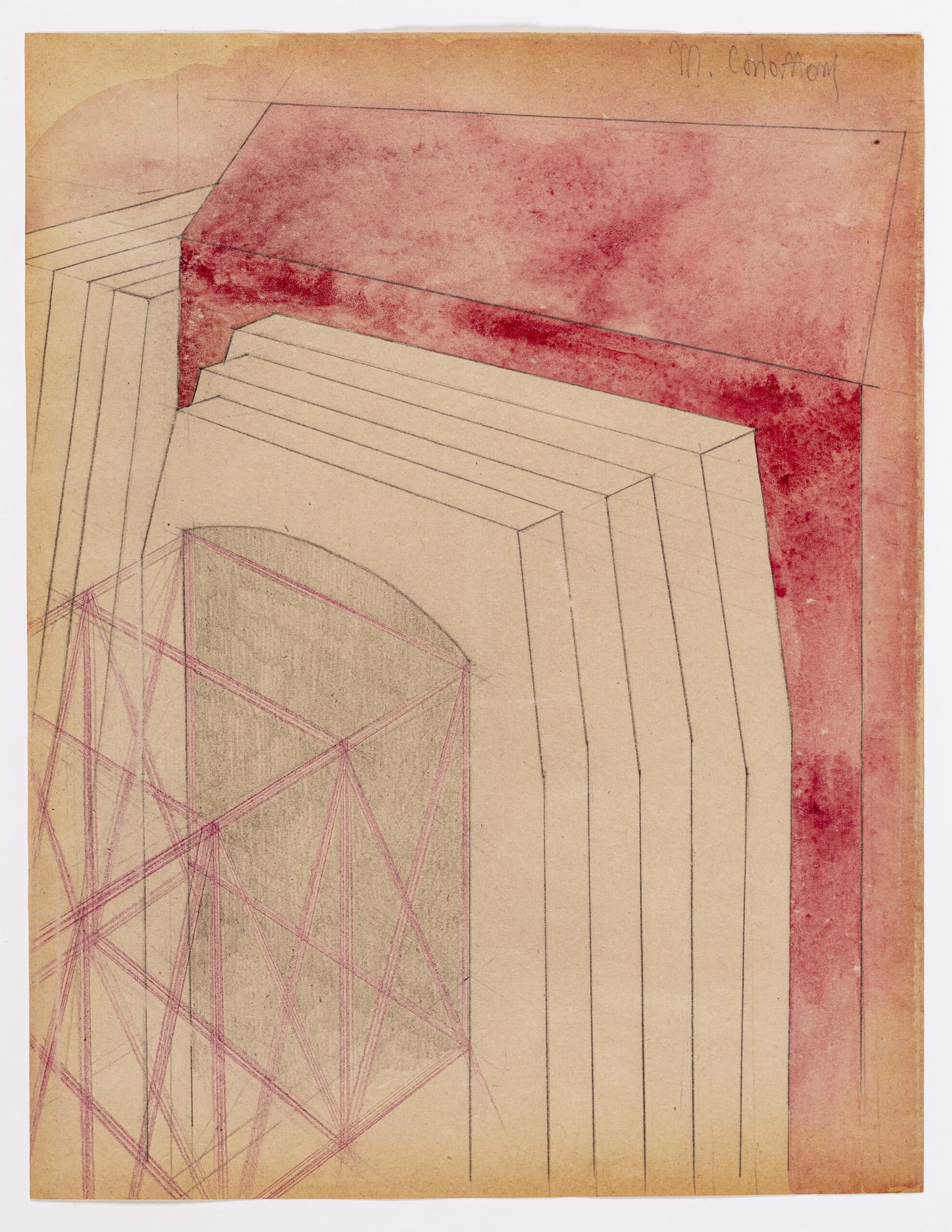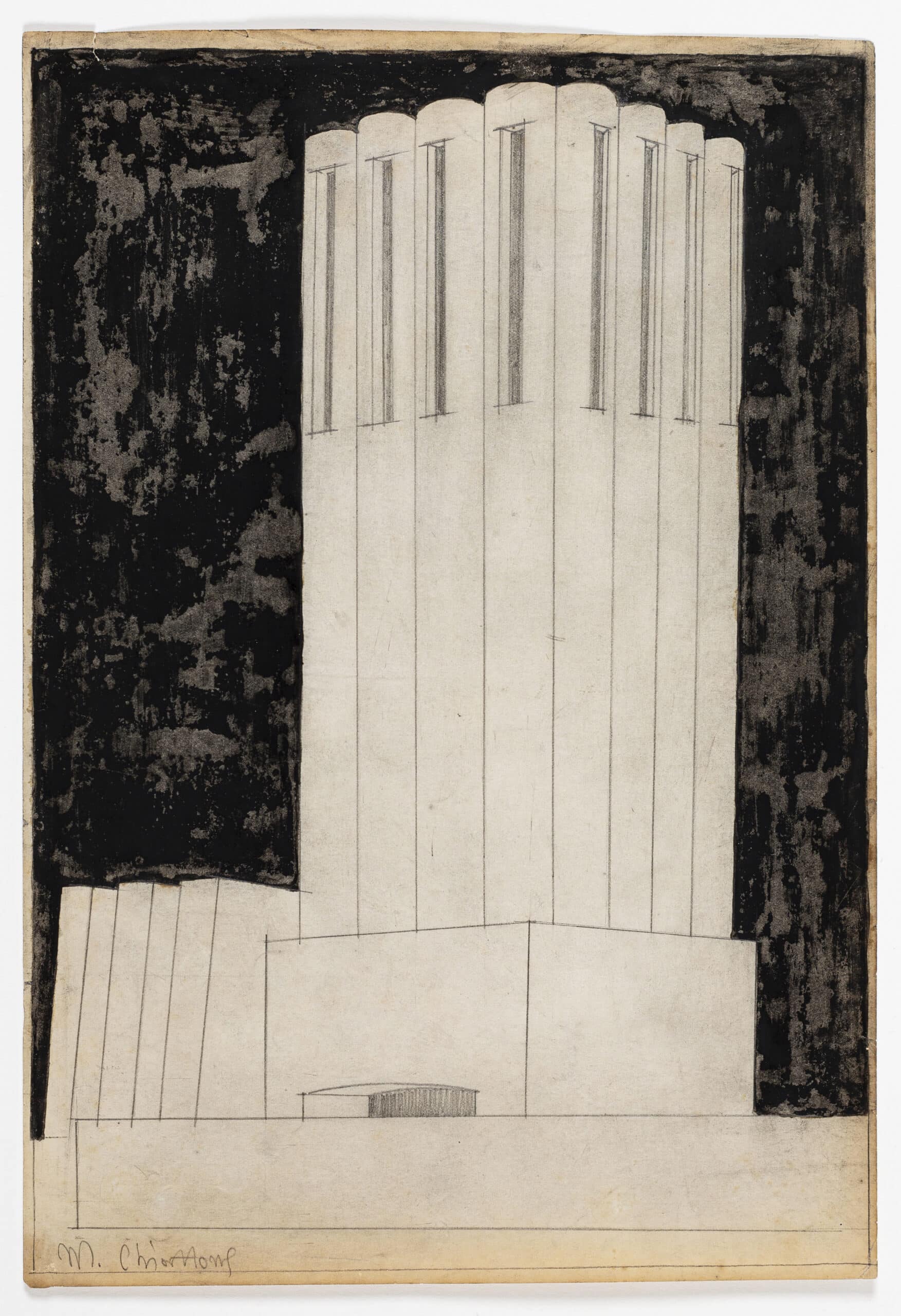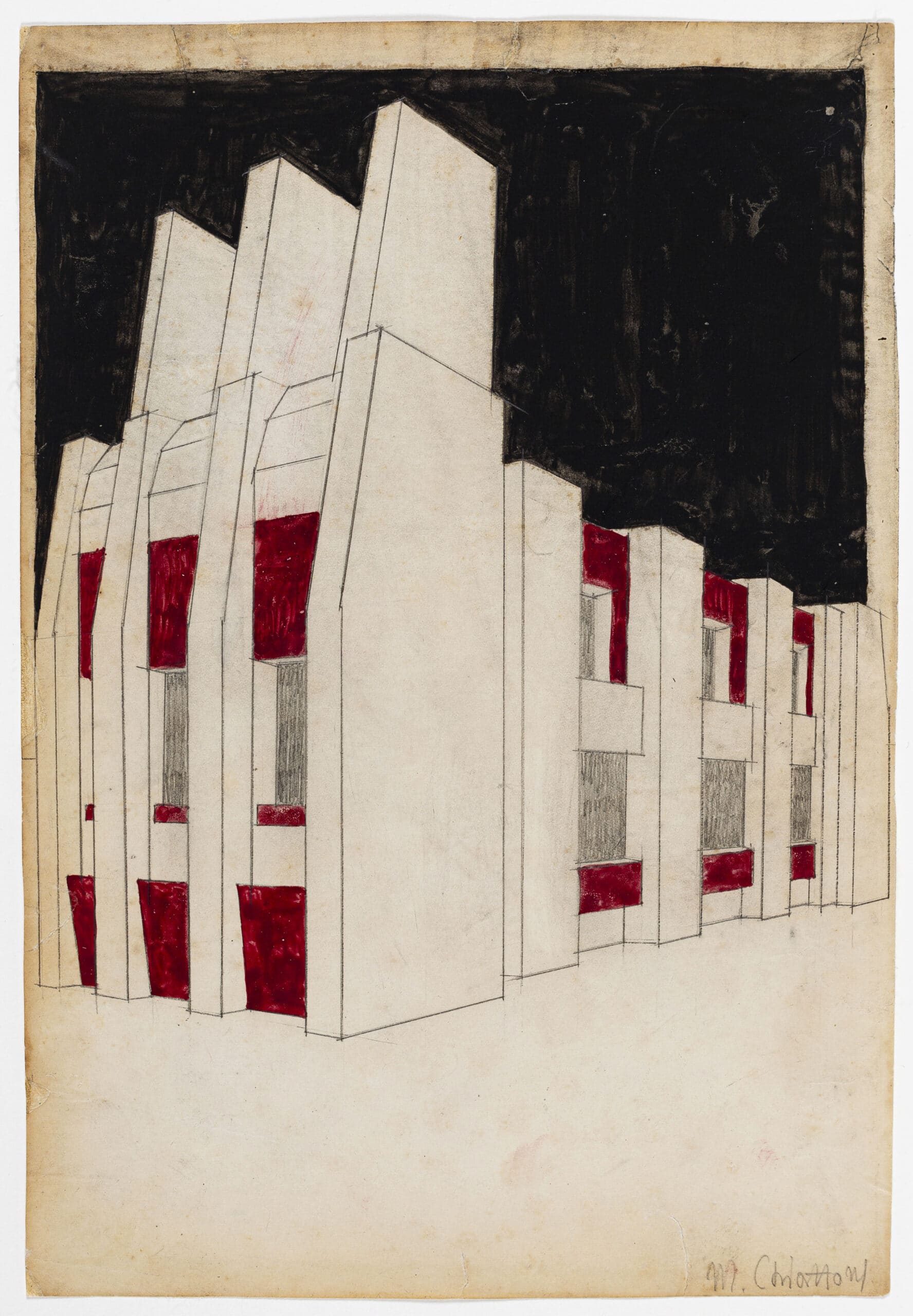 Drawing Matter holds three pencil and gouache studies by Mario Chiattone. He was a Ticinese architect based in Milan and from 1914 to 1915, he worked closely with Antonio Sant’Elia. In the spring of 1914, the pair prepared plates that were exhibited at Nuove Tendenze. It is suggested that Chiattone displayed three plates in the show, entitled Construzioni per una metropoli moderna (‘constructions for a modern metropolis’), Opificio (‘factory’), and Forme (‘form’). Although never formally part of the Futurist group, Chiattone and Sant’Elia collaborated on a few imagined urban schemes. Their collective style was deeply influenced by Otto Wagner’s drawings.