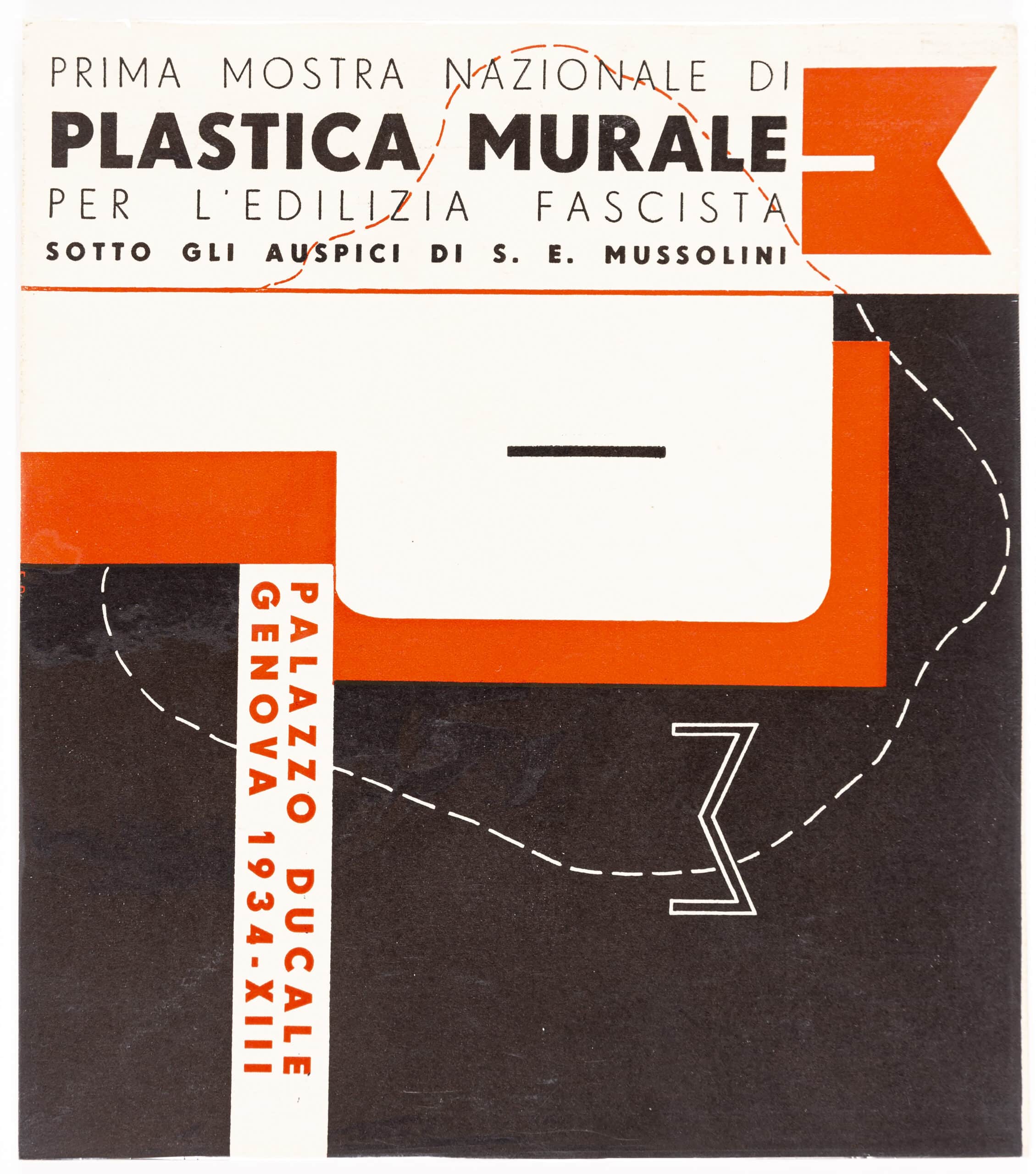 Exhibition catalogue of the Prima Mostra Nazionale di Plastica Murale per l’edilizia Fascista (first national exhibition of mural arts for fascist construction), which was held in the November and December of 1934 at the Palazzo Ducale in Genova. It opens with a text by Filippo Tommaso Marinetti titled Plastica murale e fascismo ispiratore (wall arts and inspiring fascism), followed by images of artworks, graphics, and the show’s exhibition spaces. It was a commercial publication, made evident through the adverts which feature in the back pages.