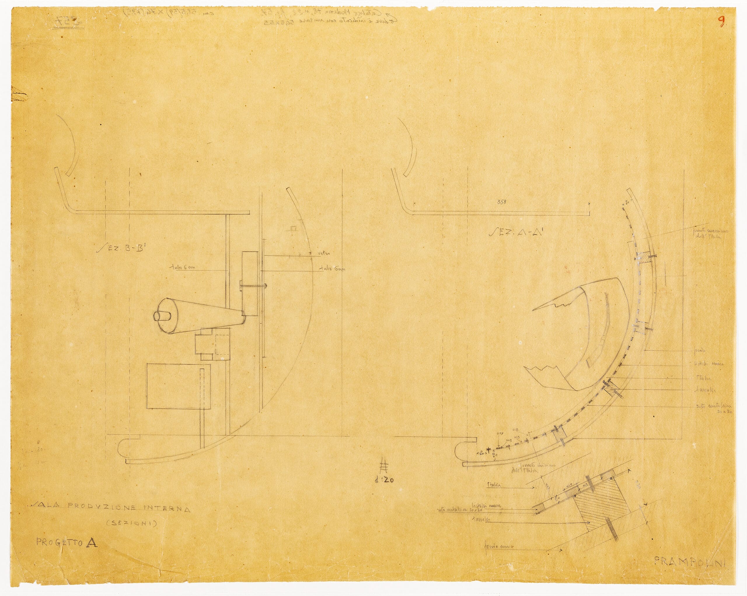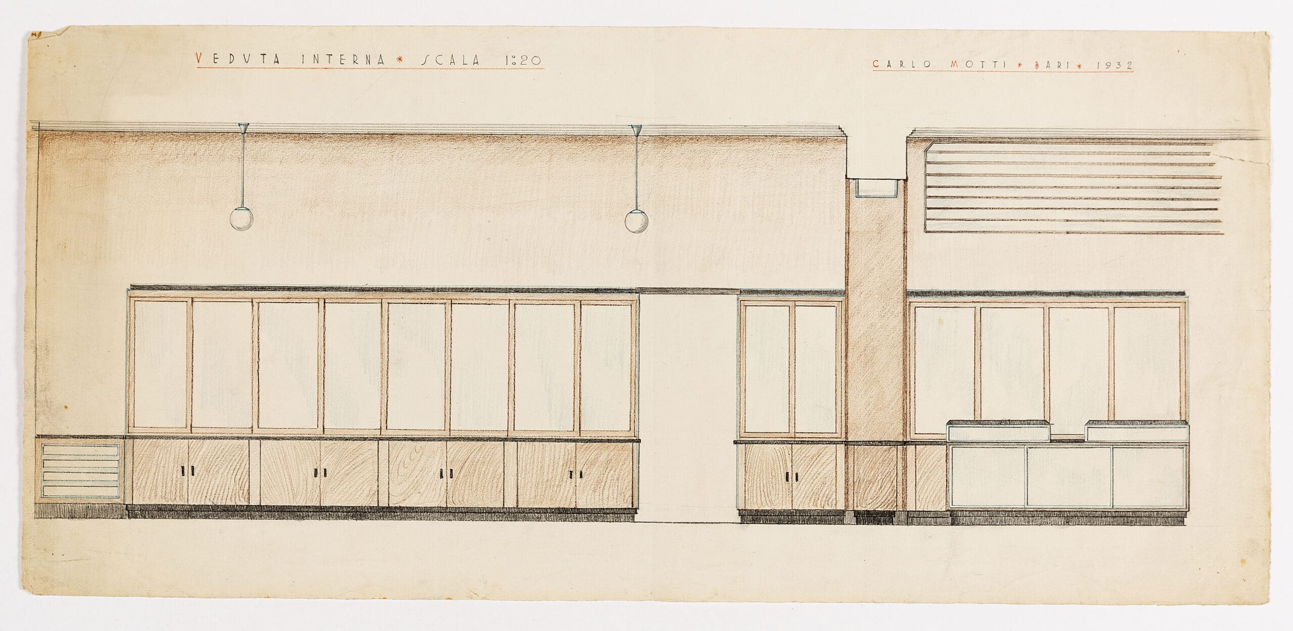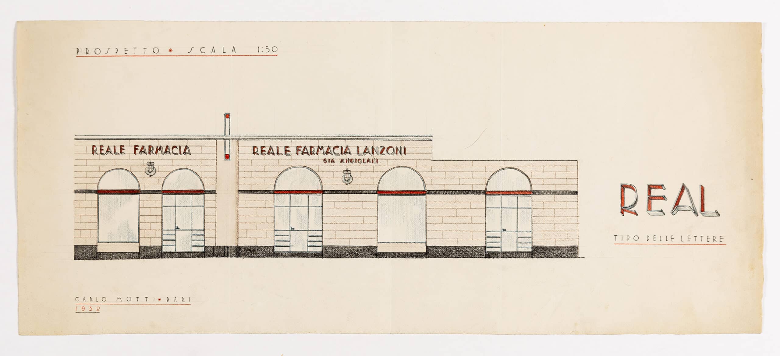 Two drawings by Carlo Motti for a pharmacy, an elevation and section at differing scales. The elevation at 1:50 depicts the shop’s facade, an asymmetrical arrangement of glass arches, cut by a red cornice. It is unclear but the treatment of the dropped roof suggests Motti’s design will sit on the ground level of an existing building. To the left of the drawing the three-dimensionality of the facade’s signage is indicated. The sign ‘Reale Farmacia Lanzoni’ (‘Royal Pharmacy Lanzoni’) suggests that it was a state run pharmacy. ‘Lanzoni’ is potentially the name of the family who own the shop, most likely the pharmacist’s name written below, Gia Angiolani. The interior section focuses on the cabinetry of the space, low wooden cupboards with glass cabinets above. Little is known of Motti, apart from what is indicated on the drawing: that he was working in Bari.