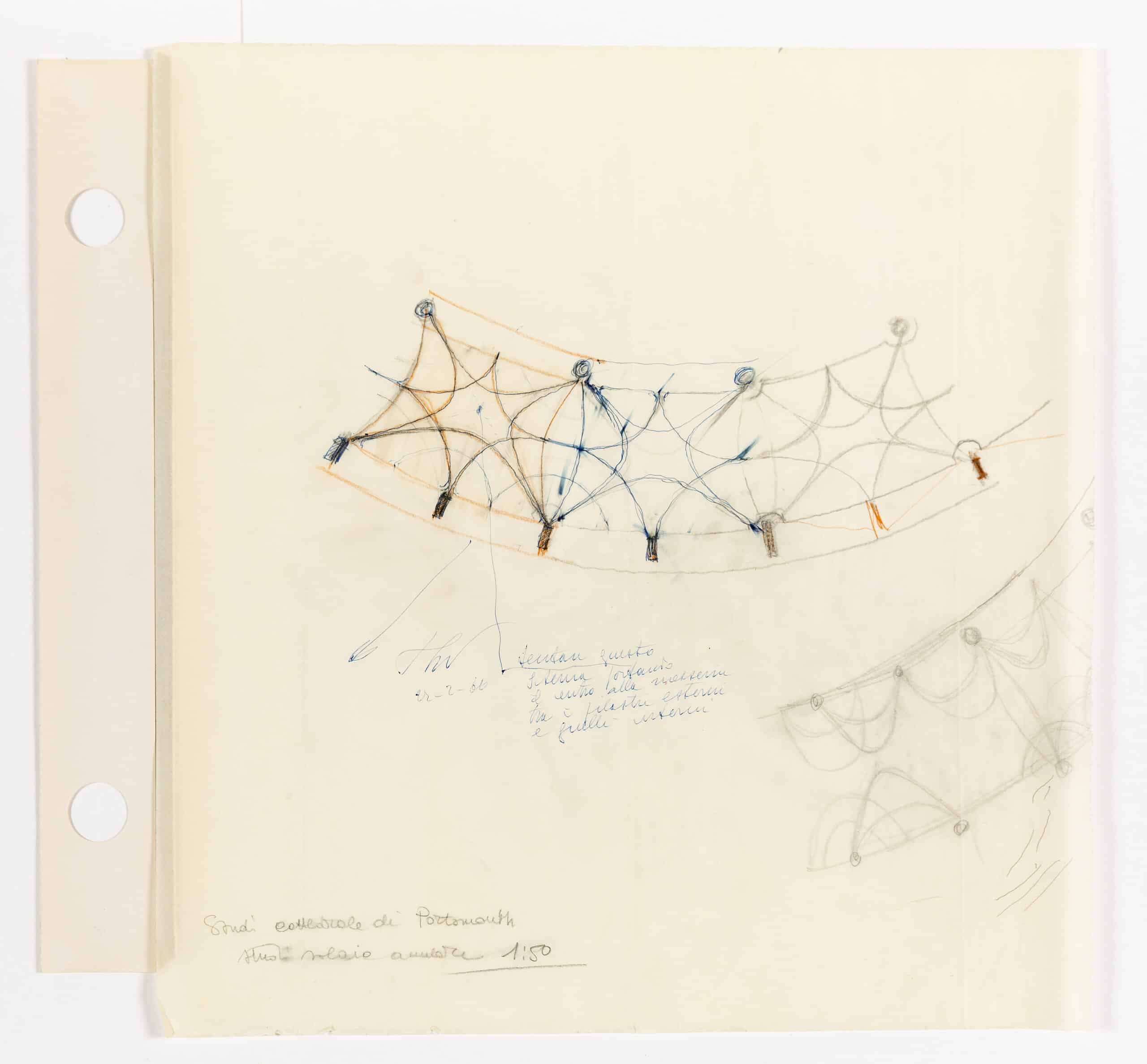 Drawing Matter holds a single sketch by the engineer Pier Luigi Nervi, for the proposed extension of Portsmouth Cathedral. Architect Charles Nicholson had planned a series of works for the newly designated cathedral in 1935, yet construction work halted due to the start of the Second World War. In 1966, a new scheme was proposed by Seely & Paget, with Pier Luigi Nervi as the consultant engineer; the design was supported by the architectural critic Nicholas Pevsner.
