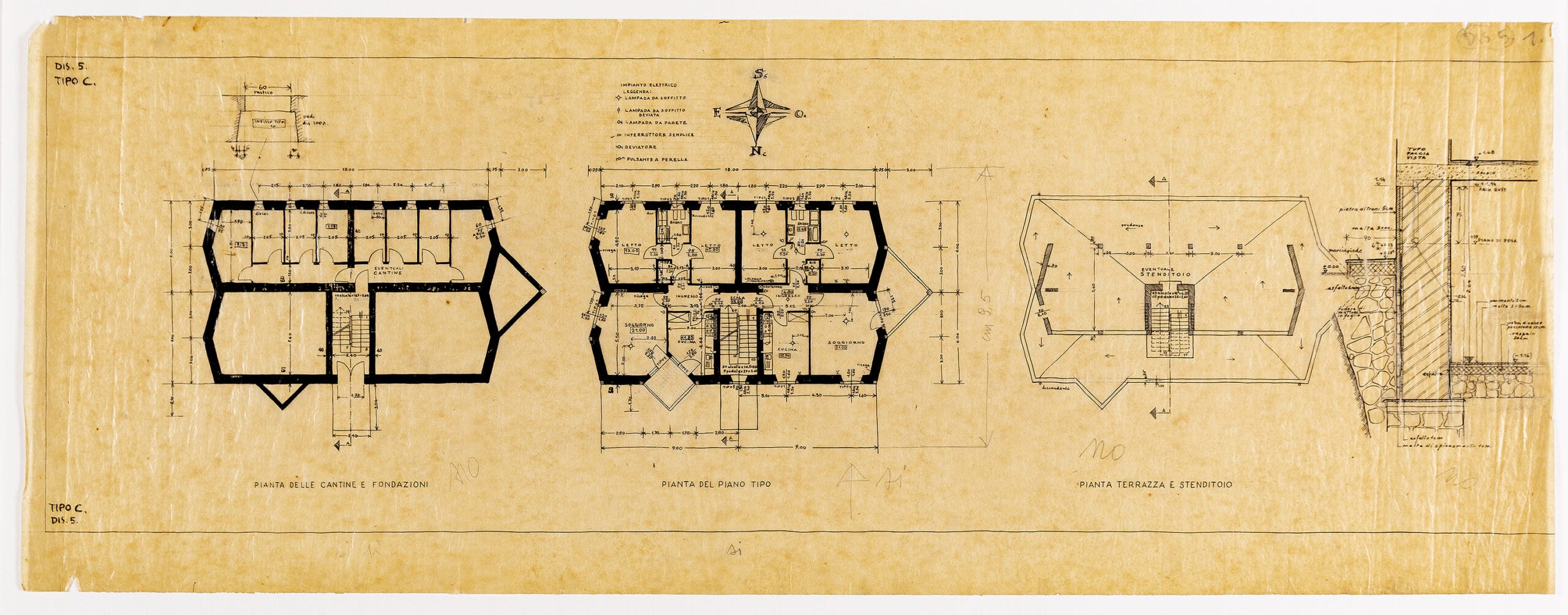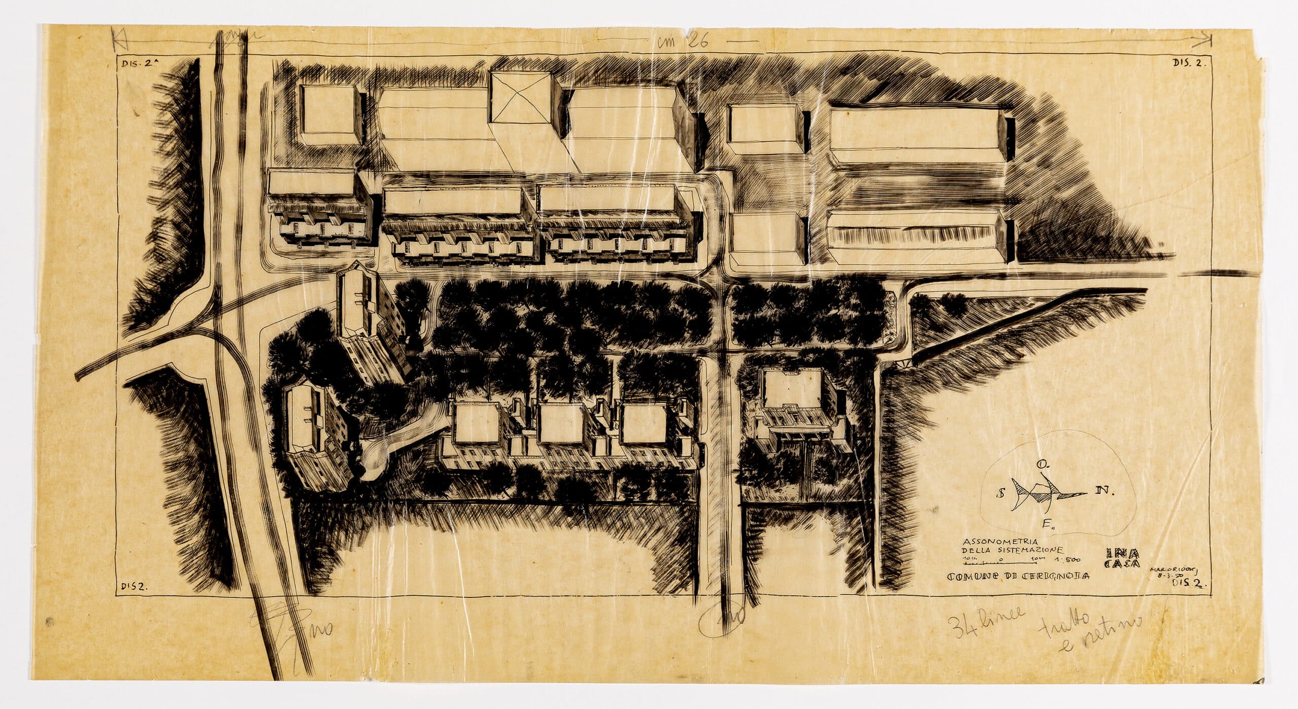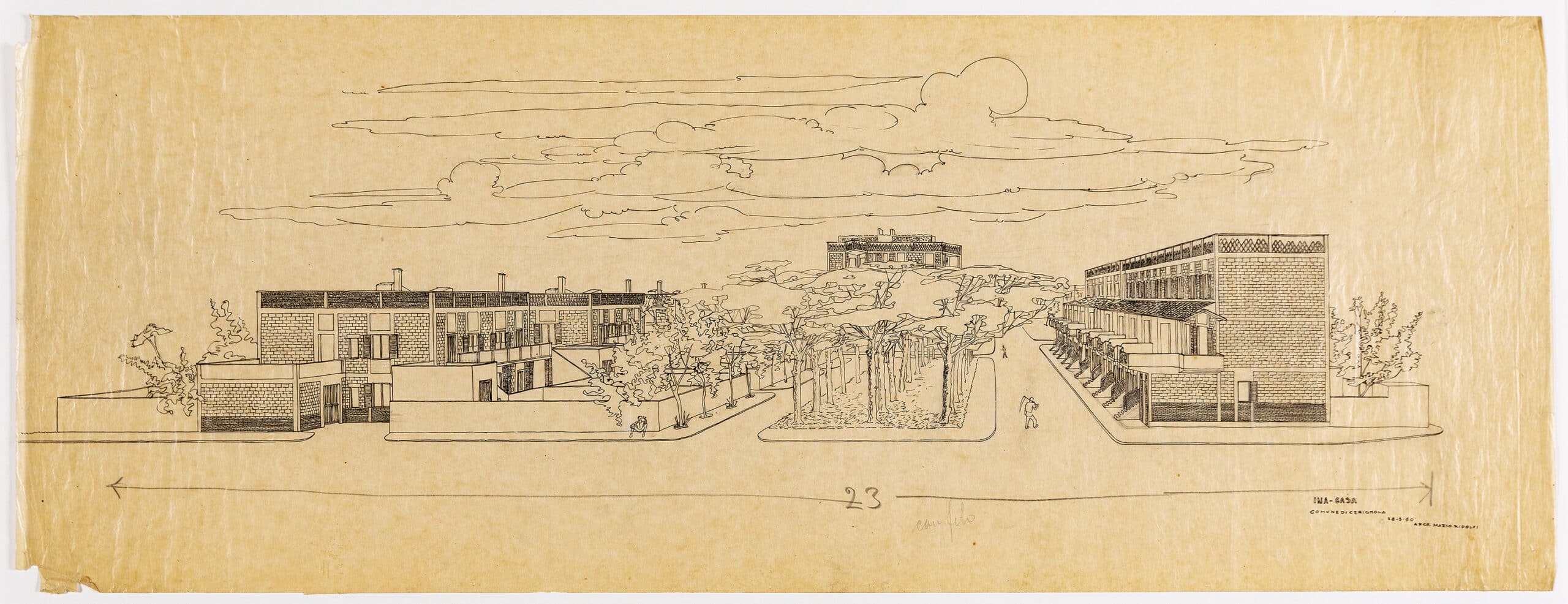 The drawings are marked with the acronym ‘I.N.A Casa’, which refers to the Istituto Nazionale delle Assicurazioni (National Insurance Institute), who had conceived of an initiative to counteract widespread unemployment and the need for social housing in the aftermath of the Second World War. Mario Ridolfi had already started on an I.N.A housing scheme in the neighbourhood of Tiburtino, Rome, with Carlo Aymonino, when he and Wolfgang Frankl received the commission from the council of Cerignola. Both the Rome and Cerignola schemes were built.