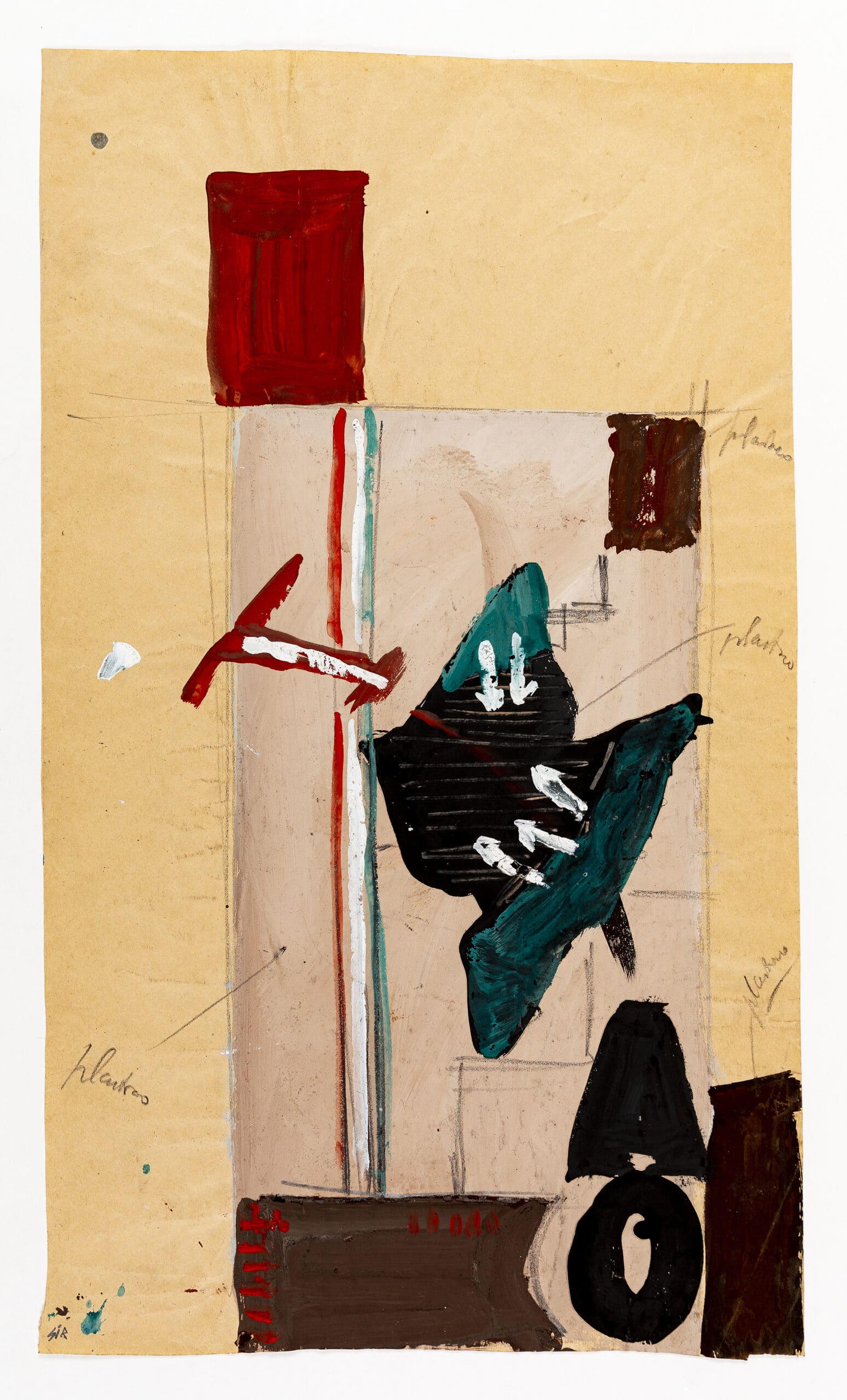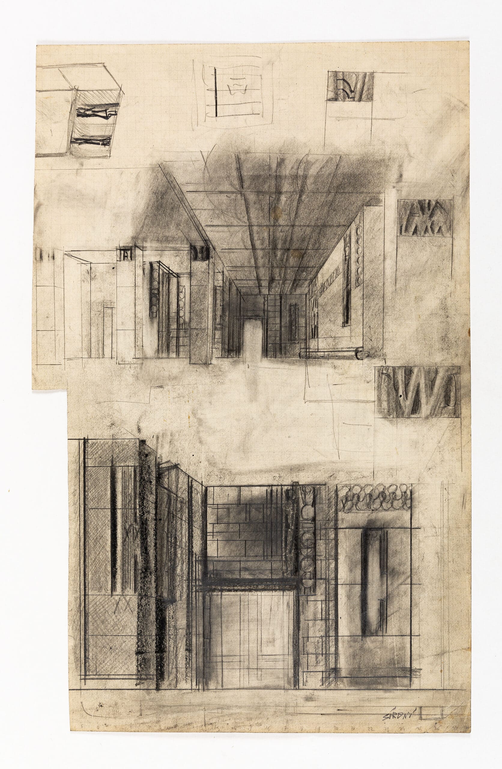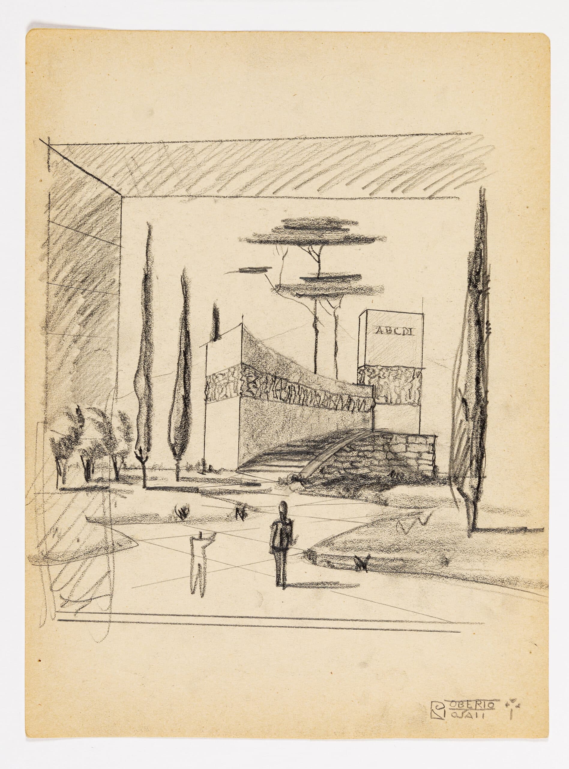 In 1937, Sironi designed the Overseas Italian pavilion at the Paris International Exposition (DMC 2037.9). Through the interior, in blue pencil, the letters ‘A.O’ appear again, signalling the colonial exploits of Italy in Africa.