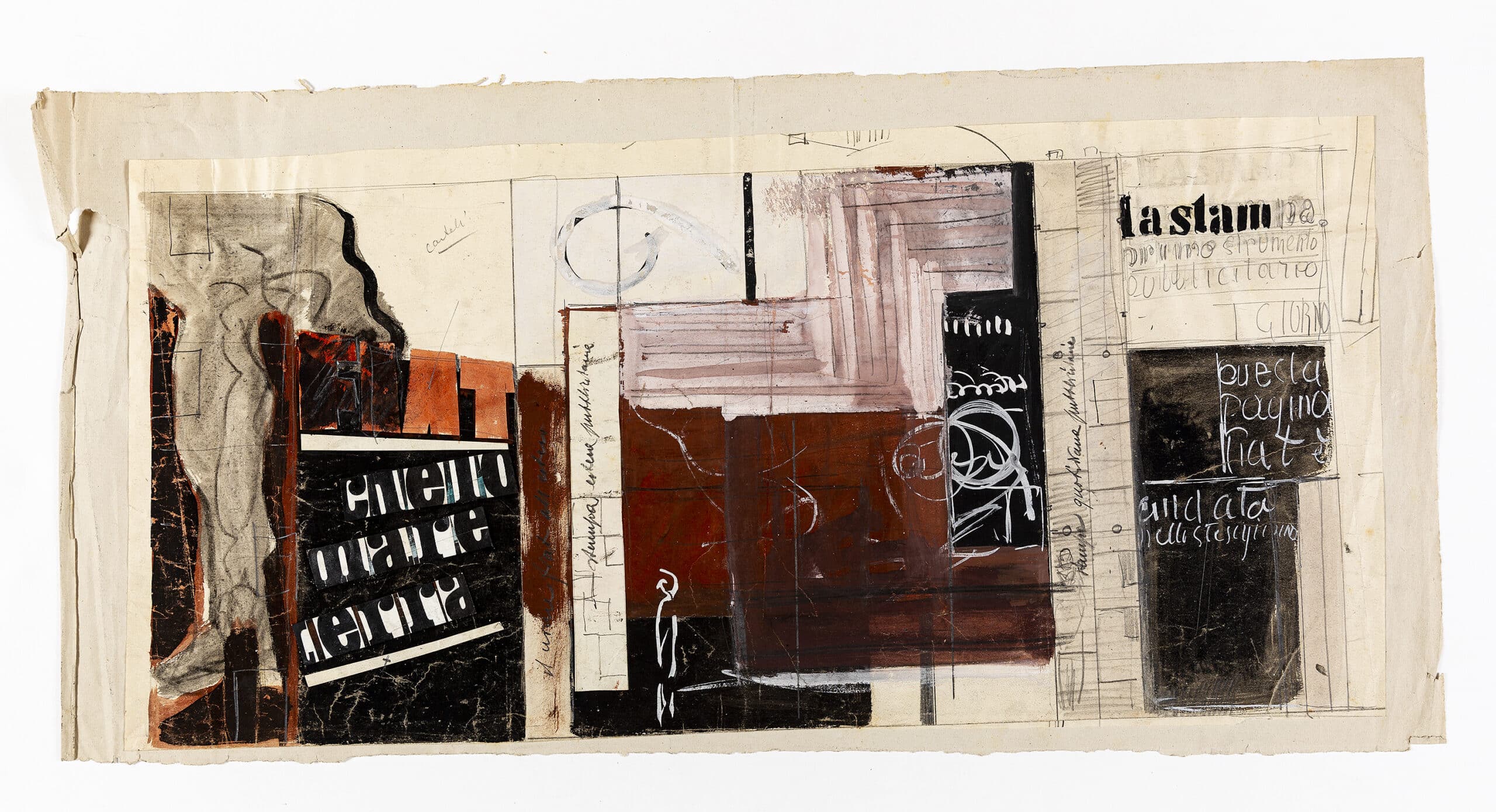 DMC 2071 is a study for the set-up of the Fiat room at the Mostra Nazionale del Cartellone e della Pubblicità al Palazzo delle Esposizioni di Roma, also held in 1936. It shows the design for a wall mural, where the Fiat logo is mixed with text from the newspaper La Stampa, and a mixture of figures and words. In 1933, Sironi had signed the Manifesto della Pittura Murale (‘manifesto for mural painting’), which stated that the highest purpose of art was to act as ‘a perfect instrument of spiritual direction’. Sironi believed the mural was the most effective way of teaching the masses.