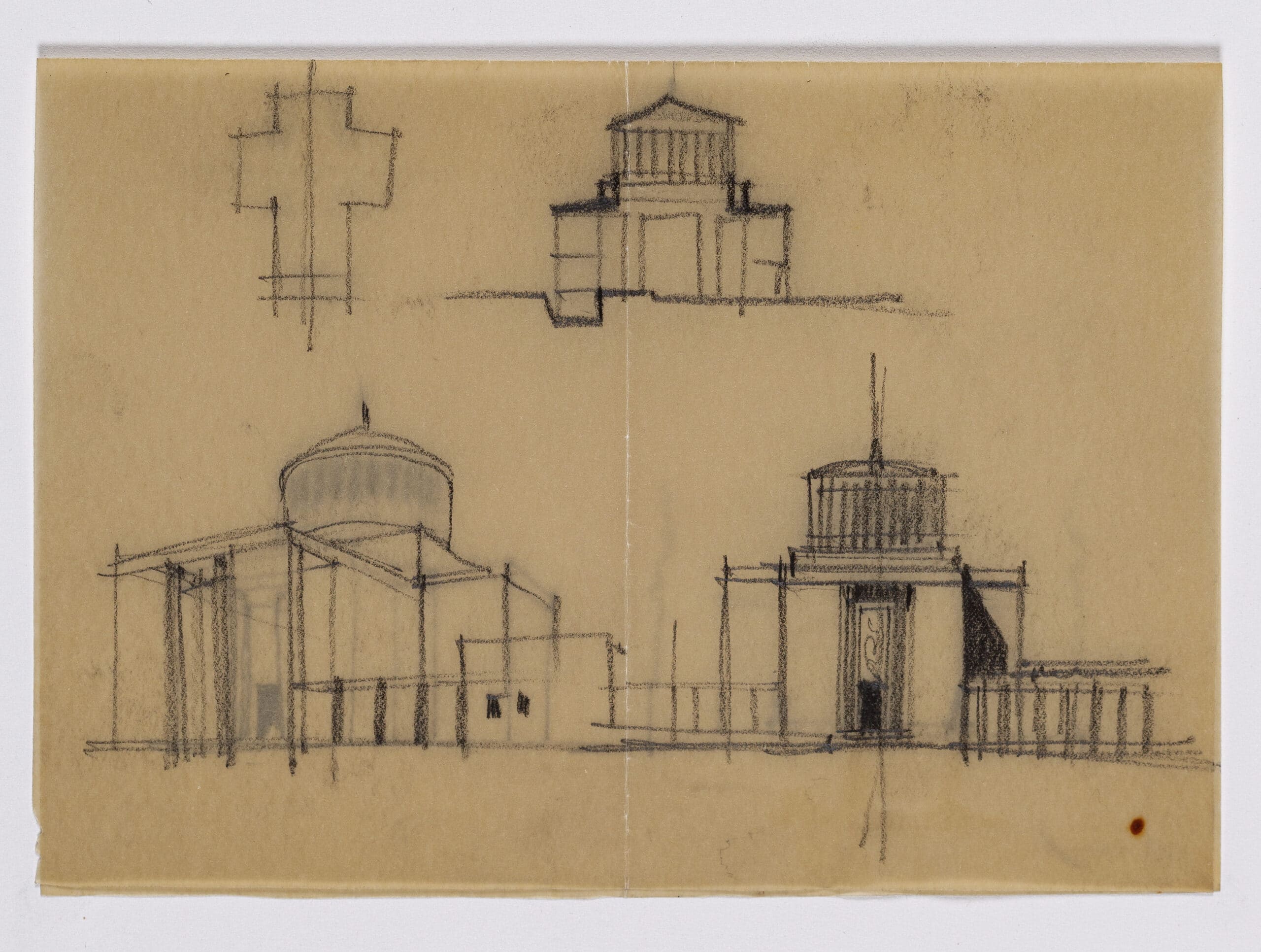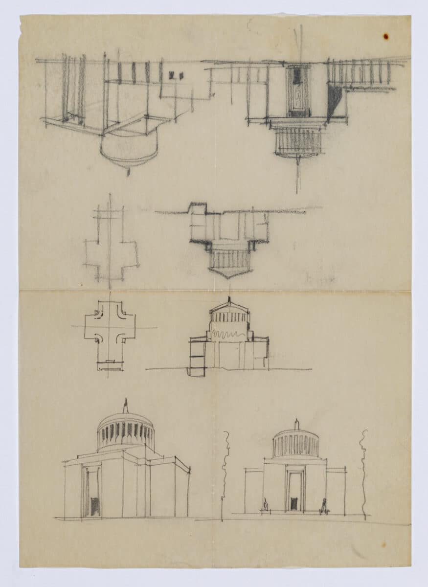 One folded sheet of sketches for the Chiesa di San Giovanni Bosco, which Rapisardi executed in the Tuscolano-Cinecittà district of Rome. Similar to the built work, the drawings depict a tripartite façade, surmounted with a monumental lantern dome. Rapisardi had previously designed the circular church Chiesa di San Tommaso al Pantheon in Syracuse in 1919.
