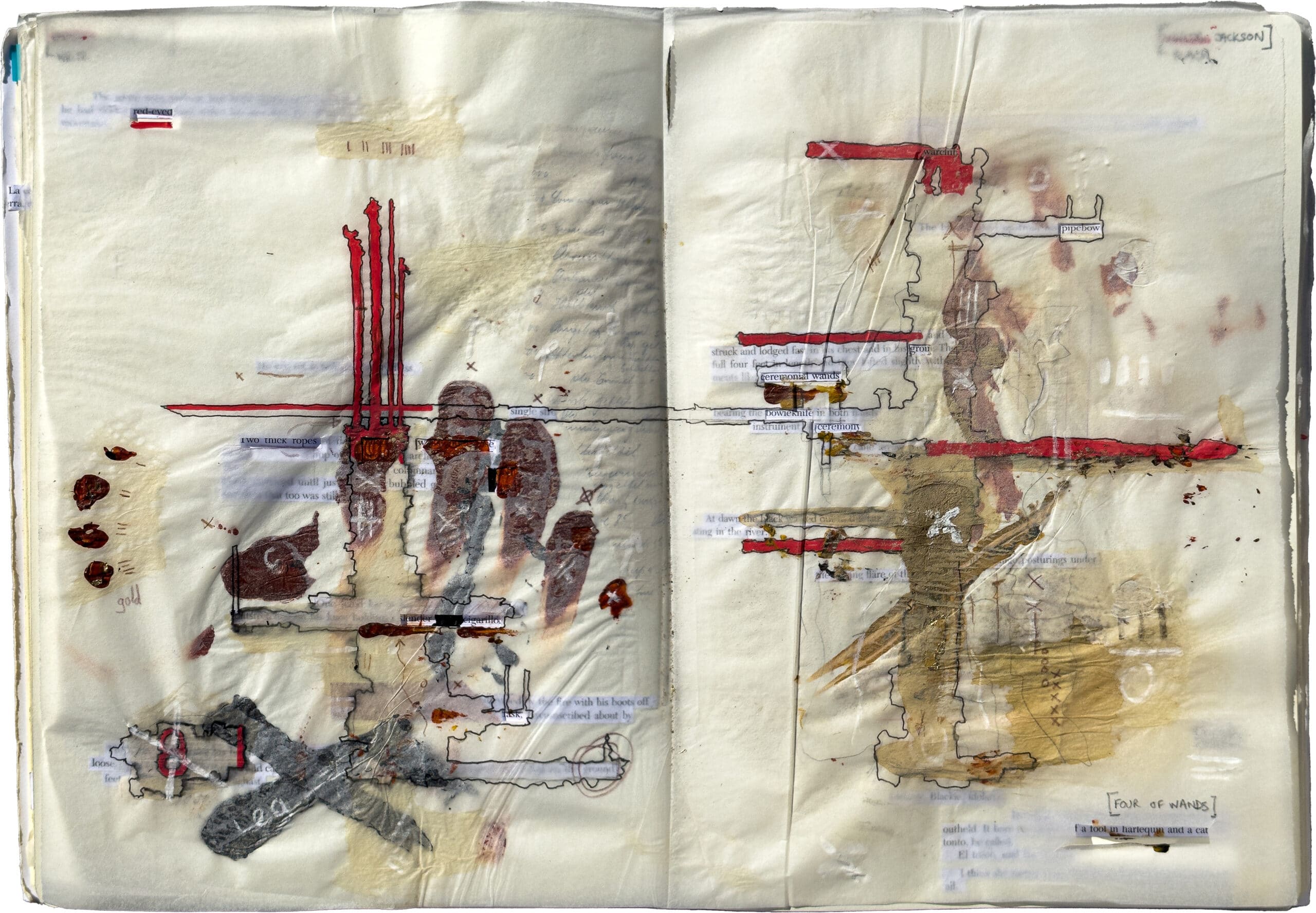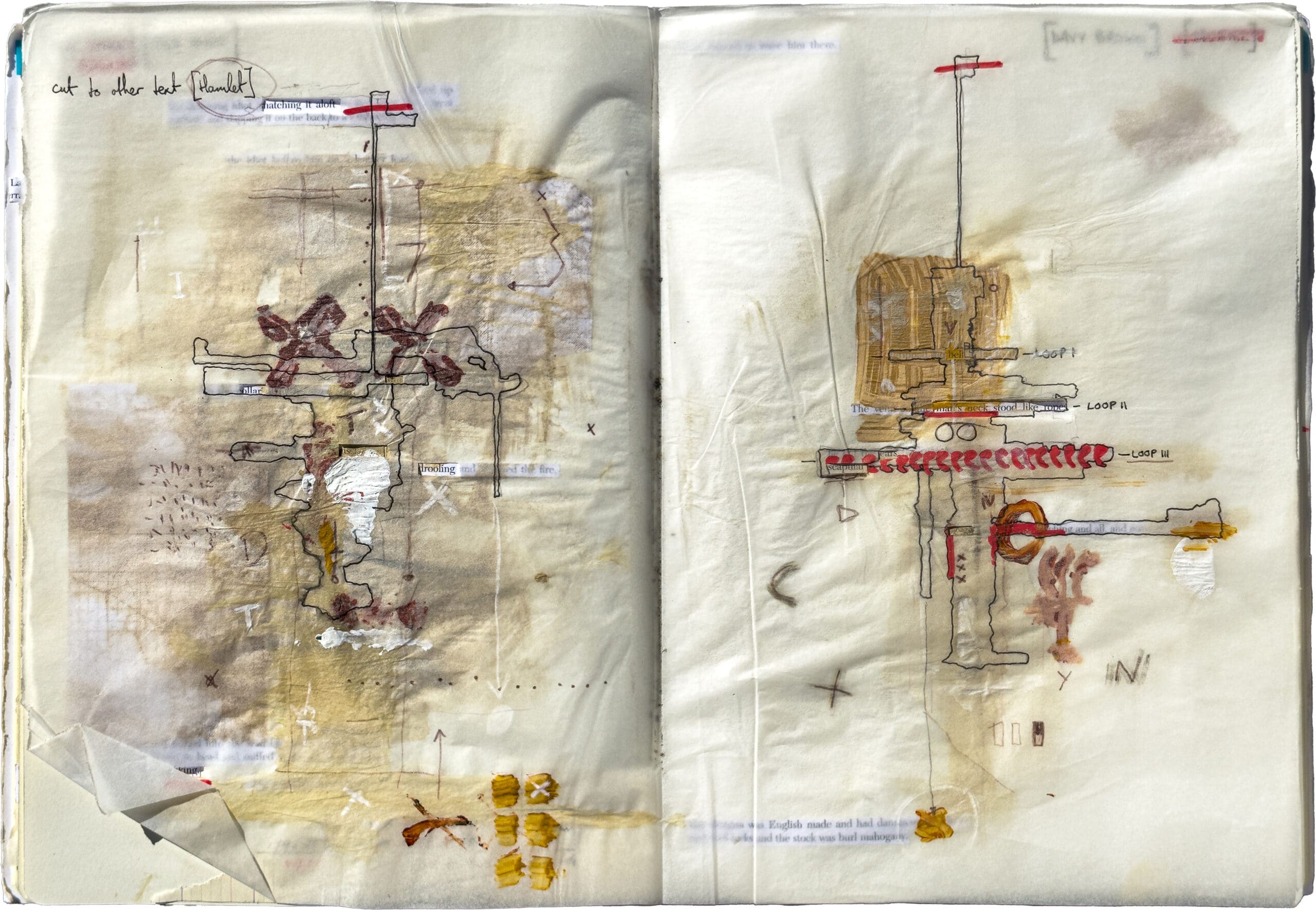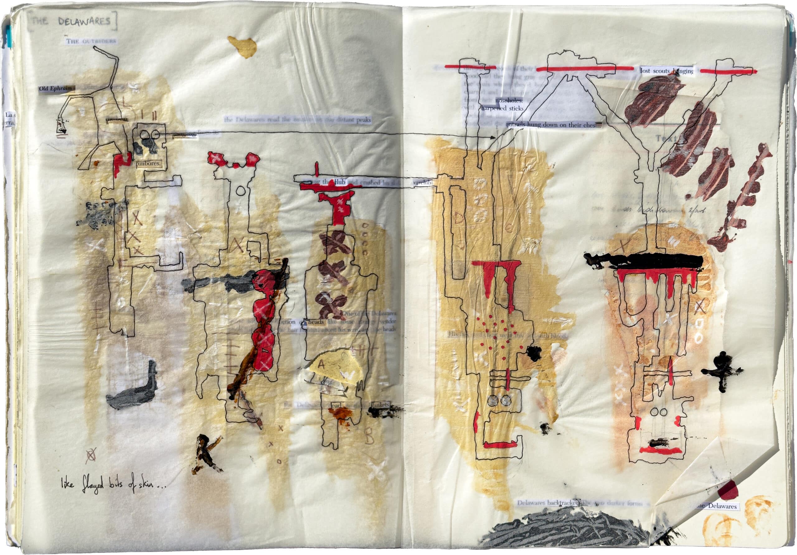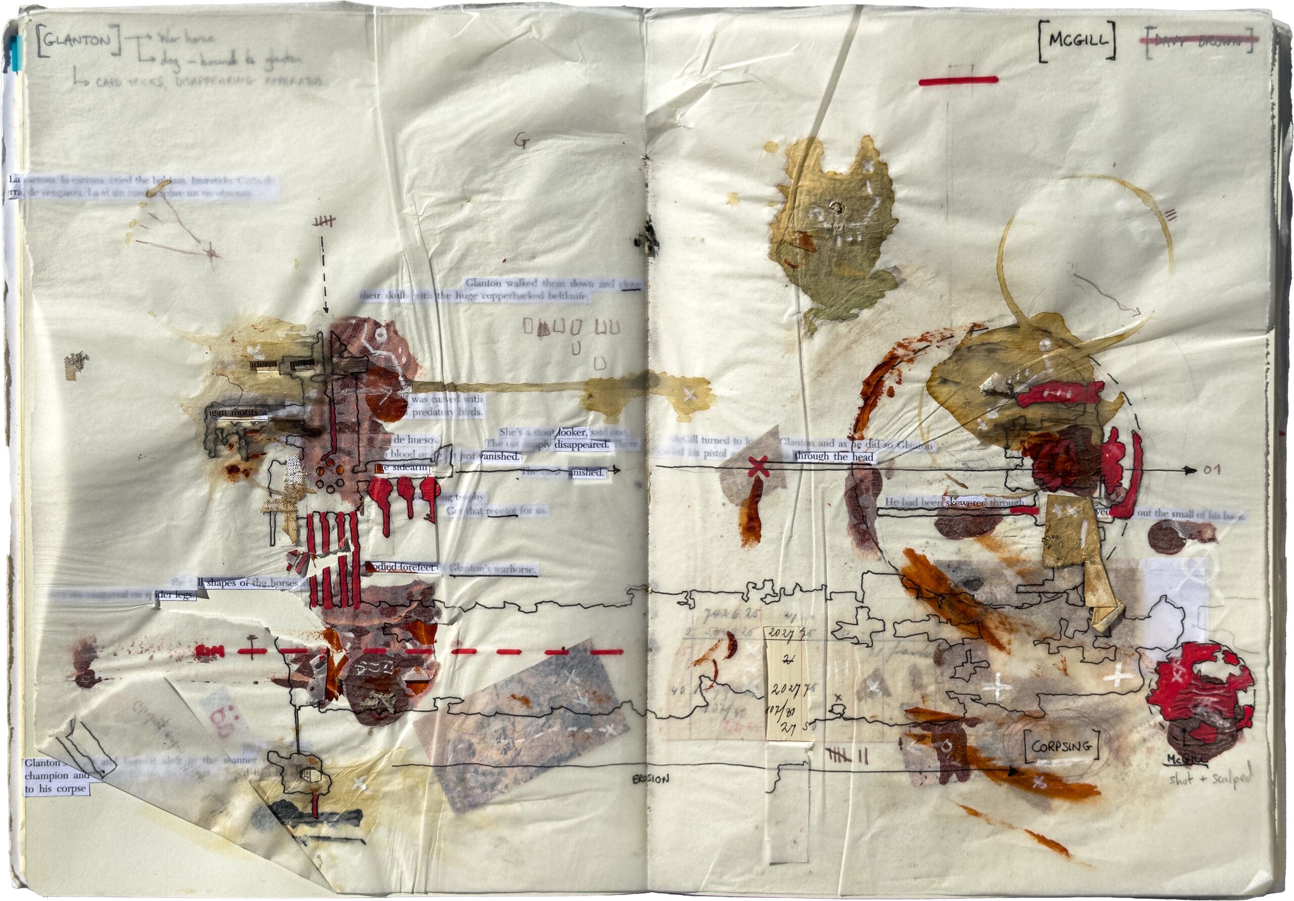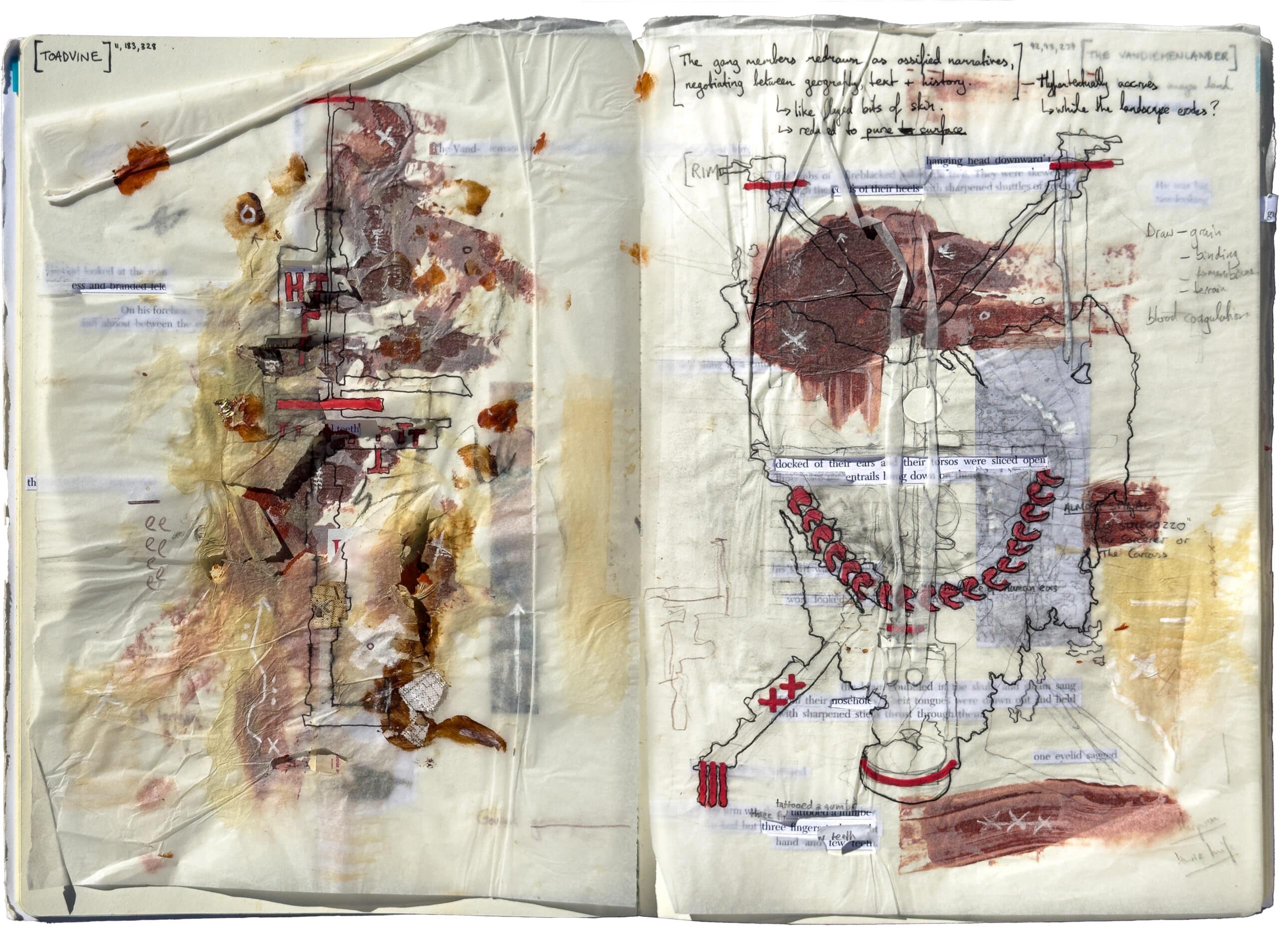 This series of drawings is part of a larger project titled Tracking Blood Meridian, which explores the work of the American writer Cormac McCarthy. The sketchbook pages are developed as studies for landscape-like death masks that relate to members of the nineteenth-century Glanton gang, on whose exploits McCarthy’s 1985 novel Blood Meridian is based. The drawings are thought of as ‘taphonomic’, a term coined by the Soviet palaeontologist and science-fiction author Ivan Efremov to describe the process of fossilisation by which organic matter decays and transitions from the biosphere to the lithosphere. They develop as dense material strata, interleaving and binding excised text from McCarthy’s novel with soil, dust, ash, acrylic paint, graphite, ink, coffee and detail paper.