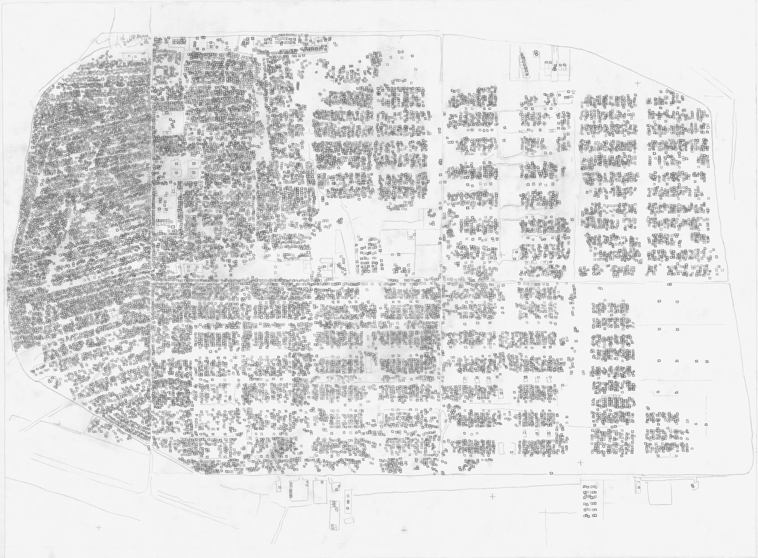 This drawing depicts, from above, the Al-Zaatari Syrian refugee camp in neighbouring Jordan, as of May 2013. Each square drawn is not a symbol: it is a tent. Drawing the camp by hand was important for many reasons: each line looks the way it is from years of individual layered knowledge, where one’s identity is embedded subconsciously into an authentic work, and using two different weighted pencils created a visually pleasing depth.