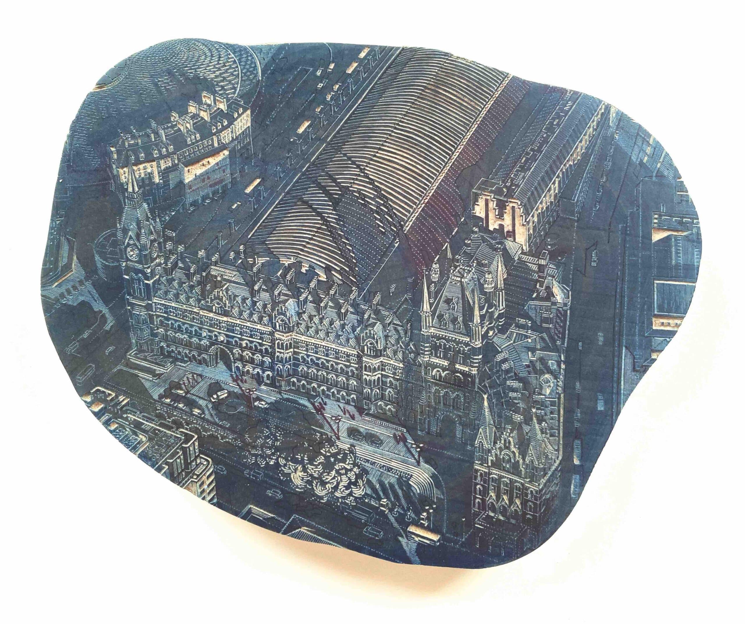 Wood engravings are cut on the cross-grain (aka end-grain) rather than along the plank, so woodgrain direction plays no part in how an engraving is cut. What is more important is that the tree’s rings are tightly and evenly spaced (from a slow-growing tree such as boxwood) and that the wood is receptive to intricate, precise cutting. On the ideal block, the artist can cut easily and crisply in any direction on its smooth surface, like a skater creating perfect loops on a frozen lake. It’s an excellent medium for detailed architectural imagery.