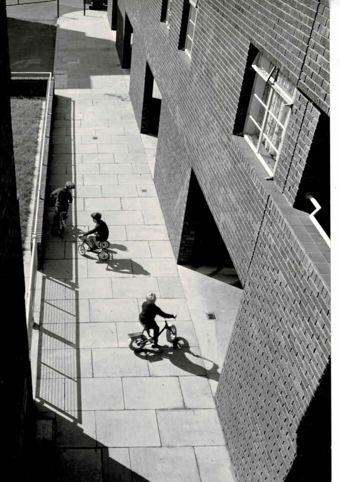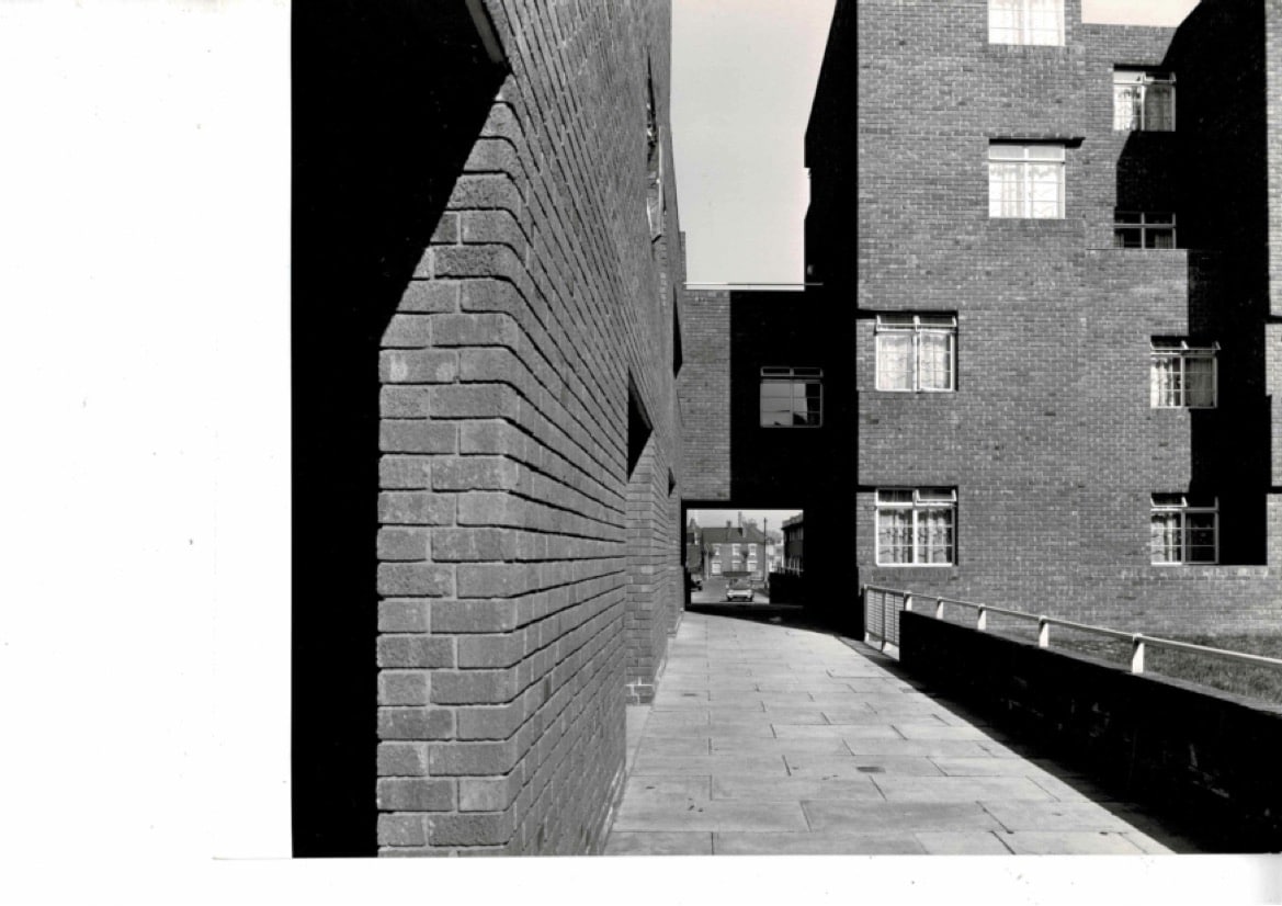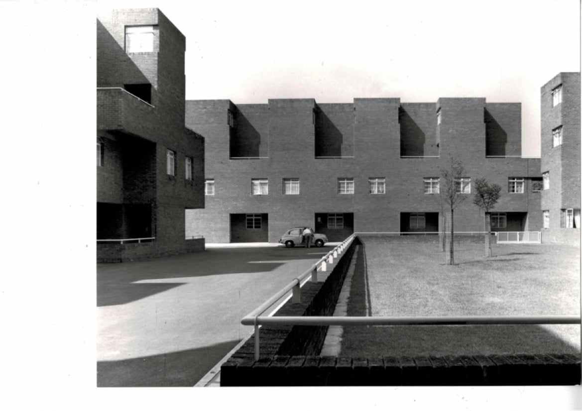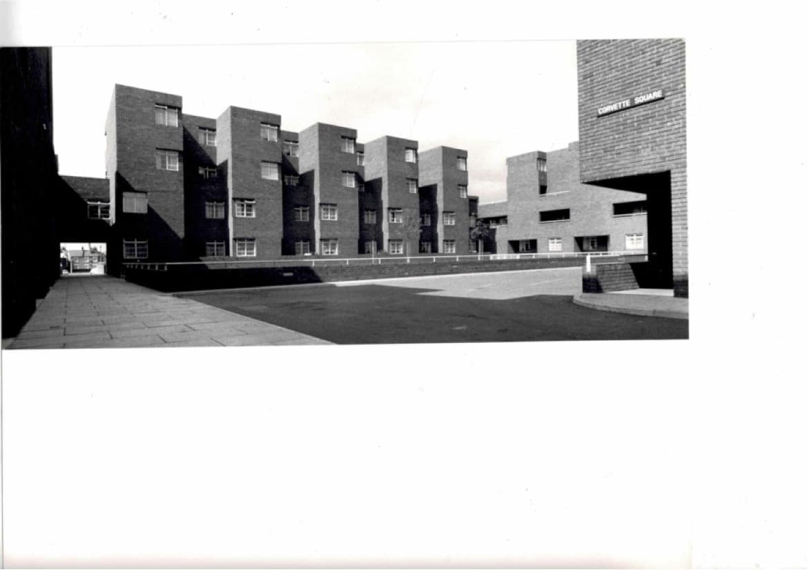 The estate consists of four linked blocks, which create a quiet quadrangle, Corvette Square at the centre. The severe massing of dark red brickwork, recessed balconies and corner windows, were in strong contrast to the more utilitarian municipal housing of the time. The sculptural massing and composition have a conceptual connection with the work of the Dutch early modernist masters, J. J. P. Oud and Dudok.[2] The sparse windows and doors on the main elevations were employed to avoid the endless repetitive ‘front door and toilet’ windows common in deck-access social housing of the time.