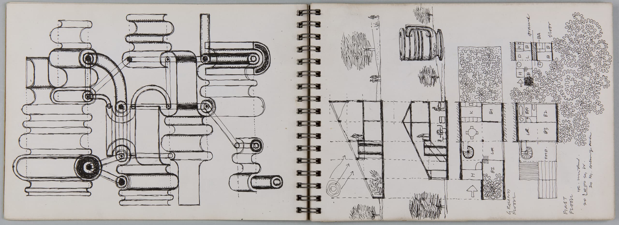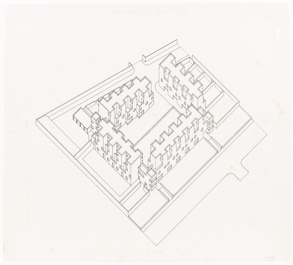 Designed by James Gowan after his acrimonious split with James Stirling, this housing scheme, ‘within cannonball range of Wren’s hospital’ and the Queen’s House, is now disfigured by oversailing pitched roofs, which were installed by Greenwich Council in the 1990s.[1] When first built, its bold and abstract sculptural form and layout were highly influential among contemporary architects.