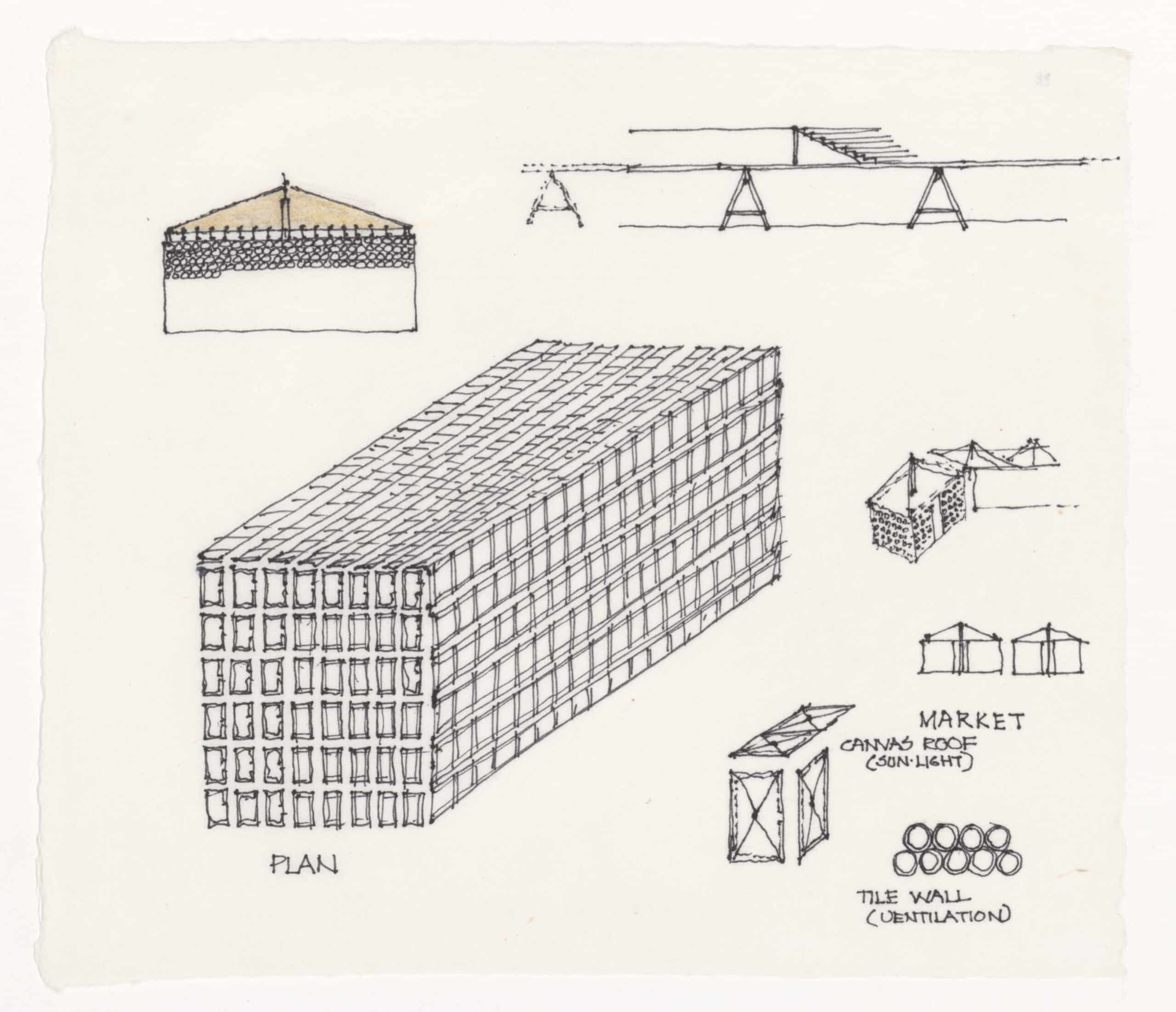 John Hejduk, Market, 1980–2. Black felt tip with yellow pencil on laid paper, 26.9 × 317 mm. John Hejduk fonds, Canadian Centre for Architecture, Montréal, © Estate of John Hejduk. Permission Granted by The Estate of John Hejduk.