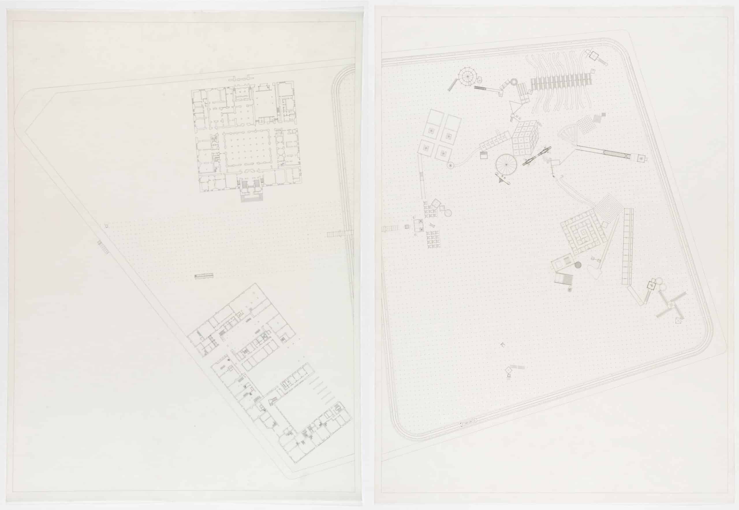 John Hejduk, Site plan for Victims 1, 1984. Ink on tracing paper, 1370 × 985 mm (each). John Hejduk fonds, Canadian Centre for Architecture, Montréal, © CCA.