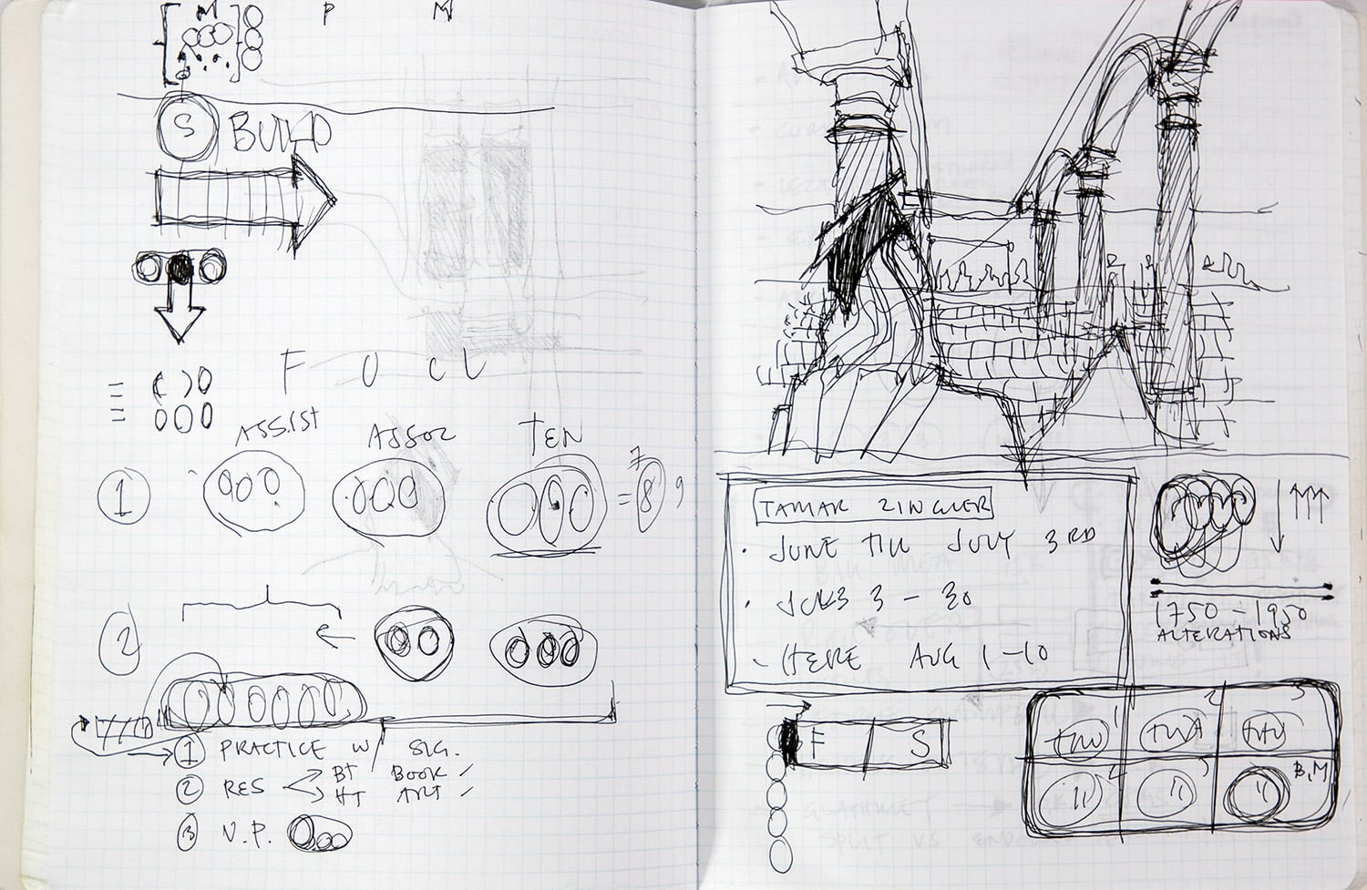 Thanks, Count me in – BUT – you’ll want to read this email to decide if my acceptance is within the spirit of your exhibition. I may be the one person who accepts but claims not to make sketches. At the outset, it’s all semantics: I only make drawings and illustrations, not sketches. Even in the most improvisational mode, I make my hand slow down and execute a line as if either A) like a koh-in-nor pen in hand being moved across a mayline or B) clicking / snapping a line in place with software. I am interested in expression, but only through precision. In fact, I’ve got such little interest in sketches, I’ve barely got interest in drawing. I’m generally only interested in design, and drawings serve a purpose to illustrate that. That my drawings take on a life of their own is (possibly) merely incidental. It’s like treating food just as fuel, as inhuman as that may seem. But as instinctive as that may be for me (I’ve always operated this way, even in school), I’d be lying if I also didn’t enjoy the clear difference between all the architects in the world who cherish their super-personal moments of inspiration, their ambitions and possibilities embedded in the pregnancies of the sketch. In this, I operate in reactionary mode: “You do this, I do that.” “You are truly human, flesh and blood.” “I am a nothing but a robotic arm with software messages.” The irony: if only considered at the level of design, I am human, an autuer, a seeker of original thought. Since 1990, I’ve only been drawing in Japanese notebooks with a Pentel (Niji Stylist while in Japan). IMG 1196 is from 1990. It concerns periodicity (sonic/sound references) in the Japanese Garden. The last two are more recent, and much more elaborate now.