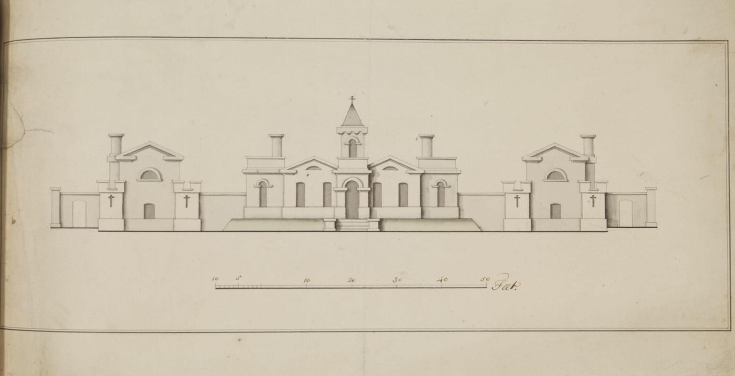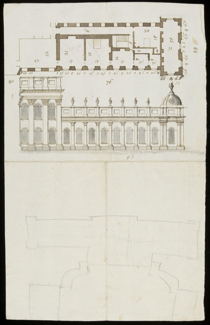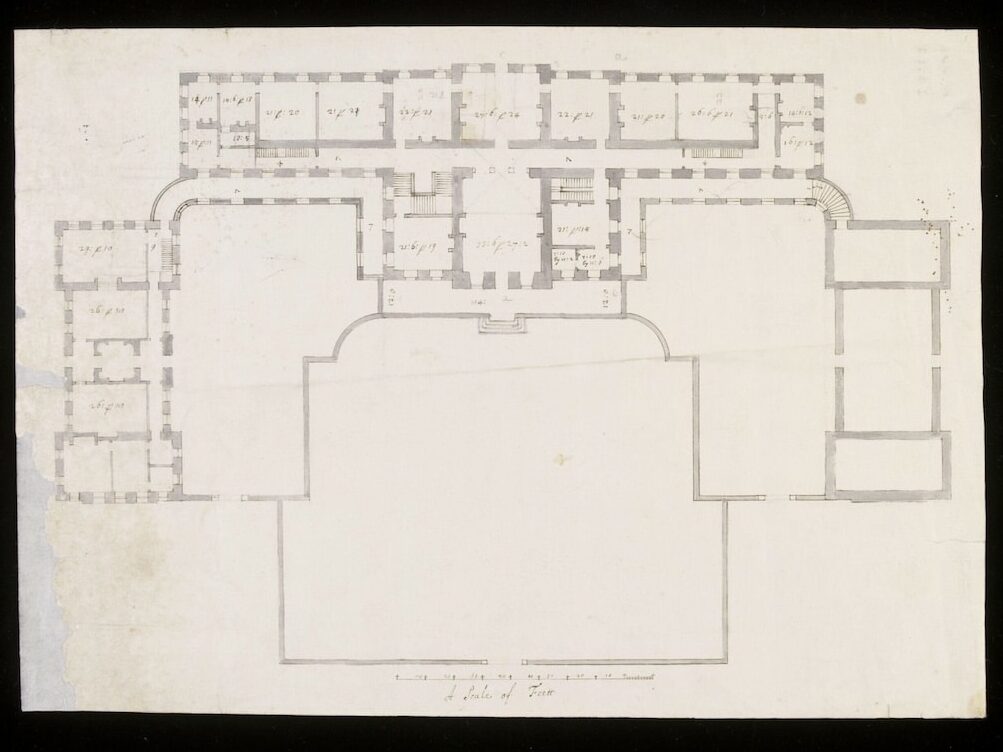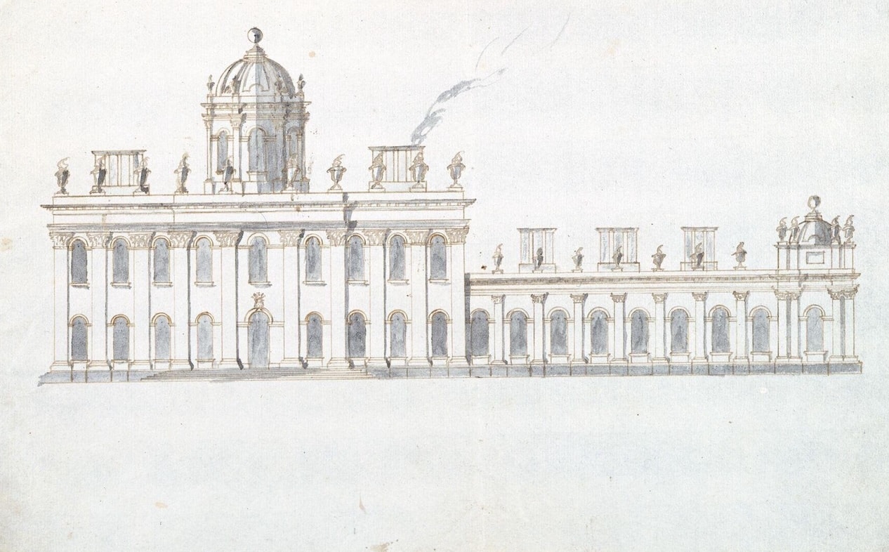 I don’t remember that I had those Design’s your Grace mentions; only the great front which was left to be drawn over again with the Addition of Dorique Pillasters upon the two Circular Corridores, and the two Pavillions with the round Caps that join to ‘em.[5]