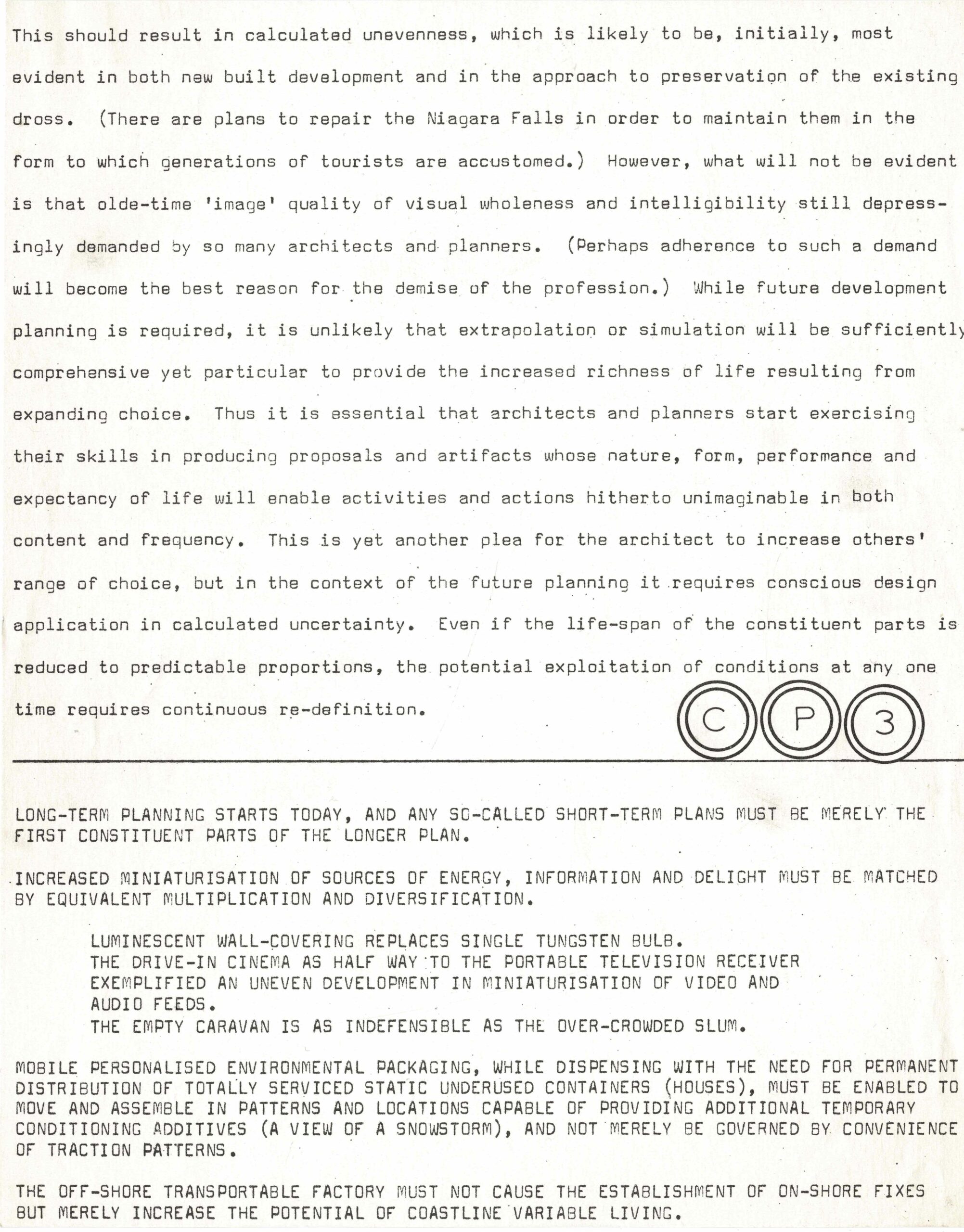 Hearing Cedric Price’s brilliant insight, I felt as if I could hear another melody, one that had not yet been written but could point to the future of our research. Cedric Price’s intuition—which emphasised qualities that went beyond the formal and functional aspects of architecture—opened up a historically new path towards an architecture that was no longer architecture, but could become an environmental system freed from the traditional limits of urban figuration. Our No-Stop City was born precisely from that intuition.