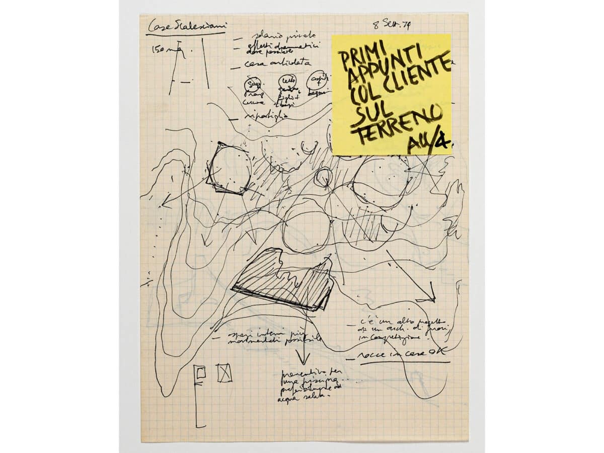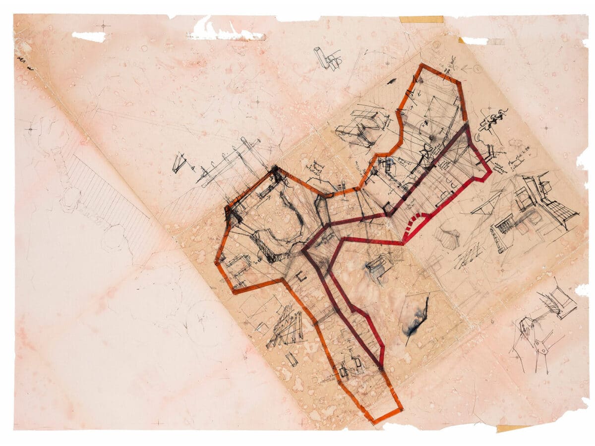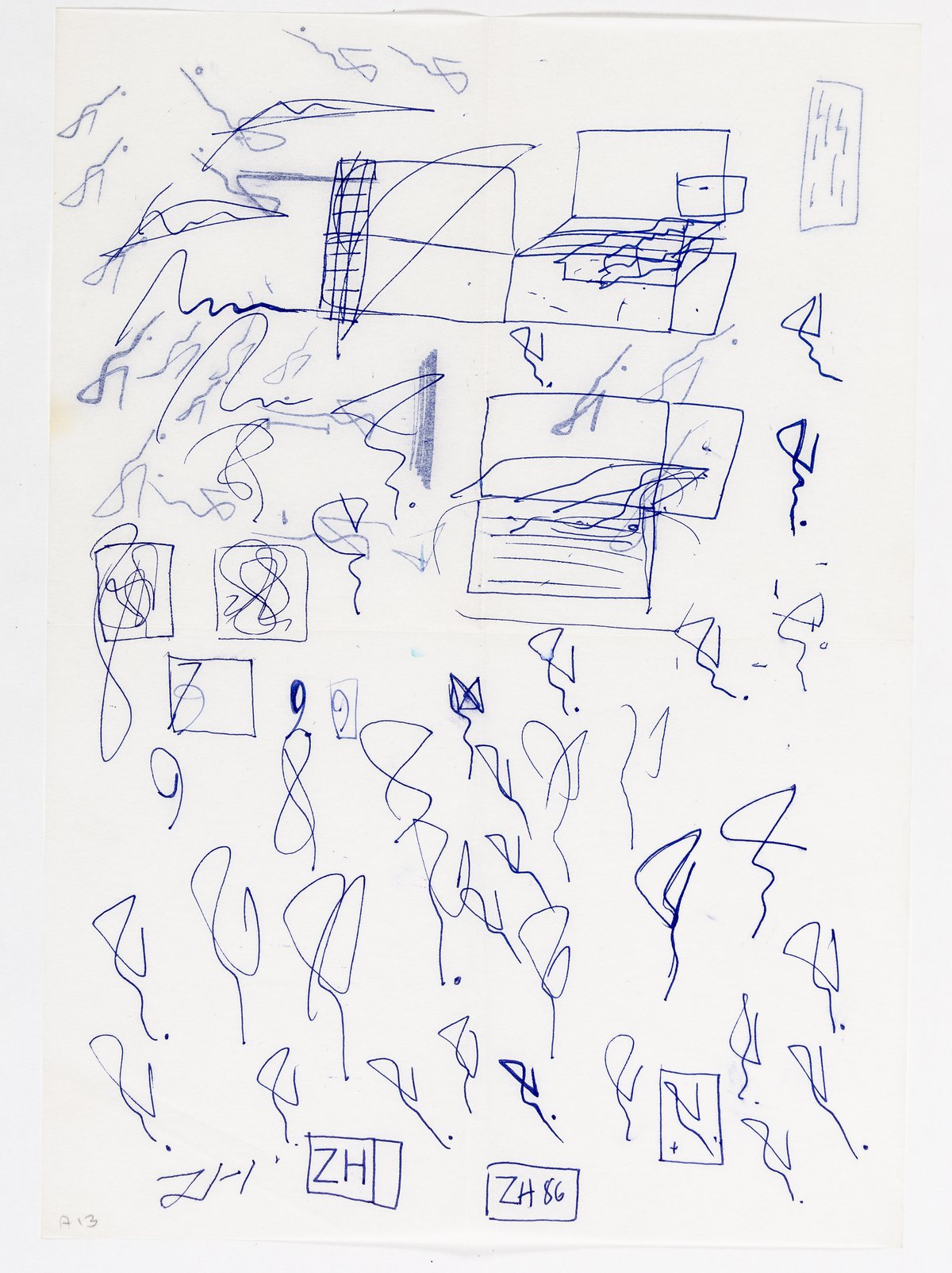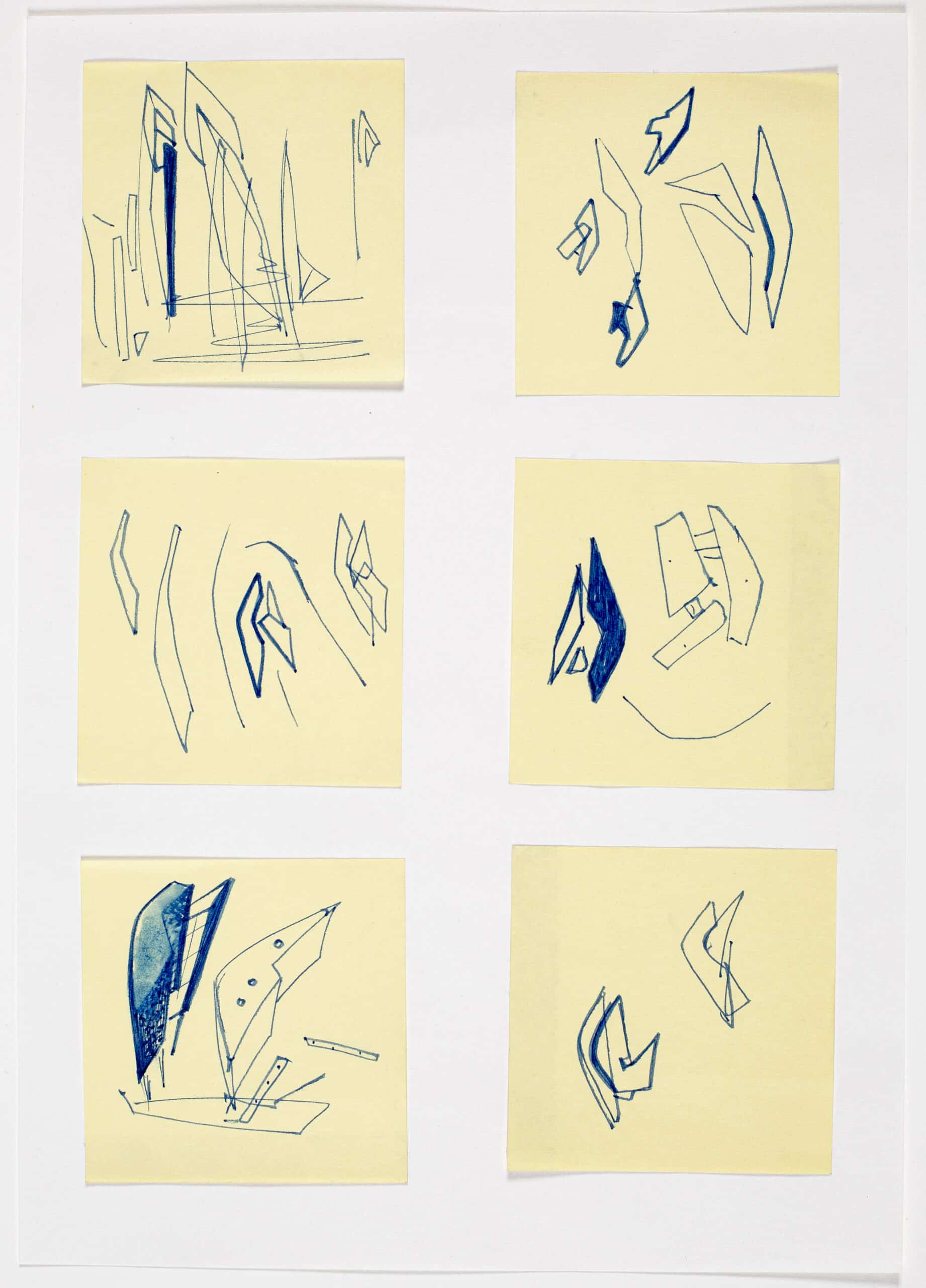 The evolution of the signature into an architectural writing marked a turning point in ZaHaDid’s practice. What began as an inquiry into selfhood soon became an operative instrument capable of generating spatial propositions. She entered a period of fragmentary experimentation in which the line was repeatedly tested, broken apart, and reassembled to form a vocabulary of emerging structures. The drawings from this phase—captured on Post-its, tracing paper scraps, and hastily gathered sheets—record the volatility of this transformation. On these intimate surfaces, the signature compresses, stretches, and tilts, never settling, always searching for spatial consequence.